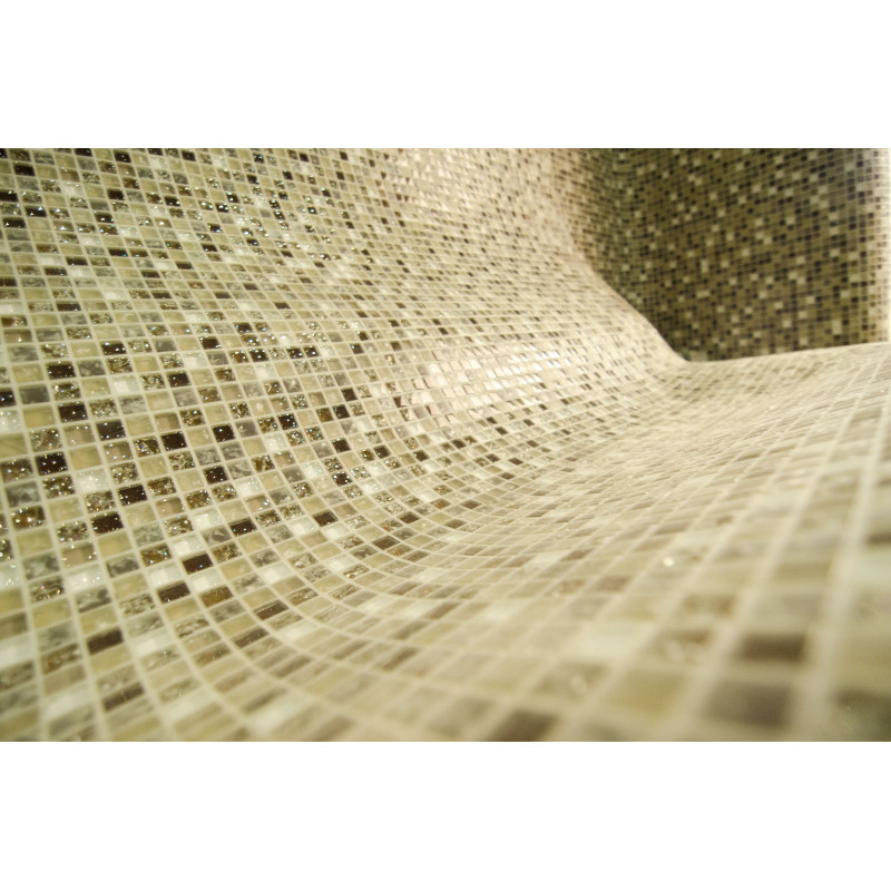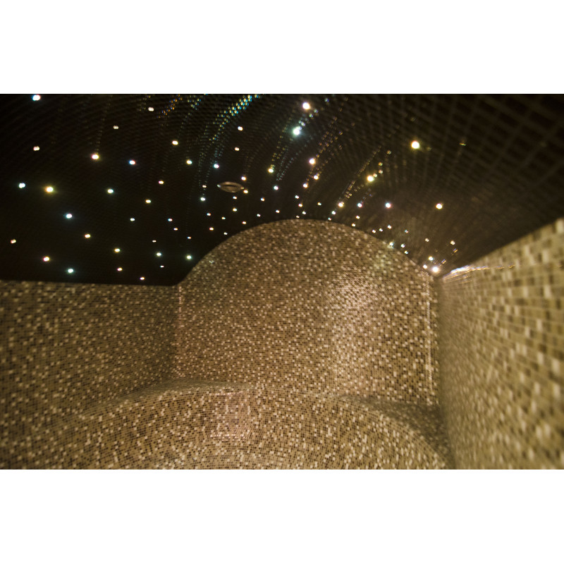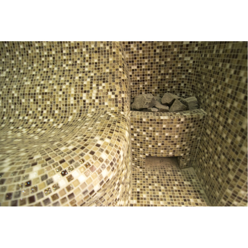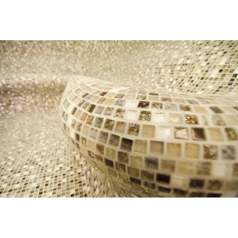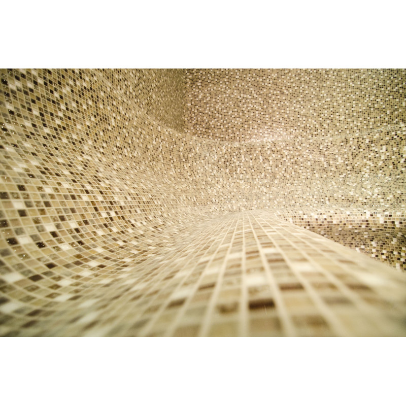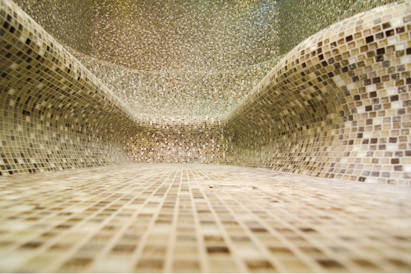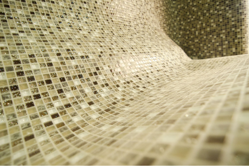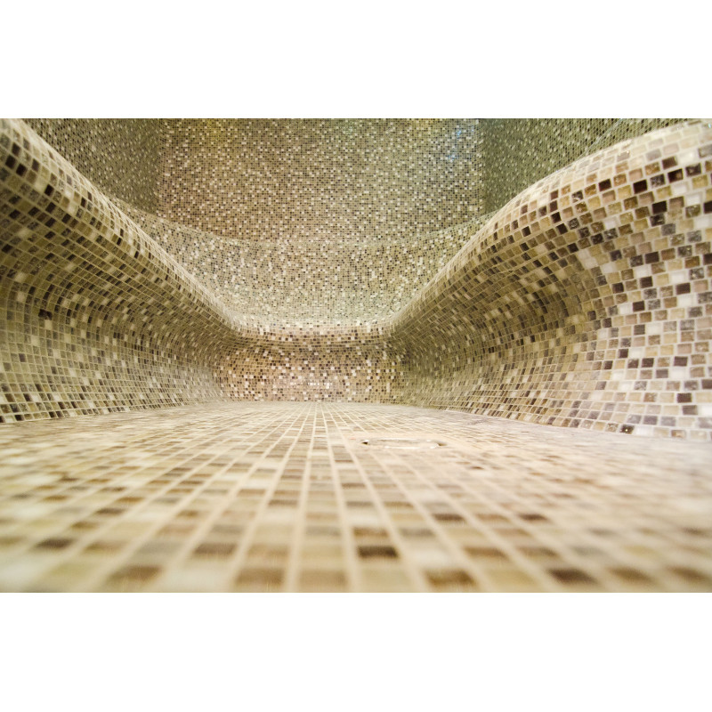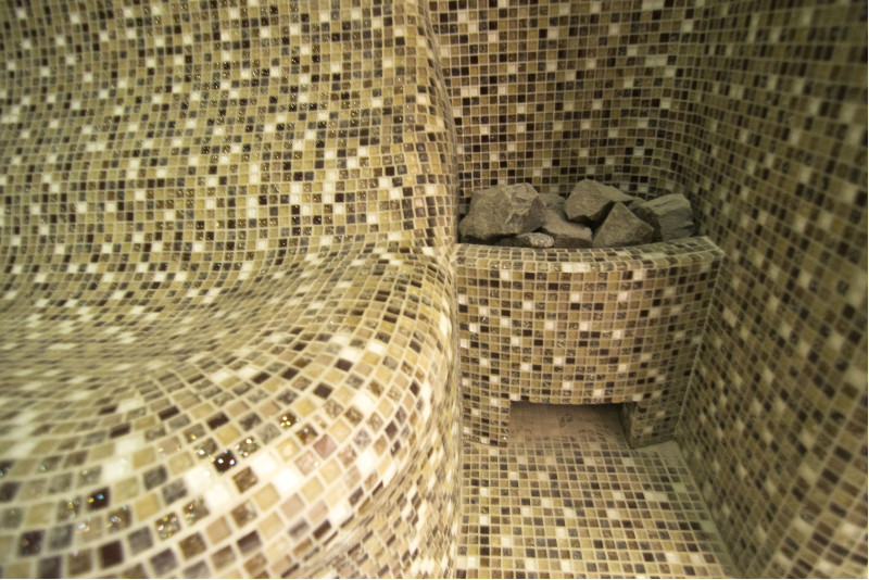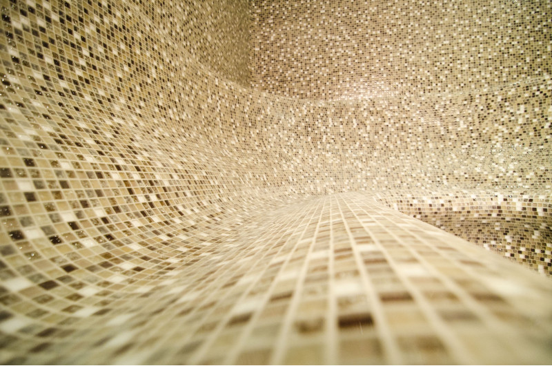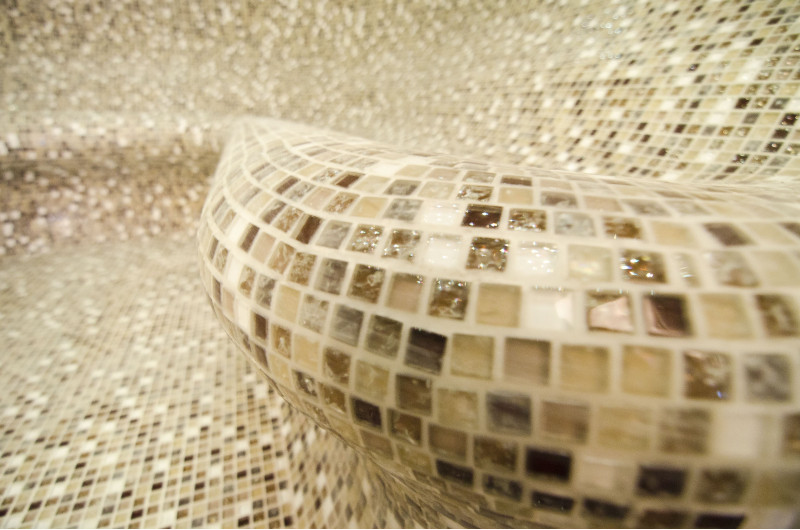 Viimeistely - seinät, penkit, lattiat koristeltu pienellä mosaiikilla, luonnonväriset laatat.