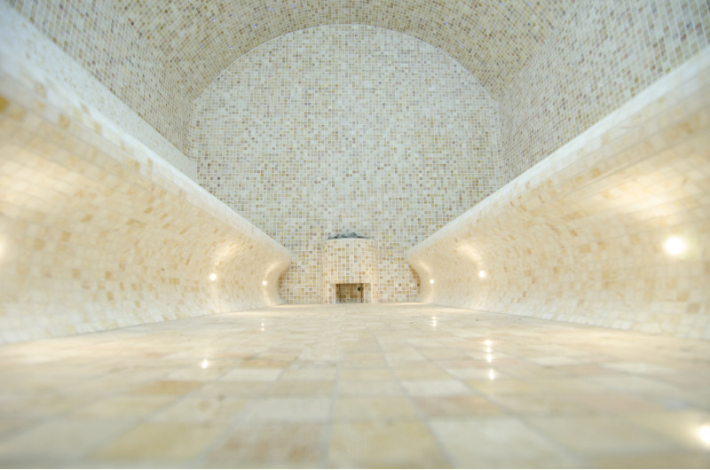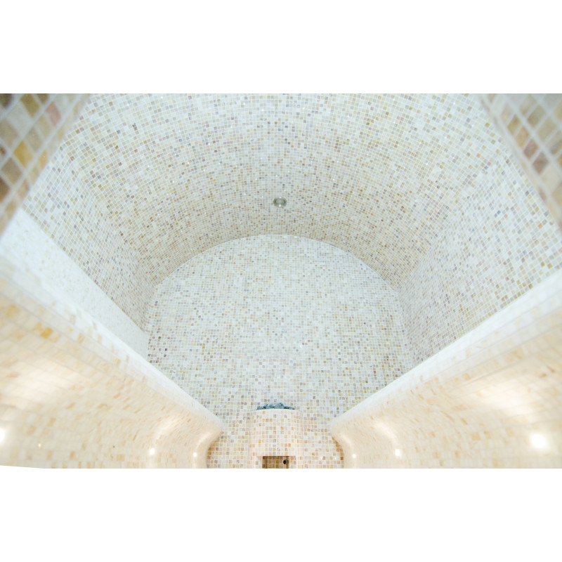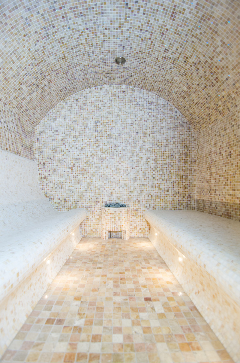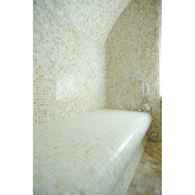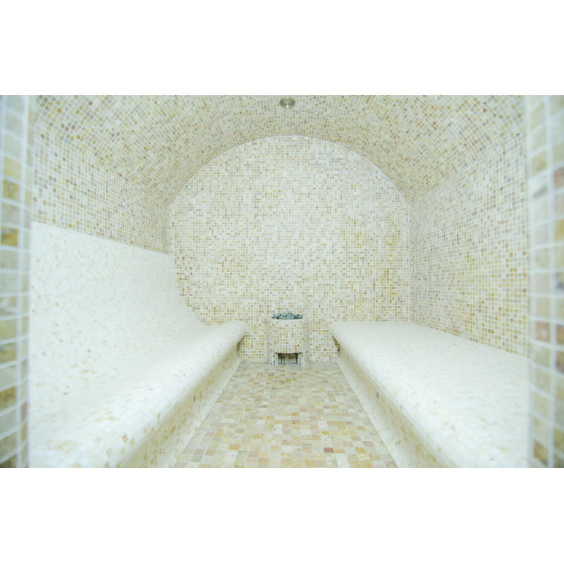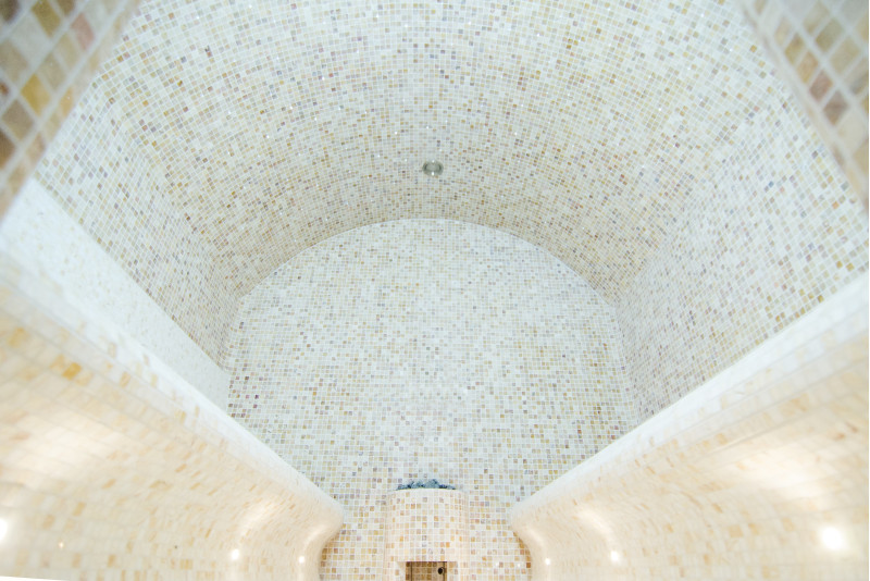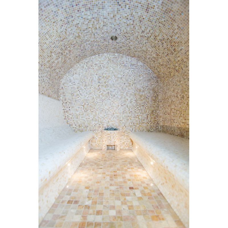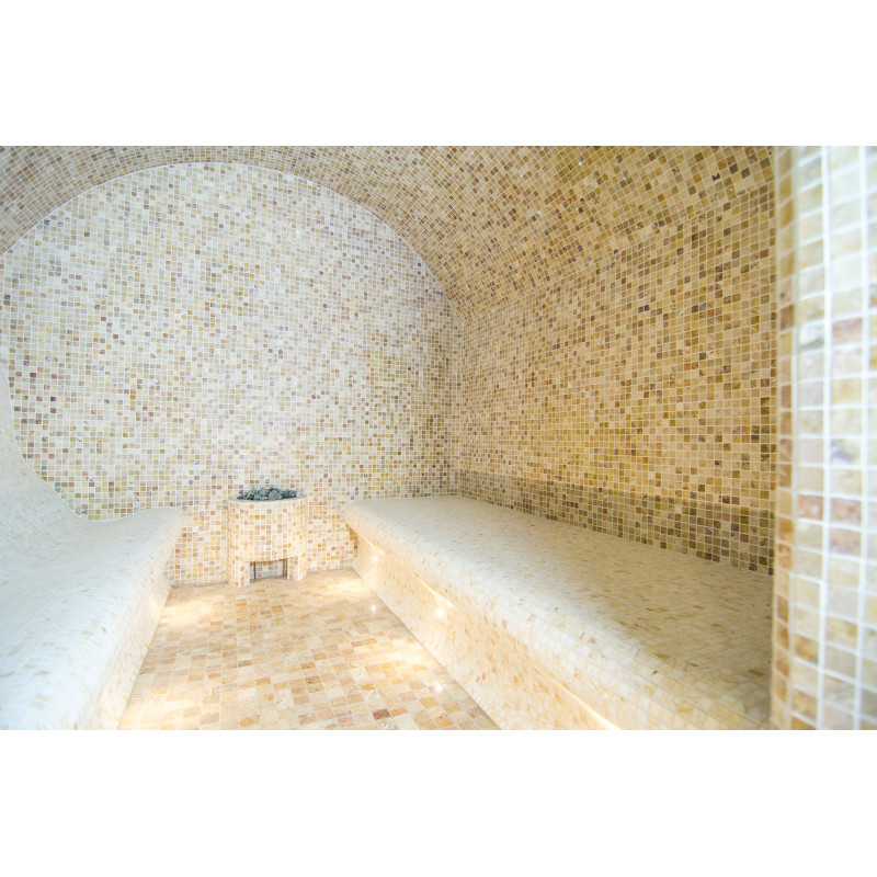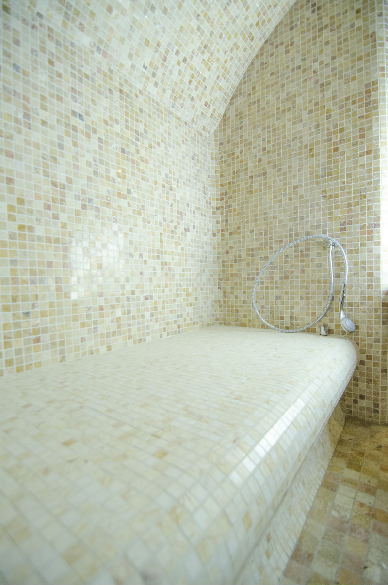 Viimeistely - koko saunahuone ja lauteet on koristeltu mosaiikkilaatoilla.