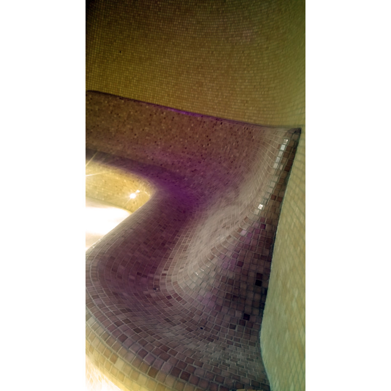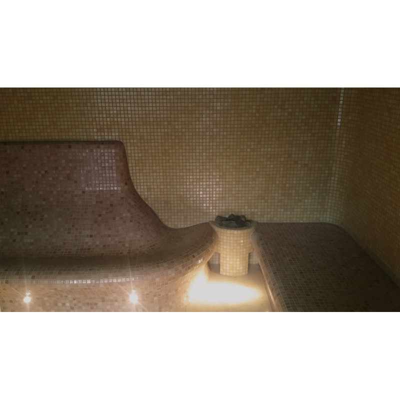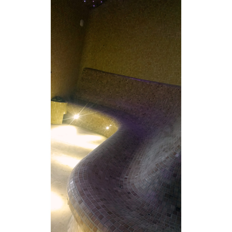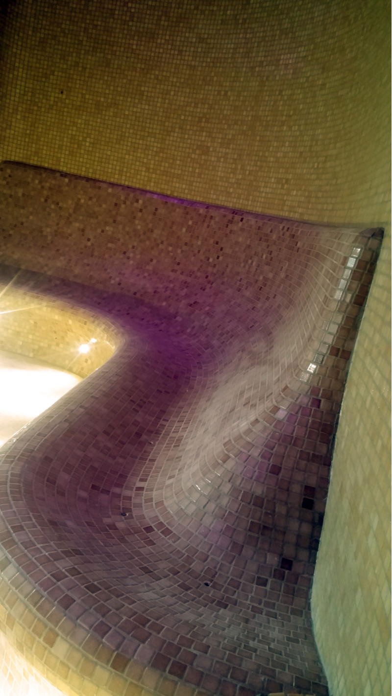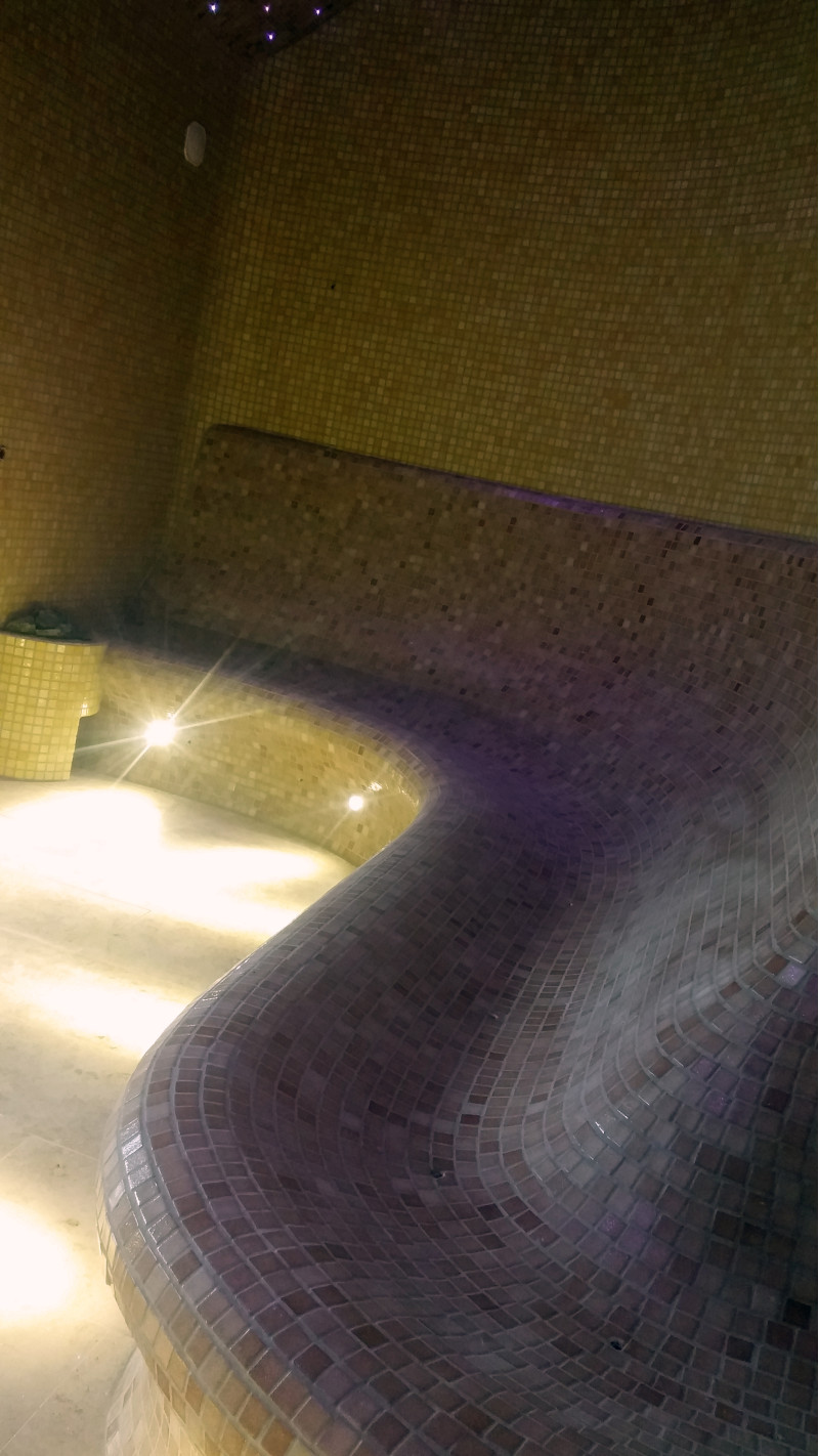 Viimeistely - lattiat, seinät, penkit koristeltu murskatuilla lasimosaiikkilaatoilla.