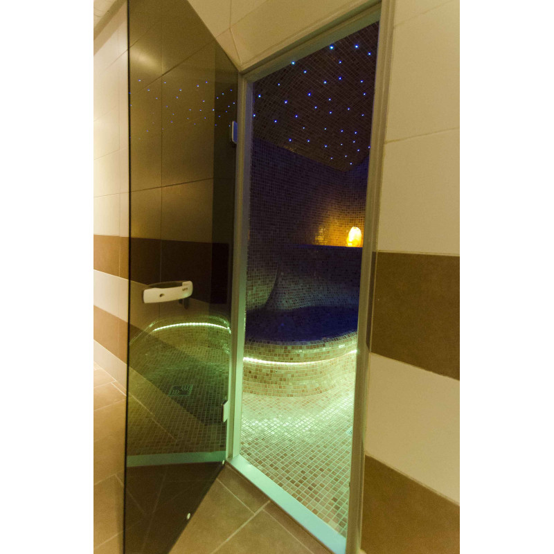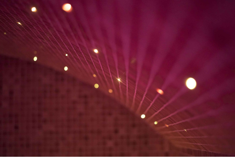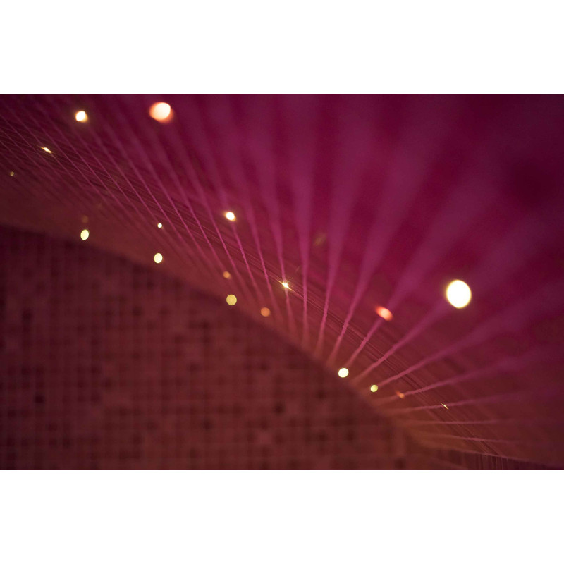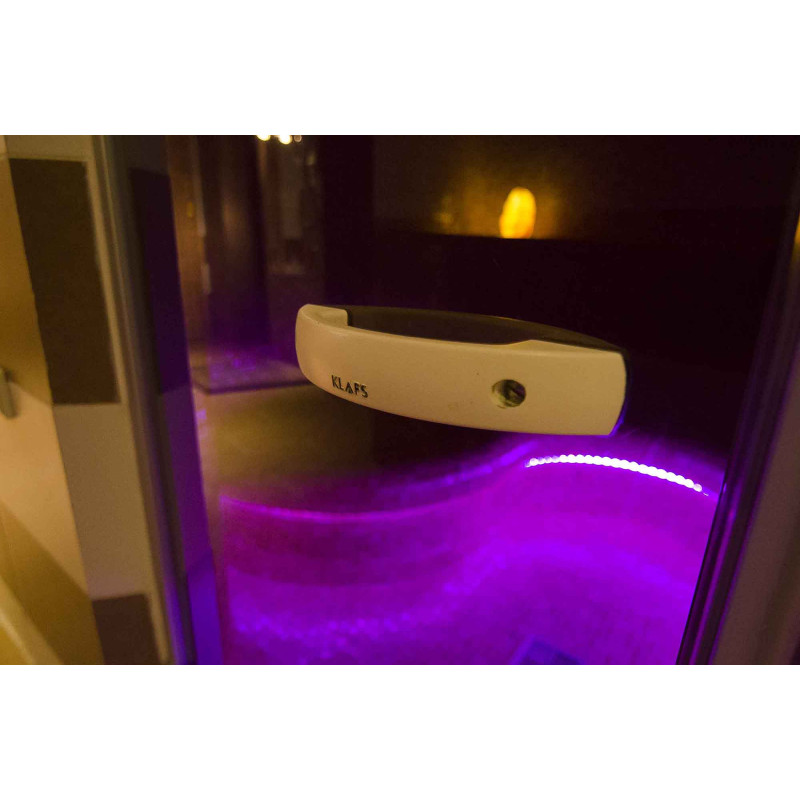 Valaistusjärjestelmä - katto on valaistu kuituoptisella valaistusjärjestelmällä "Starry Sky". Kuituoptinen valaistus on pitkäikäinen, monipuolinen, taloudellinen ja yksinkertainen ratkaisu. Sen ansiosta voit poimia vaikuttavimmat valaistusvaihtoehdot. "Tähtitaivas" luo viihtyisän ympäristön ja täydentää täydellisesti saunan lämpenemisen kokemusta. Penkkien alla on värillinen valaistus lattiaa valaisemaan. Värit voidaan vaihtaa.