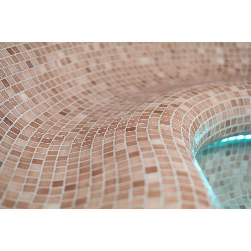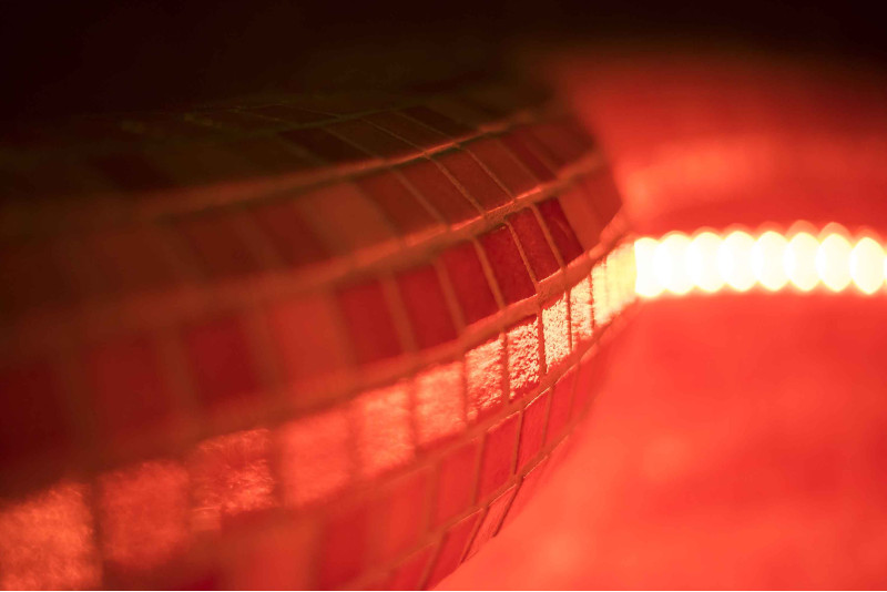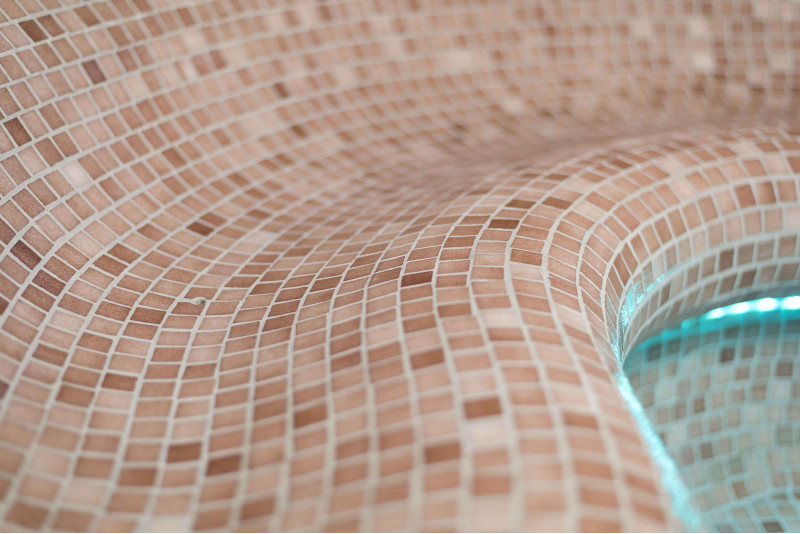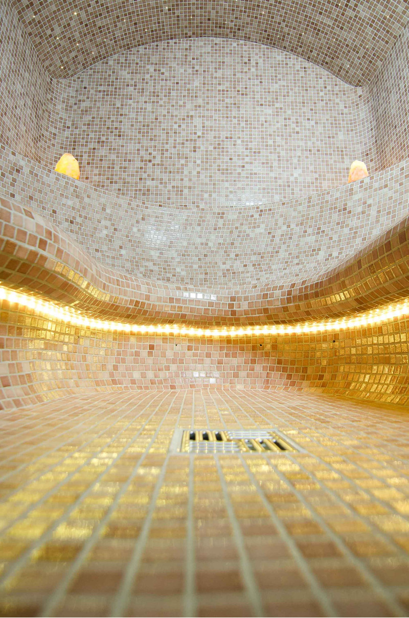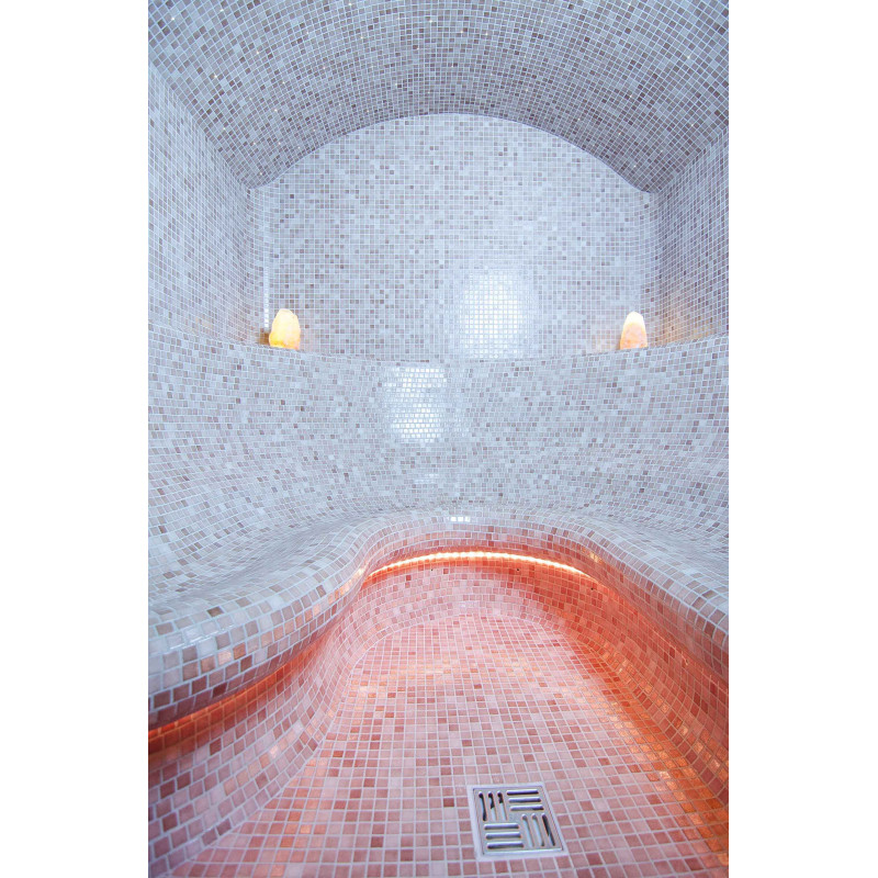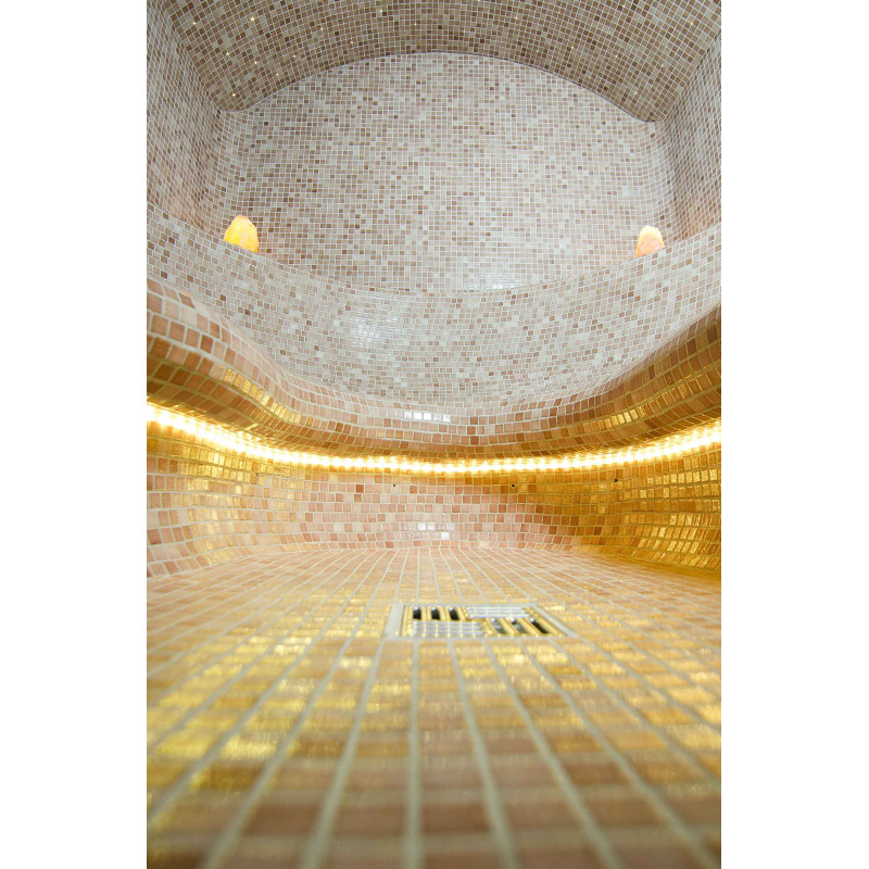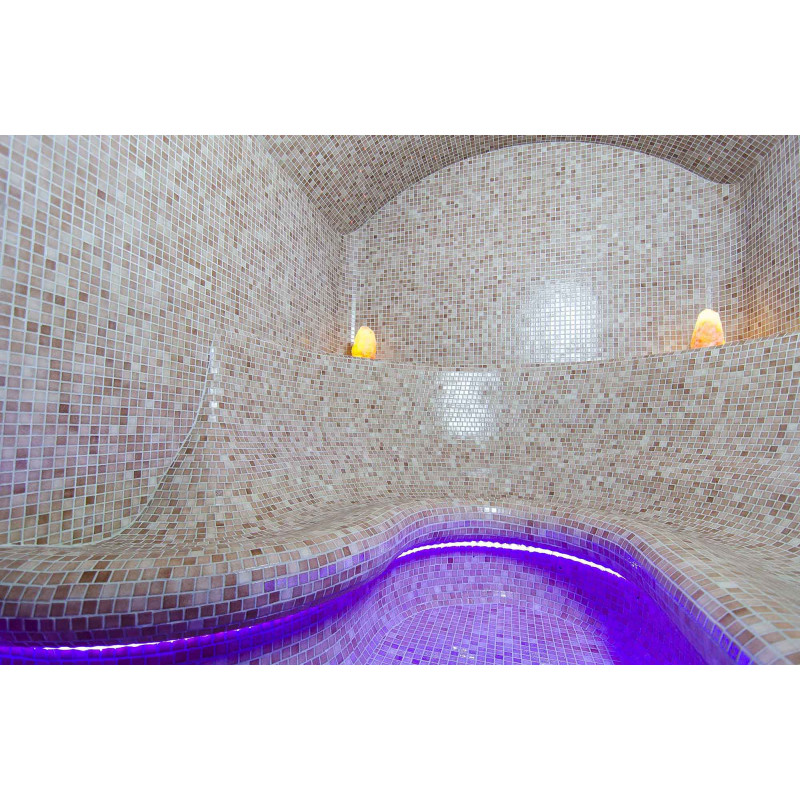 Viimeistely - saunan lattiat, seinät, katot ja lauteet on koristeltu pienillä murskatuilla lasimosaiikkilaatoilla.