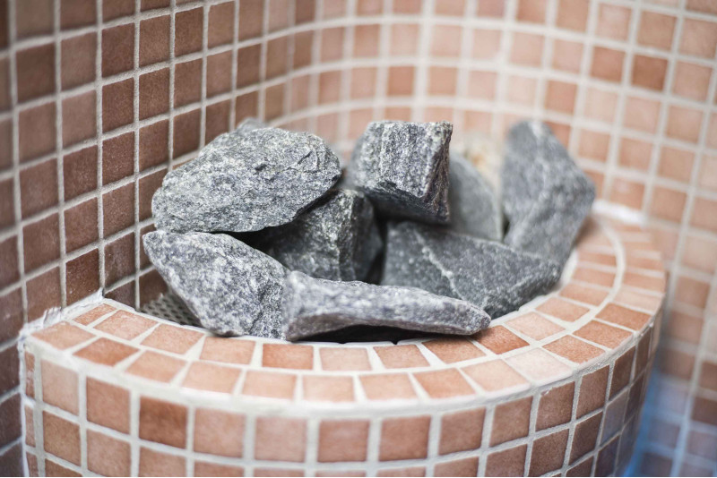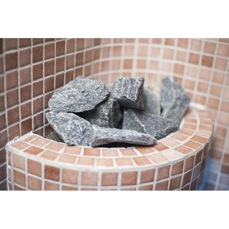 Sauna on varustettu höyrymaljakolla, joka toimii höyrysuojaputkena, jonka kautta höyry pääsee saunaan. Koristeltu oliviinidiabaasikivillä.