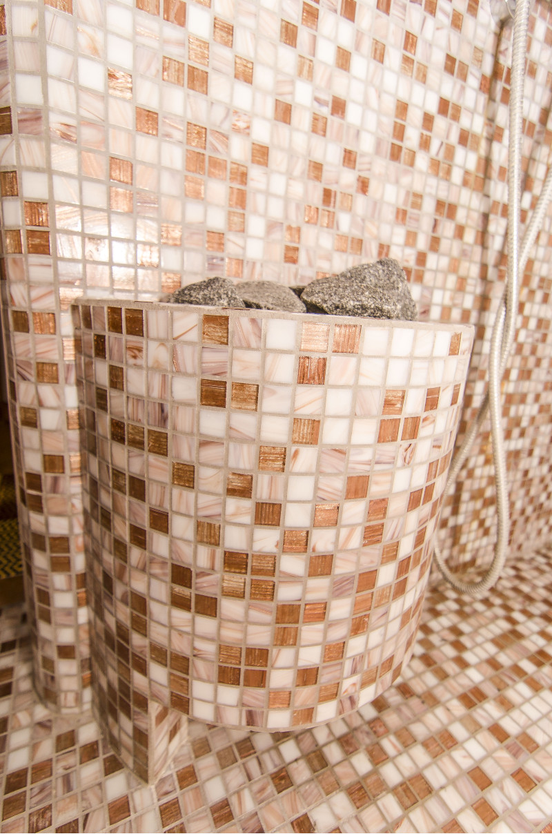 Höyrymaljakko toimii höyrysuojaputkena, jonka kautta höyry pääsee saunaan, koristeltu oliviinidiabaasikivillä.