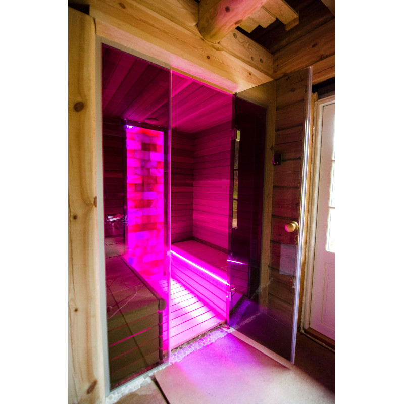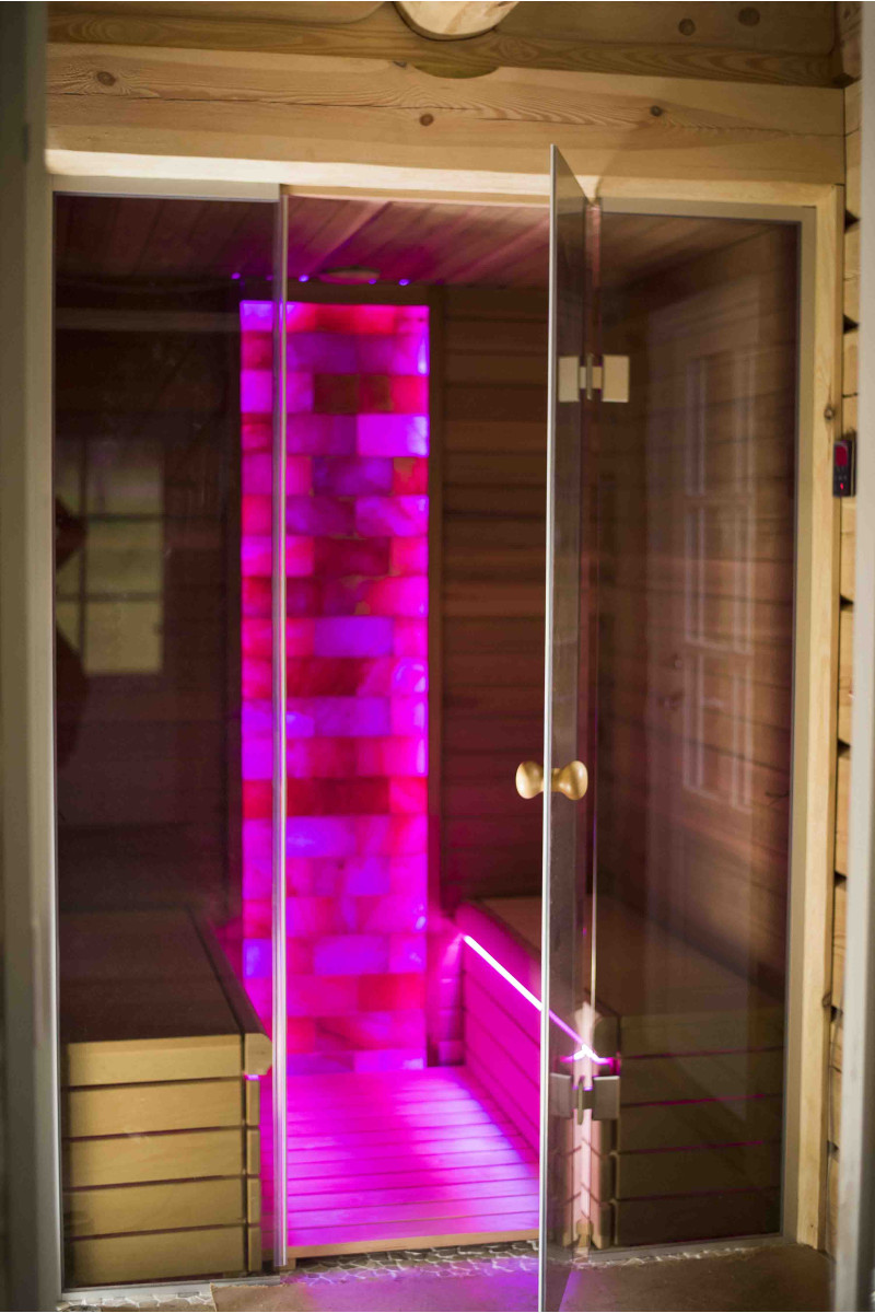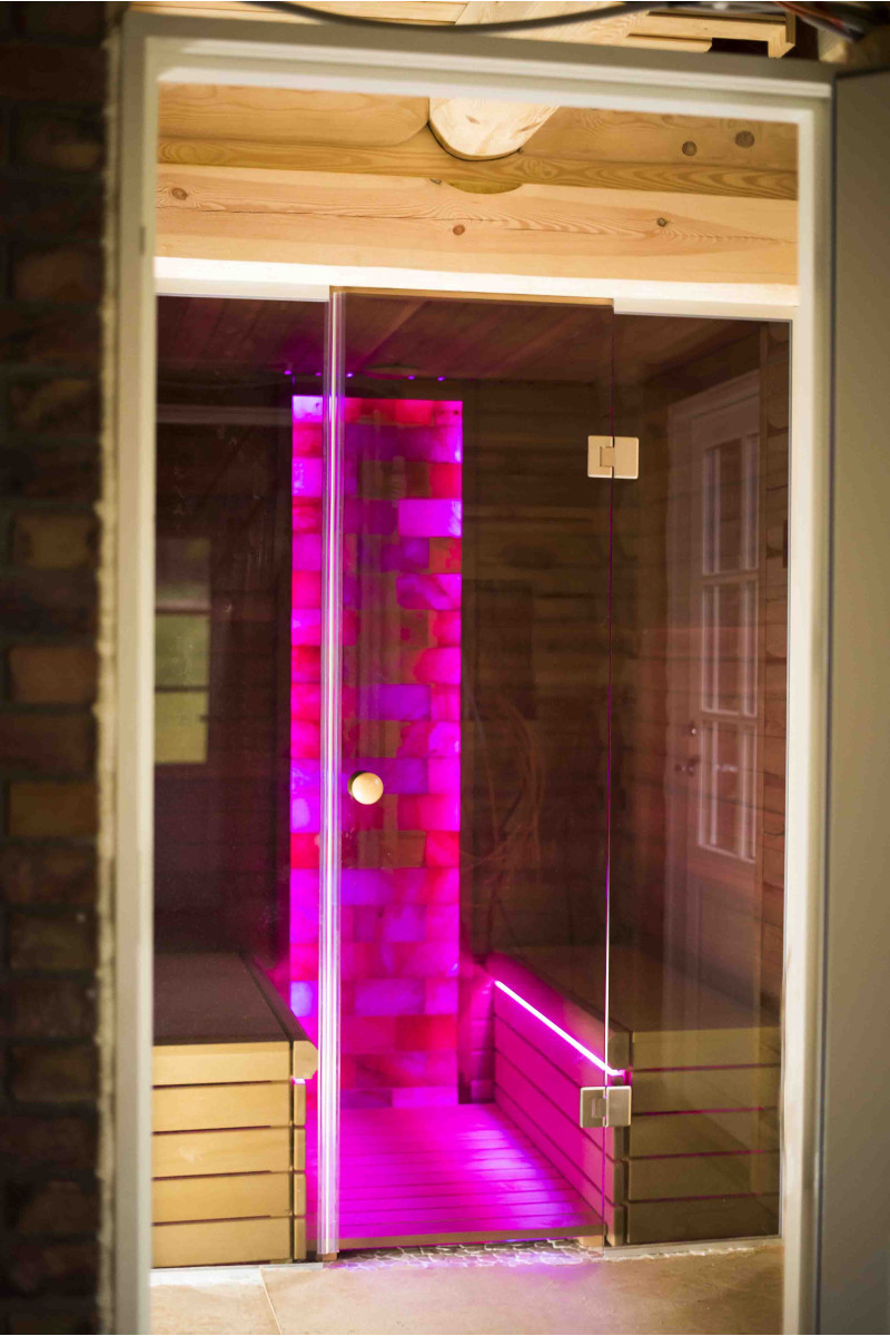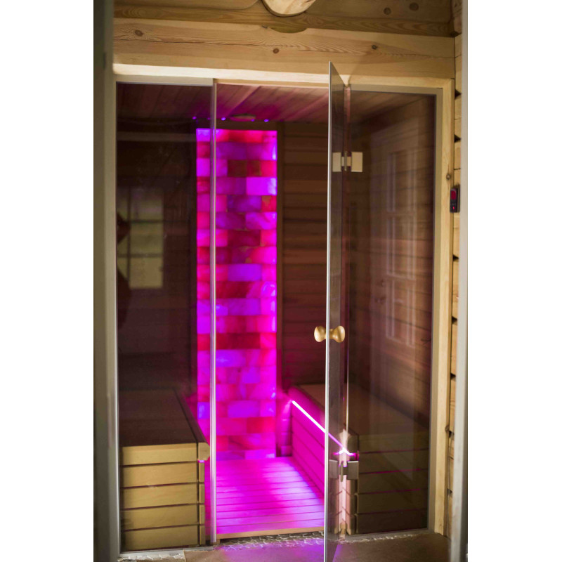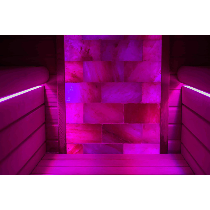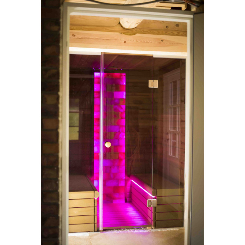 Saunan sisustukseen valittu Himalajan suolatiiliseinä sisäänrakennetulla värillisellä RGB-valaistuksella, jota ohjataan langattomalla värinvaihtajalla, luo viihtyisän ympäristön ja vahvistaa saunan tunnelmaa entisestään.