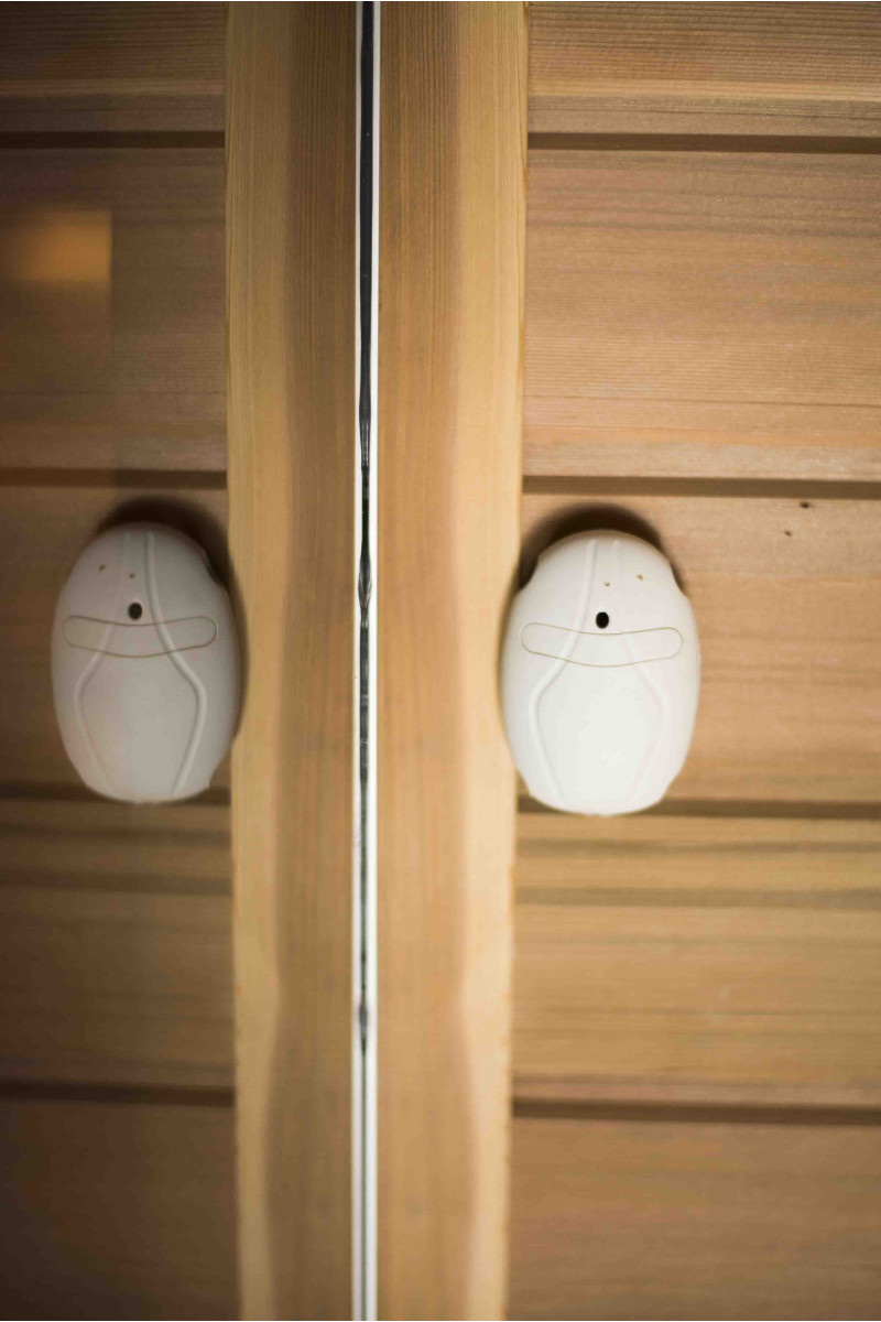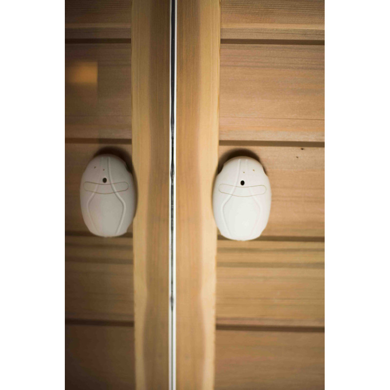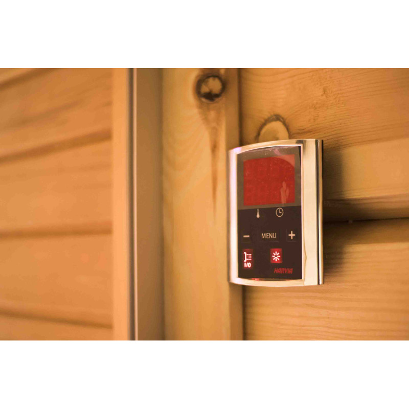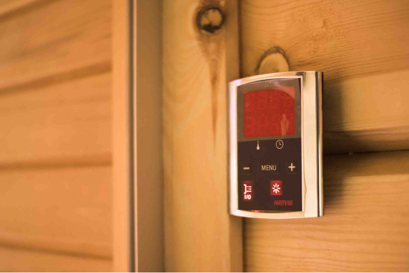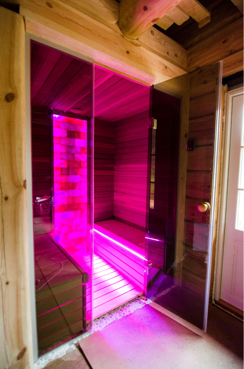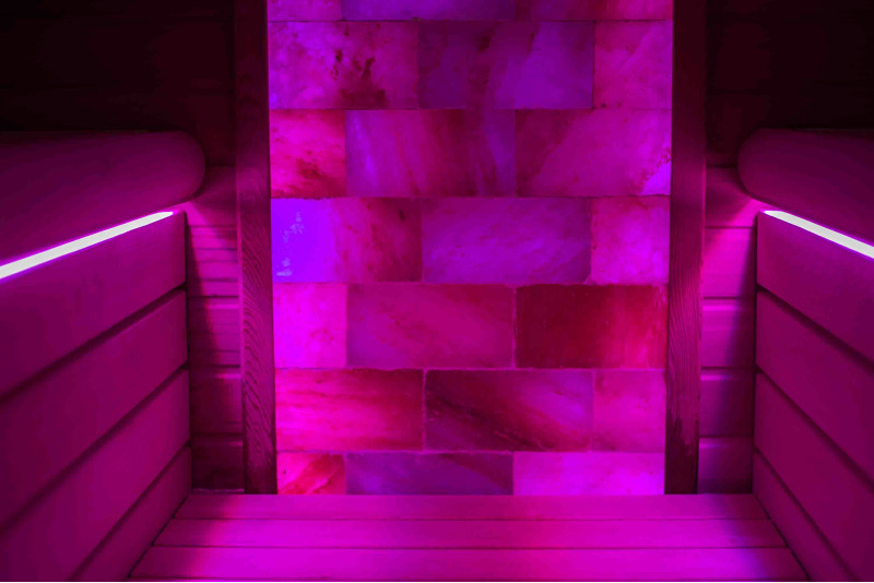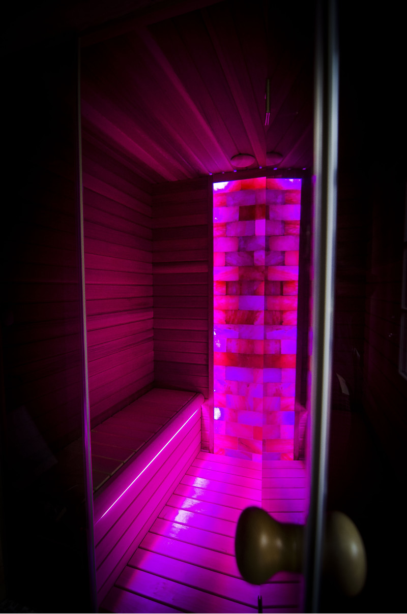Saunan sisustukseen valittu Himalajan suolatiiliseinä sisäänrakennetulla värillisellä RGB-valaistuksella, jota ohjataan langattomalla värinvaihtajalla, luo viihtyisän ympäristön ja vahvistaa saunan tunnelmaa entisestään.