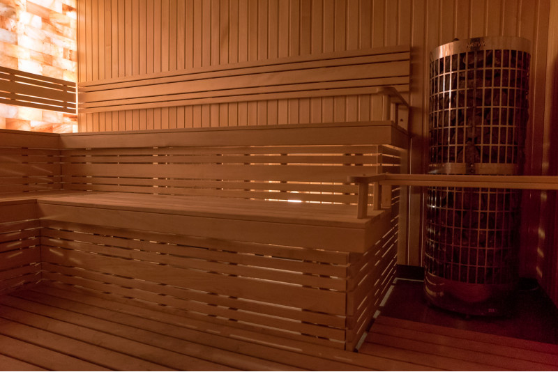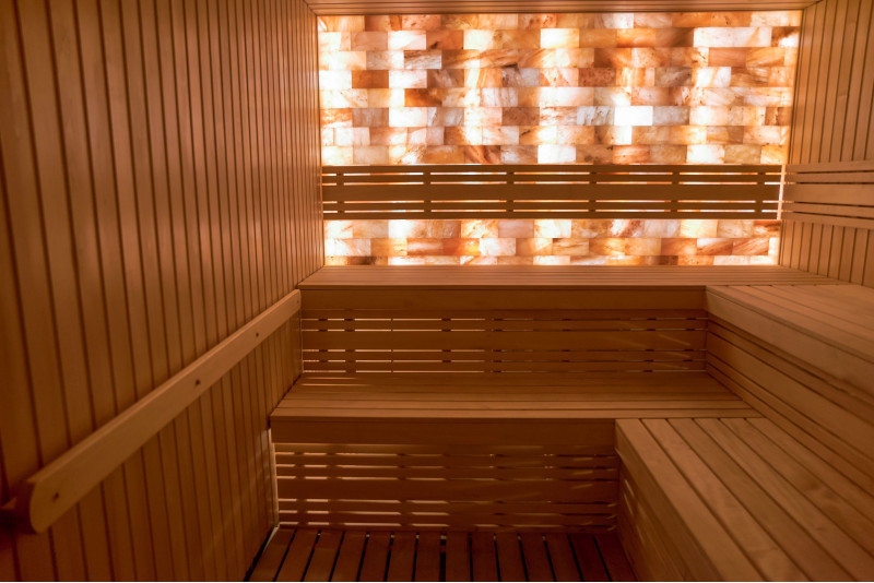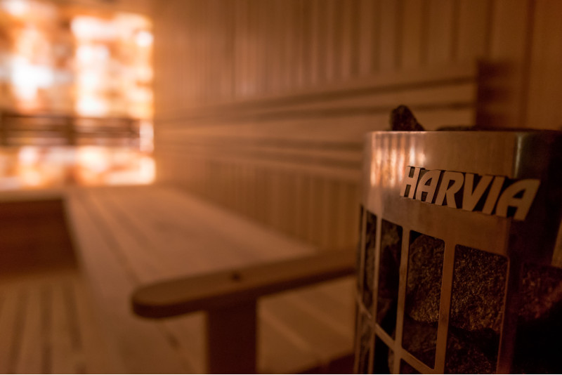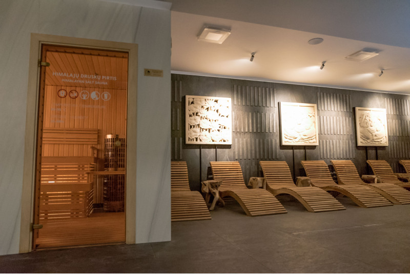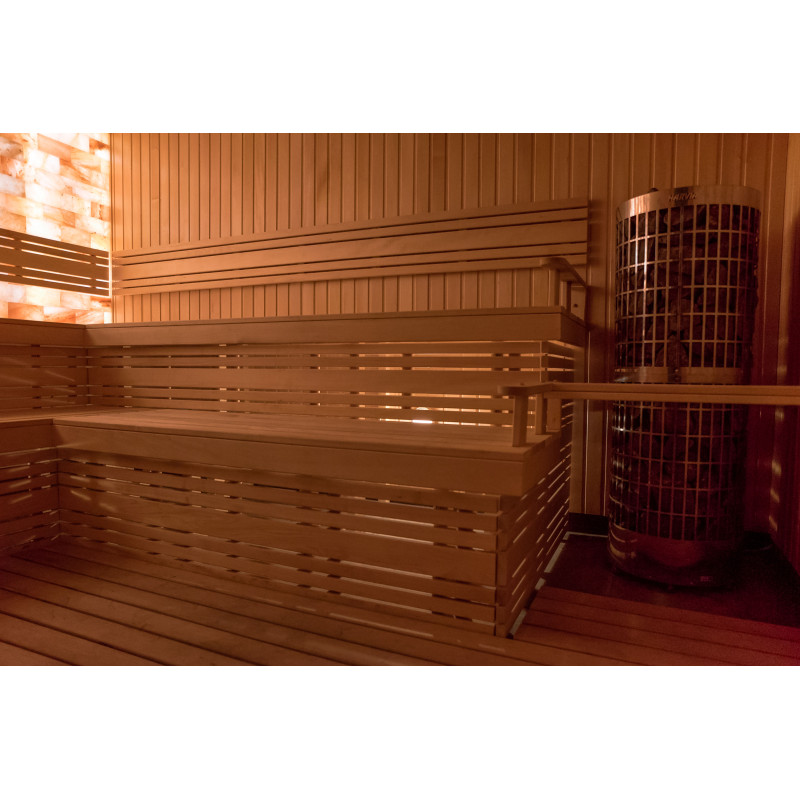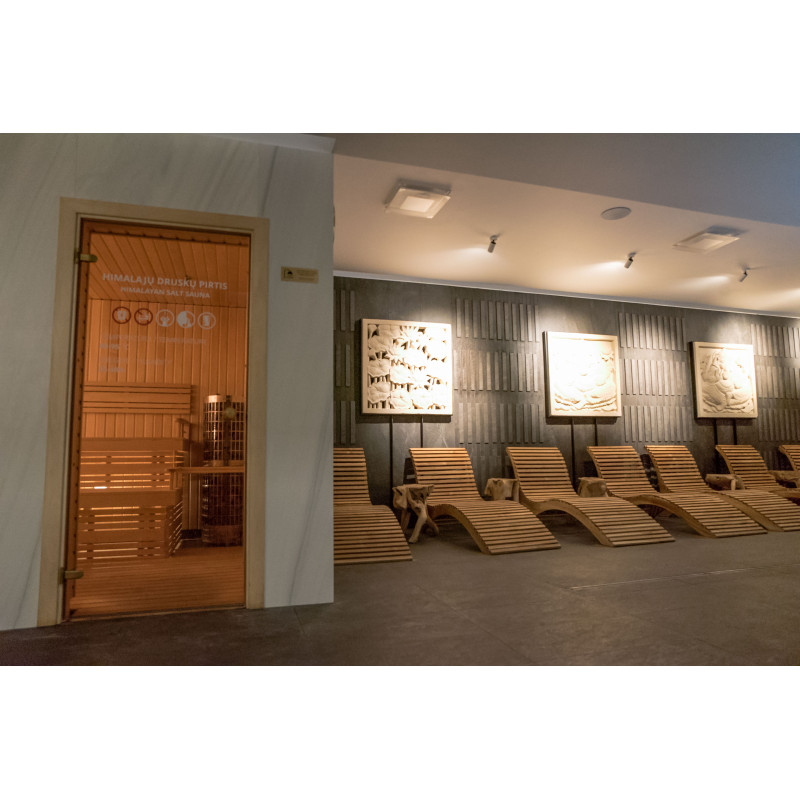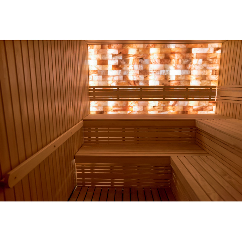 Saunan pääkohokohta on vaikuttava ja modernin näköinen Himalajan suolatiiliseinä. Tämä seinä ei vain ilahdu ulkonäöllään, antaa saunaan kodikkaan tunnelman, vaan tiedetään myös, että Himalajan suolalla on monia positiivisia ominaisuuksia ihmisten terveydelle. Himalajan suolalla on positiivinen vaikutus allergikoille, keuhkoastmaisille, hermoston sairauksille, vahvistaa immuunijärjestelmää, kohottaa mielialaa ja antaa energiaa. Himalajan suola neutraloi sähkömagneettista säteilyä vähentäen staattista sähköä ilmassa. Himalajan suolaseinää vain korostaa ja kaunistaa tiilien alla oleva sisäänrakennettu LED-valaistus.