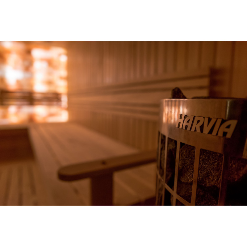 Varusteet - Harvia-kiuas, johon mahtuu erityisen paljon kiviä, joten voit nauttia täyteläisestä ja miellyttävästä höyrystä.