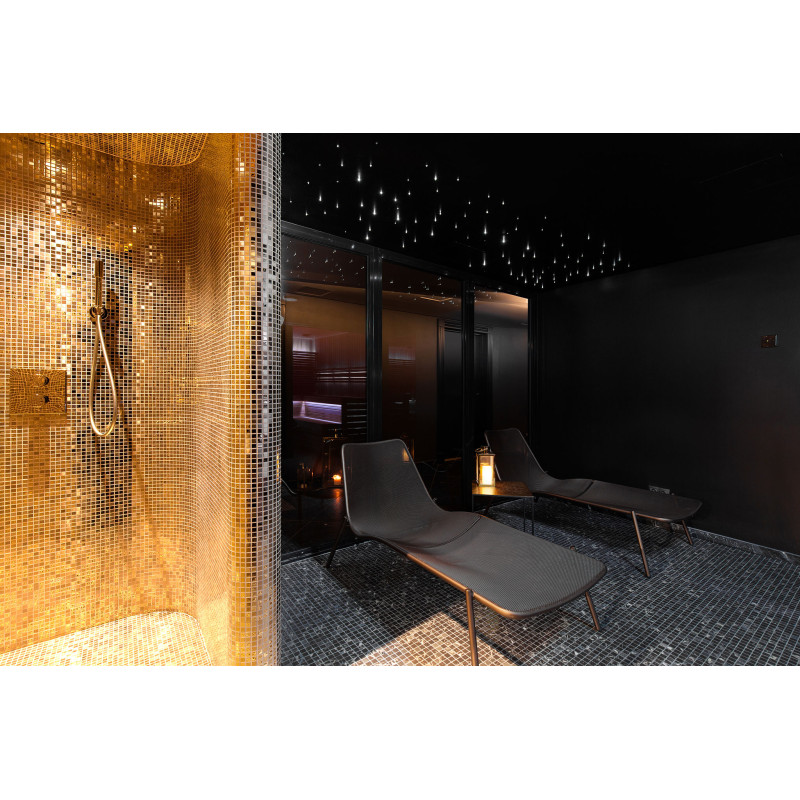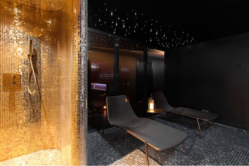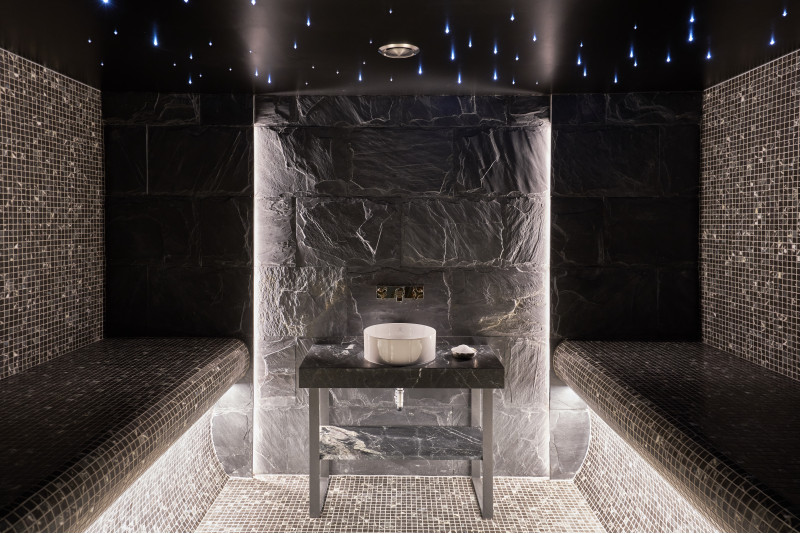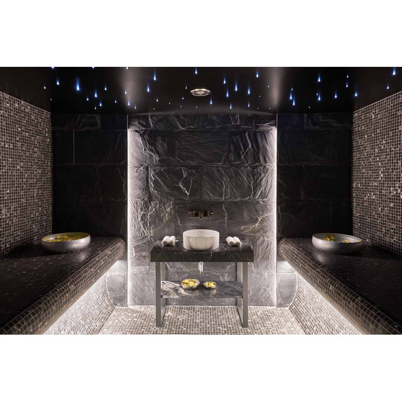 Saumattoman tyylin luomiseksi hamam-huoneeseen valittiin myös lasivitriine. Sisäpinnat muodostetaan yksilöllisen projektin mukaan paisutettua polystyreeniä käyttäen jatkuvatoimista leikkausta EPS-styreeniä. Huoneen seinät, lattiat ja penkit ovat lämmitetyt. Valaistusjärjestelmä käyttää LED RGB IP 67, 9m nauhoja ja valokuitujärjestelmää "Starry Sky". Liimatut mosaiikkilaatat, mukautettu kaarevuuden mukaan ja täytetty harmaalla Schonox-vedeneristyksellä.