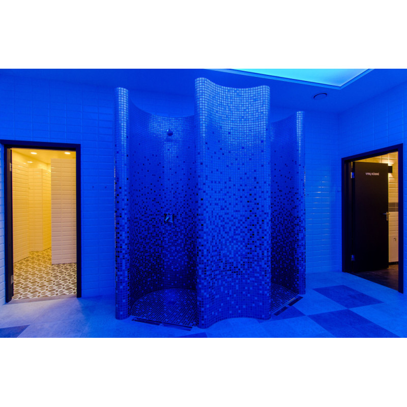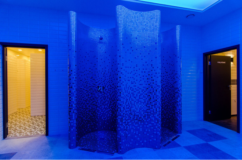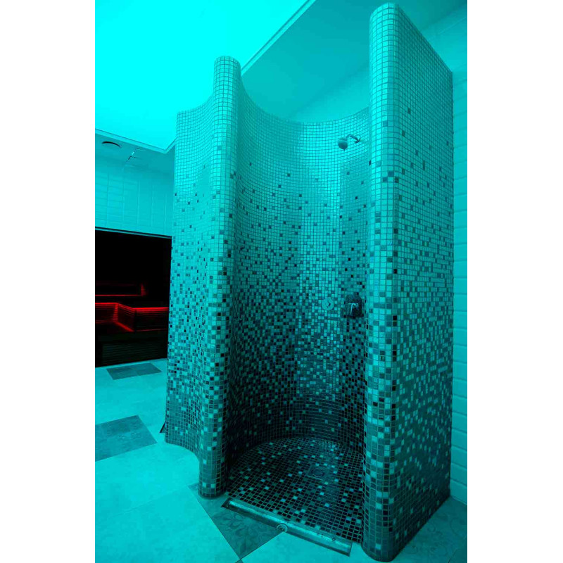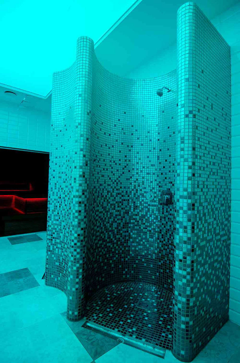 Suihkumuotit on valmistettu XPS 300: sta, käyttäen erikoisominaisuuksia. leikkaustekniikka yksilöllisen suunnittelun mukaan. Muotit asennettu, vedeneristetty Schonox -voideltu vedeneristys. Liimatut mosaiikkilaatat, mukautettu kaarevuuteen ja täytetty harmaalla Schonox -vedeneristyksellä. Suihkut - eri tarkoituksiin. Toinen niistä - yksinkertaiseen pesuun, toinen - viilentymiseen saunan jälkeen kylmän vesisuihkulla.