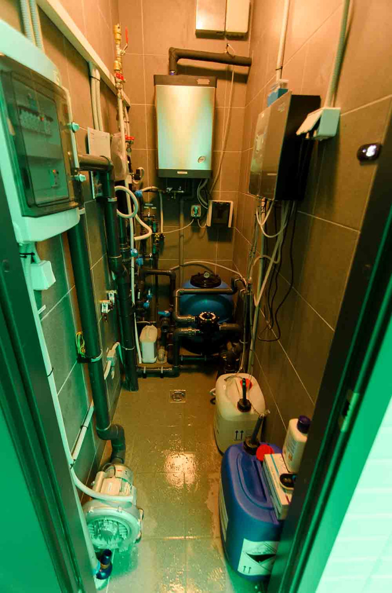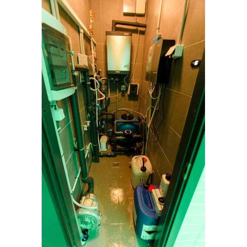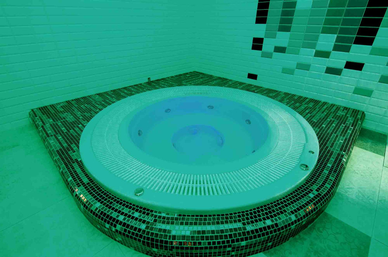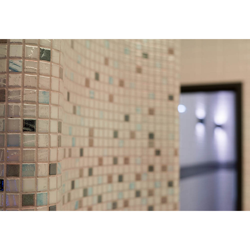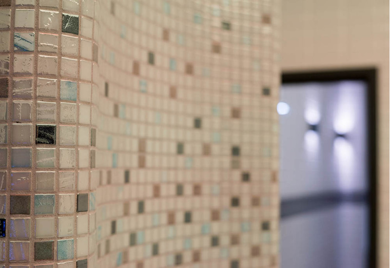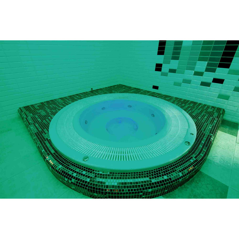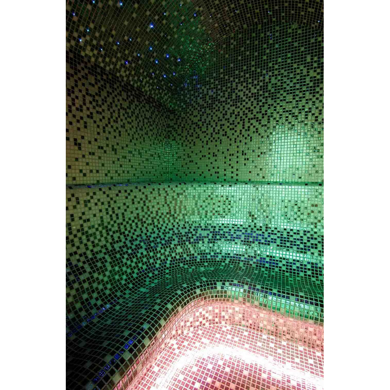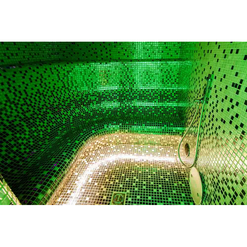 Vesihieronta -allas - kaupallinen. Laatat uima-altaan ympärillä - lasimosaiikki. Laitteet: