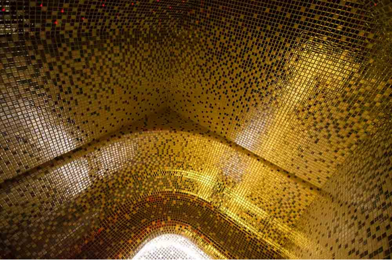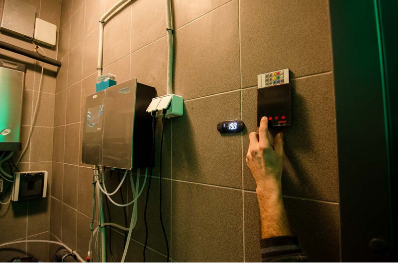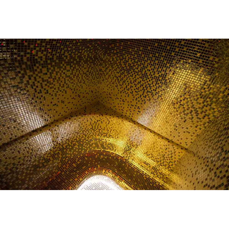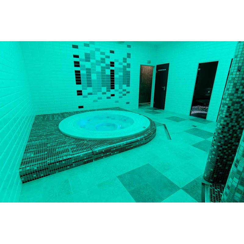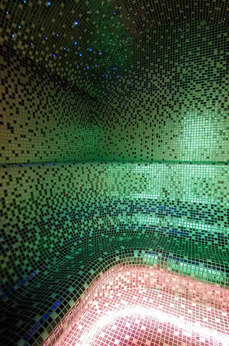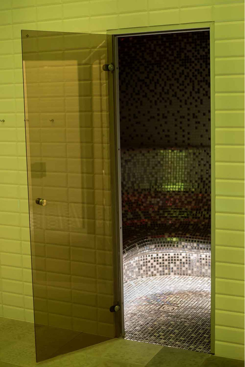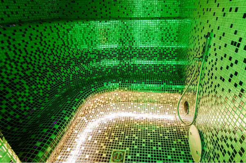 Höyrysaunan sisäpinnat muodostetaan yksittäisprojektin mukaisesti paisutetusta polystyreenistä käyttäen jatkuvatoimista EPS -styreeniä. Liimatut mosaiikkilaatat, mukautettu kaarevuuteen ja täytetty harmaalla Schonox -vedeneristyksellä. Huoneen lattia on lämmitetty. Ovet - alumiinirunko, karkaistu sävytetty lasi. Höyrysauna laitteet: