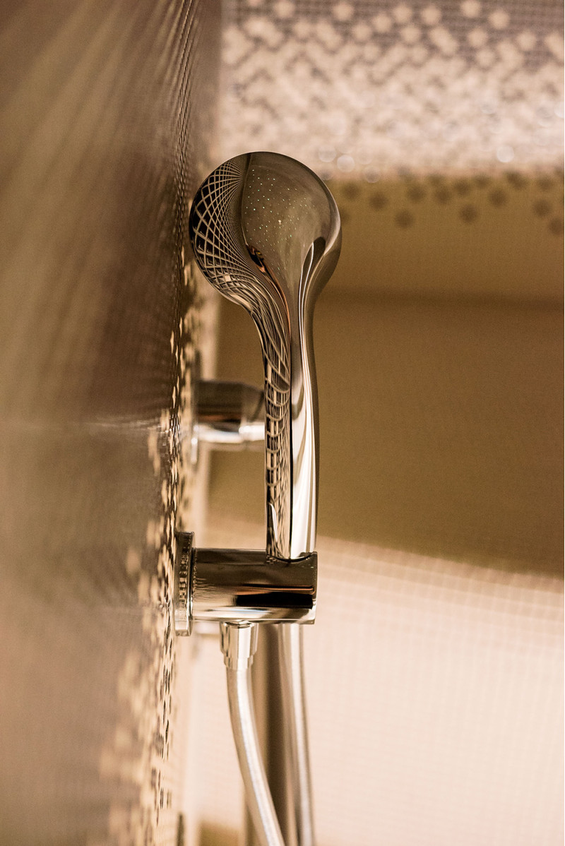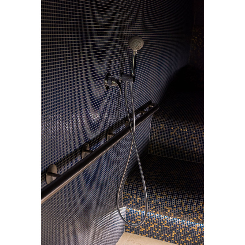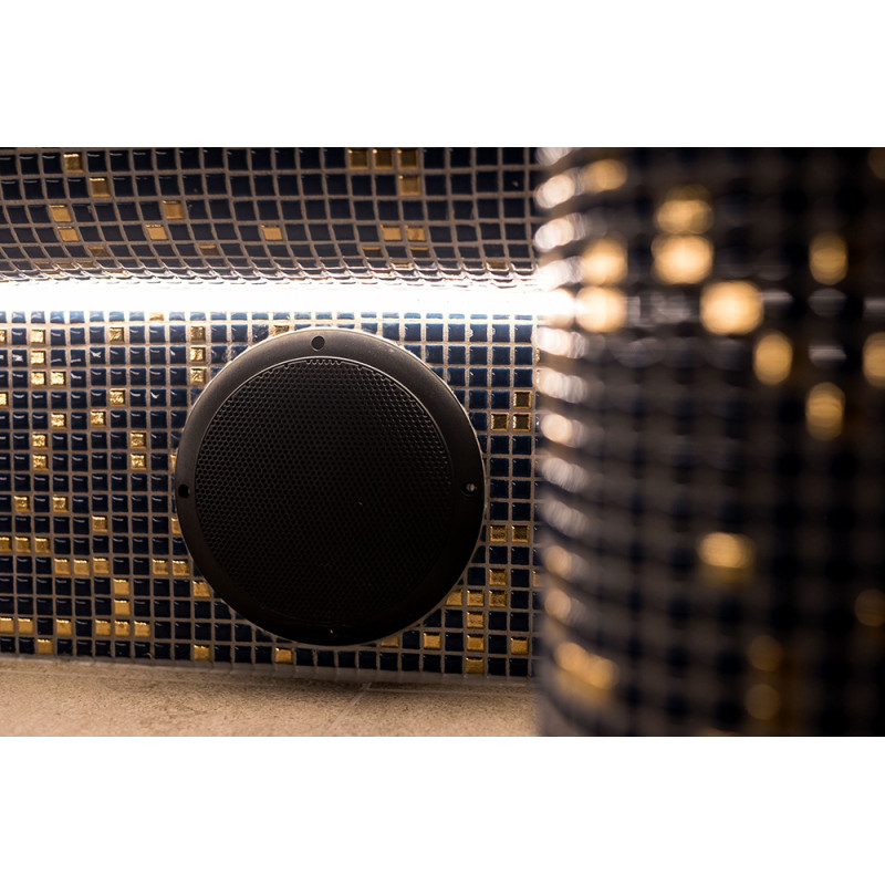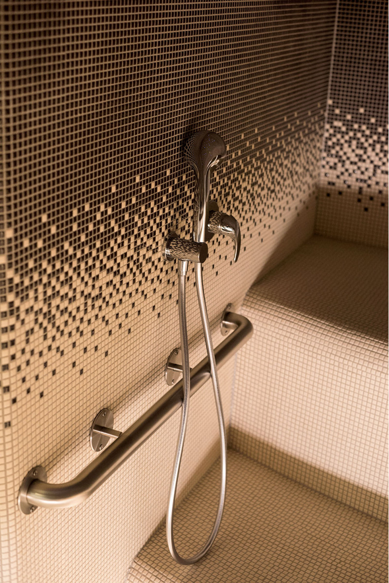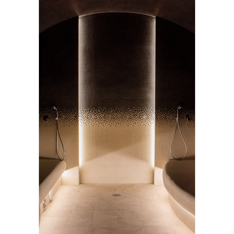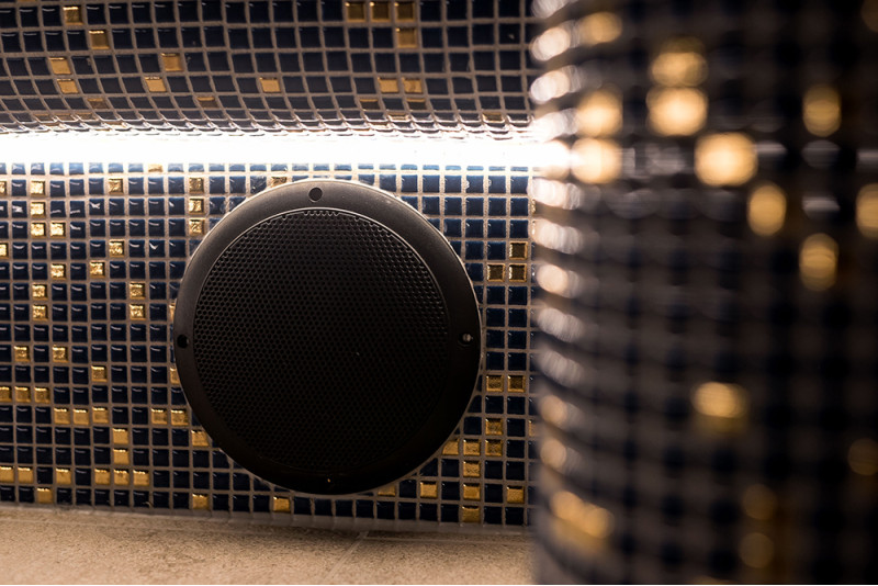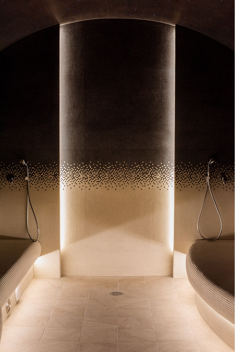 - Vuoteiden alle on asennettu kosteutta ja lämpöä kestävät valaisimet. Seinälle asennetun valaisimen nurkkaan valittiin vastaava mustan leppäpuun kansi.
