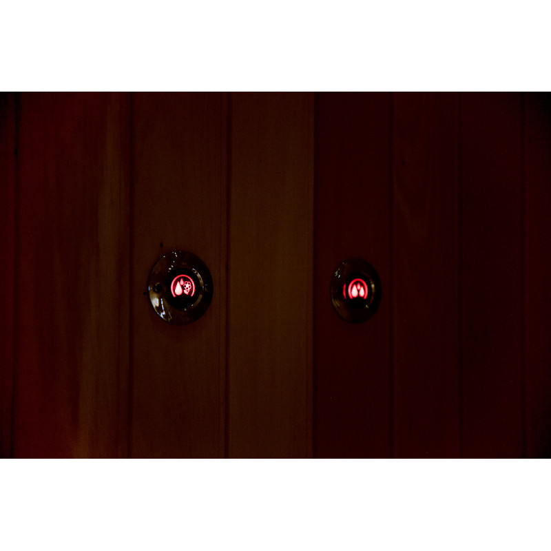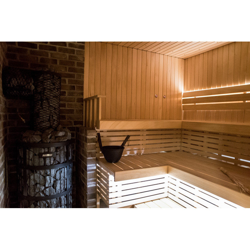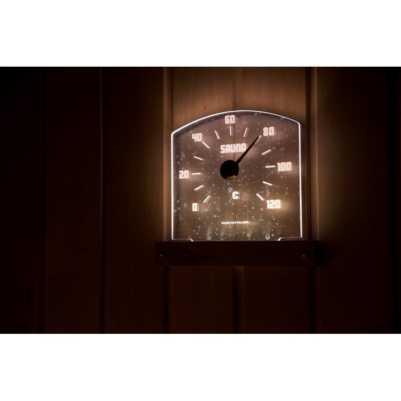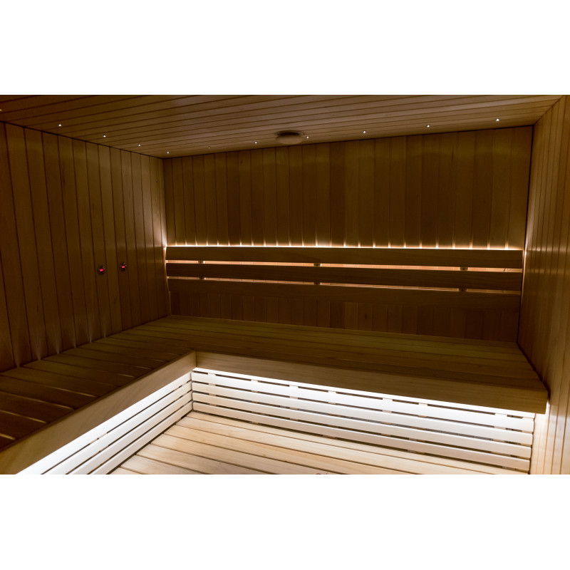 Varustettu värillisellä RGB-valolla yläpenkkien ja selkänojan alla. Tämä saunavalaistus kestää kosteutta ja lämpöä. Valaistuksen väriä voidaan muuttaa mielialaasi mukaan.