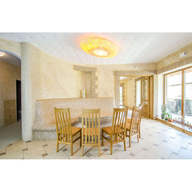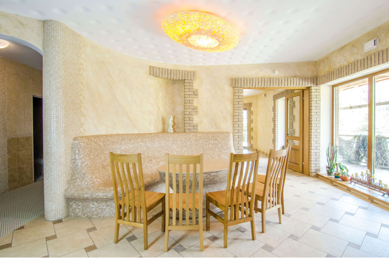 Sisältää valoisan ja ilmavan saunan lauteen ja pöydän.