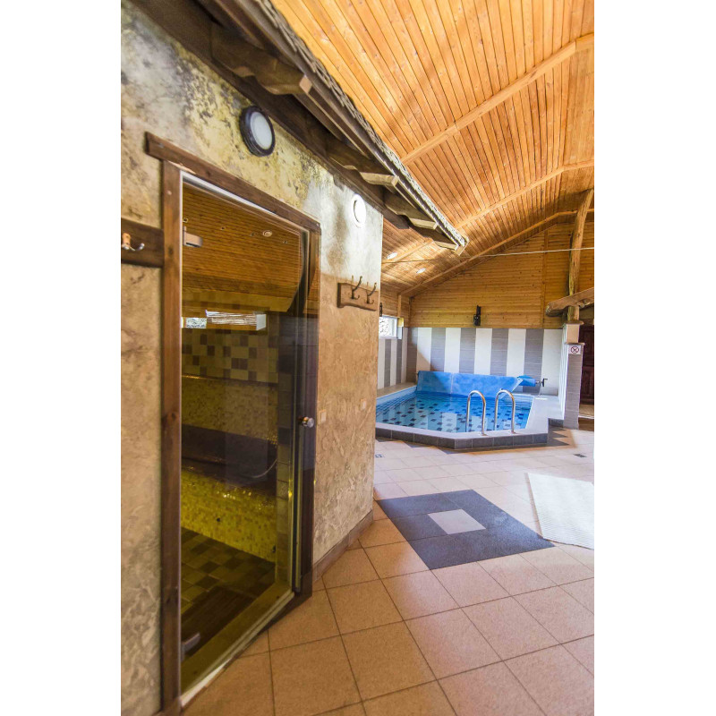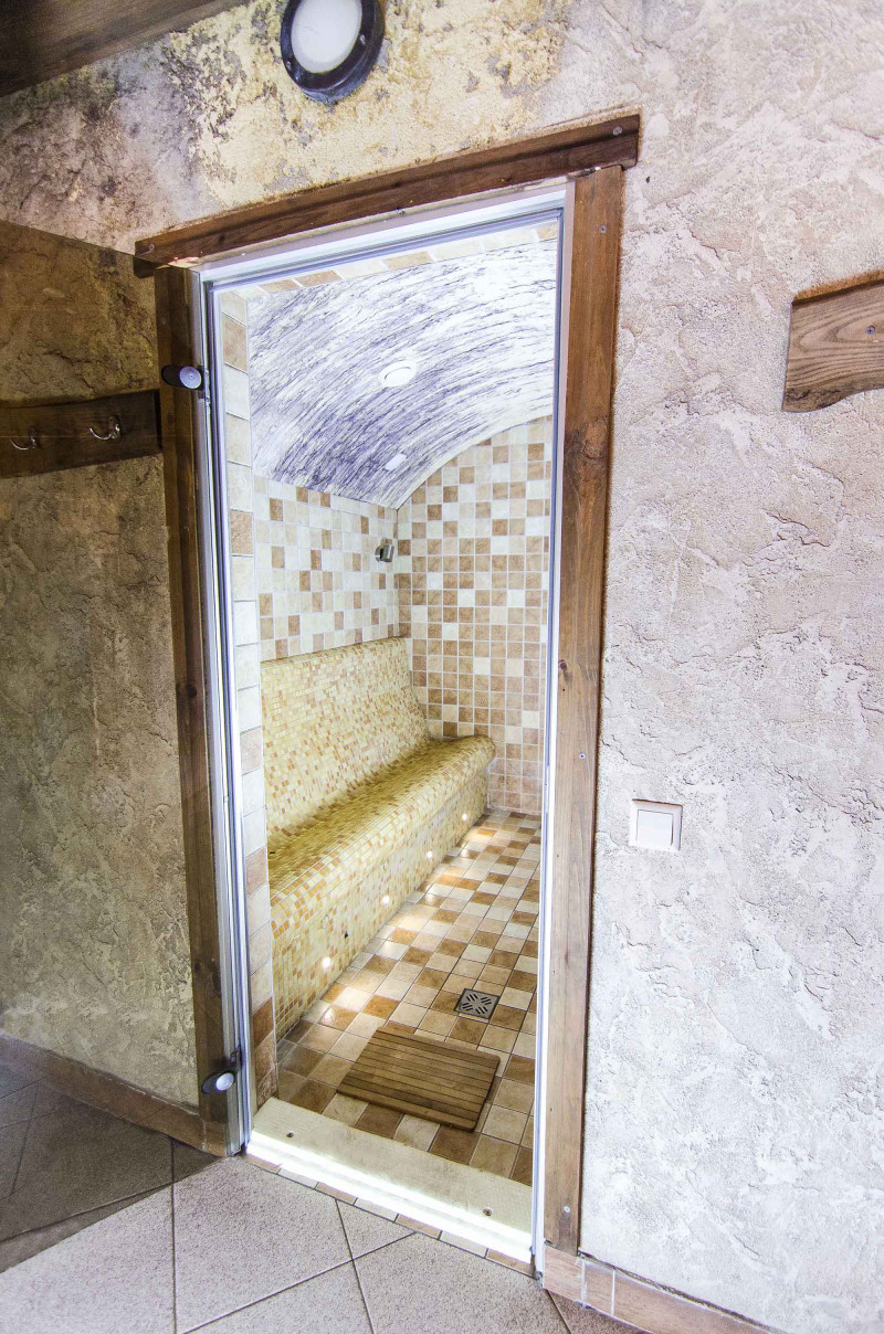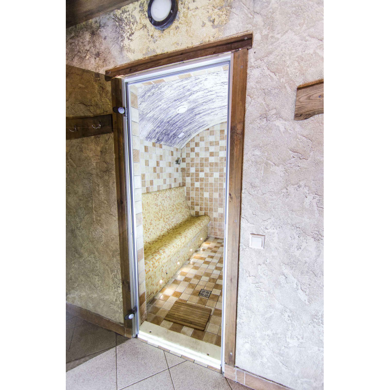 Vanhat puukarmilliset ovet vaihdettiin höyrysaunaan sopiviin - alumiinirungolla, sävytetyllä, karkaistulla lasilla. Tämän tyyppinen ovi ja karmi kestää lämpöä ja kosteutta, lämpötilan vaihteluita, eivät vääristy.