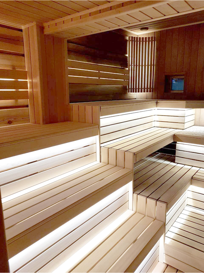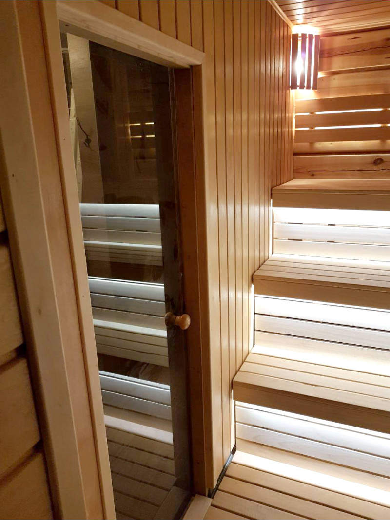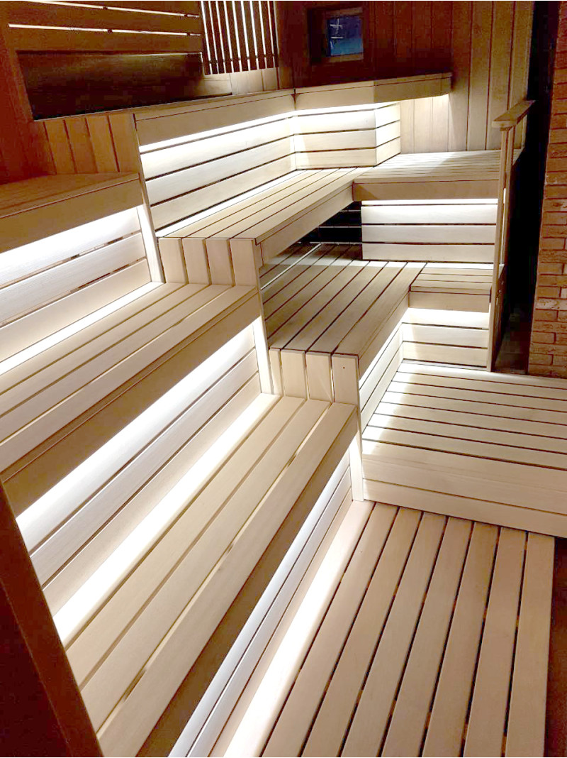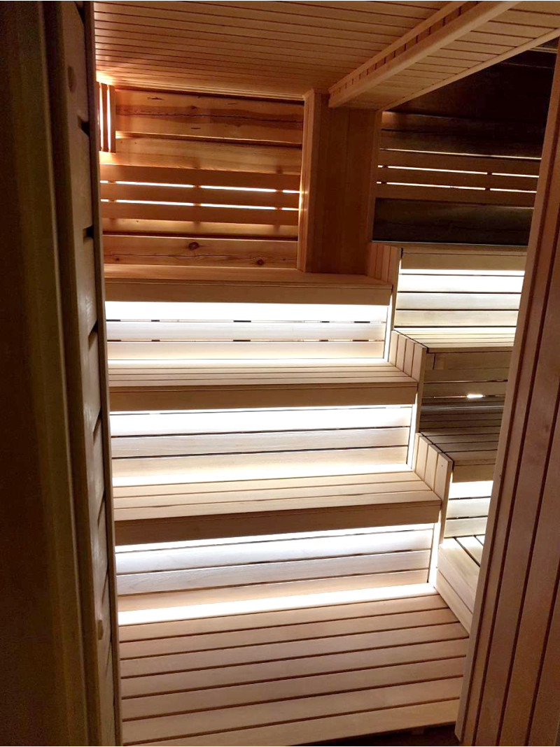 Lepotuolien alle on asennettu lämpimän valkoinen LED-valaistus, joka antaa saunaan avaruuden ja viihtyisyyden tuntua. Seinävalaistukseen valittiin valaisin, jossa on siihen sopiva puinen kansi.