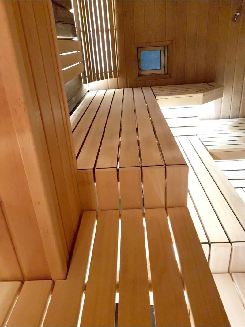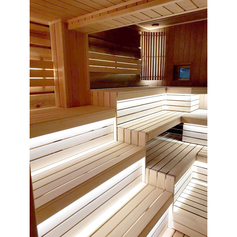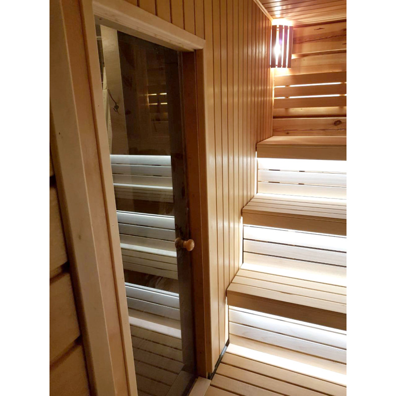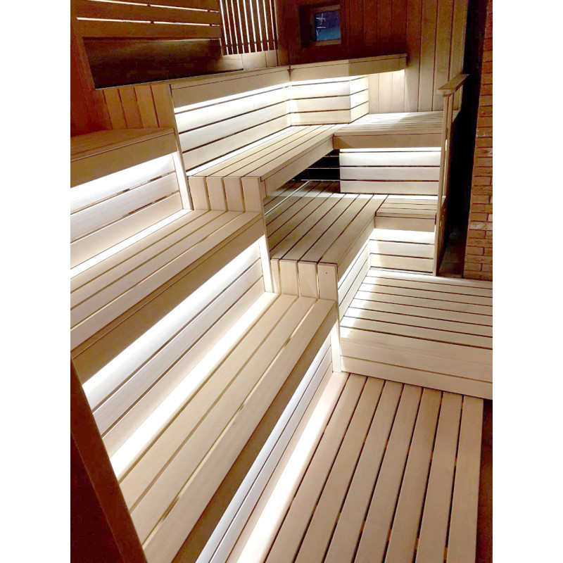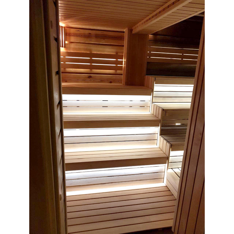 Lepotuolien alle on asennettu lämpimän valkoinen LED-valaistus, joka antaa saunaan avaruuden ja viihtyisyyden tuntua. Seinävalaistukseen valittiin valaisin, jossa on siihen sopiva puinen kansi.
