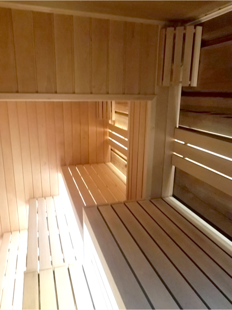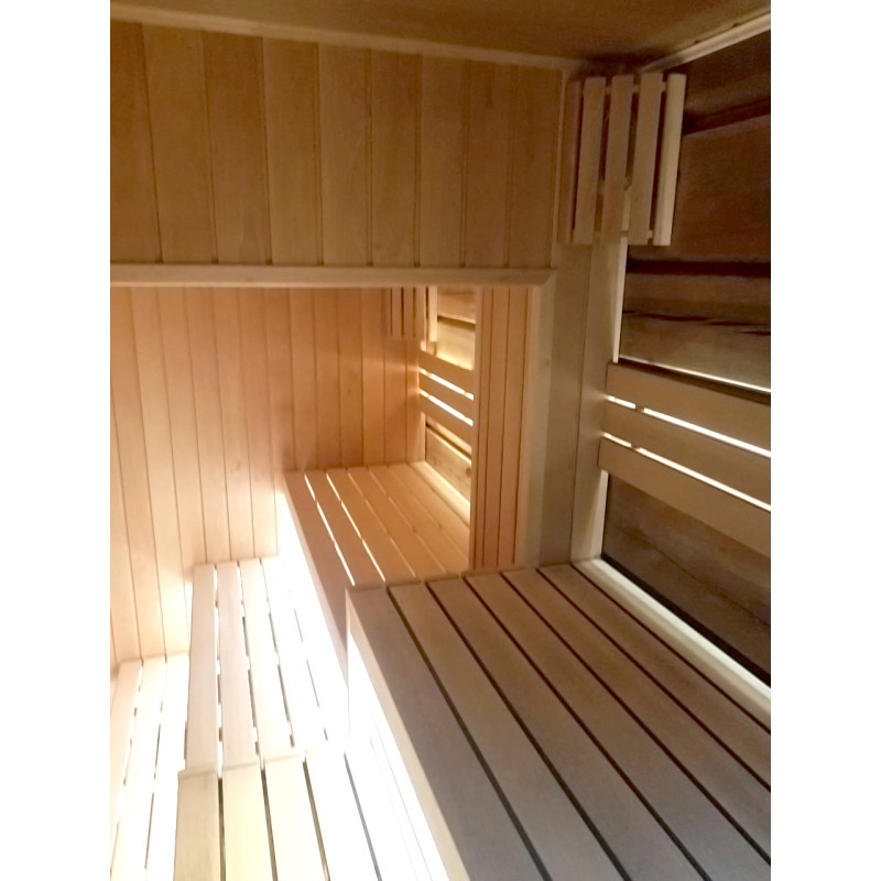 Sauna on varustettu tuulettimella puhaltamaan ilmaa sisään, mikä takaa hyvän ilmankierron.