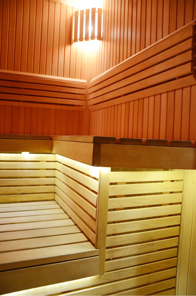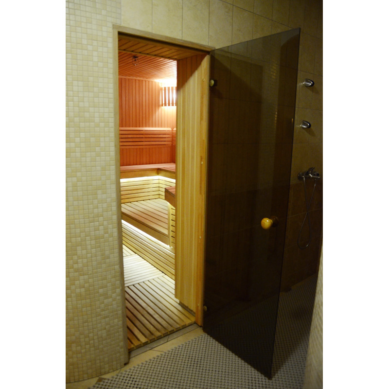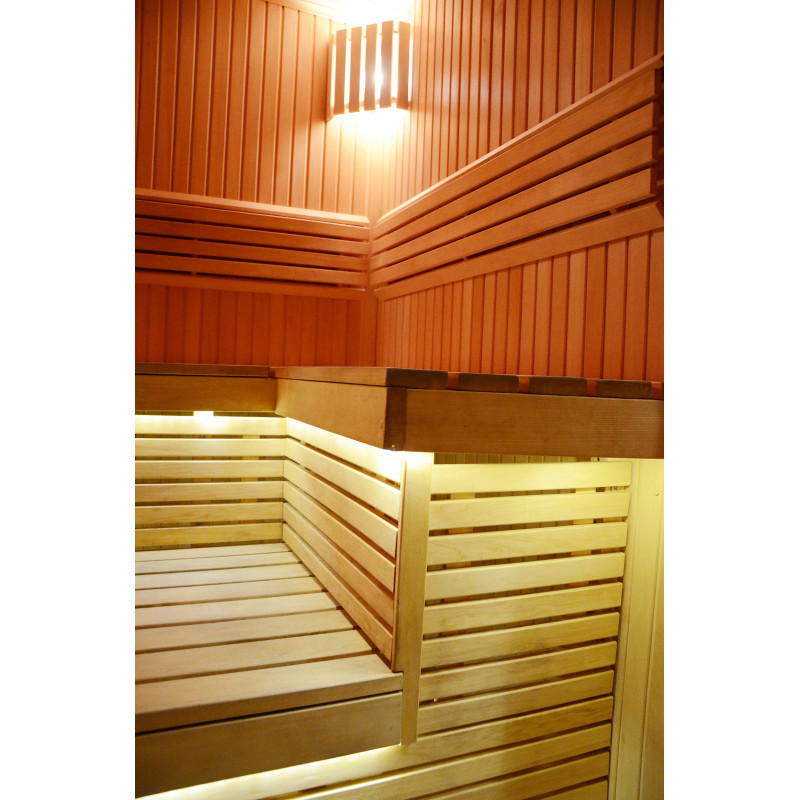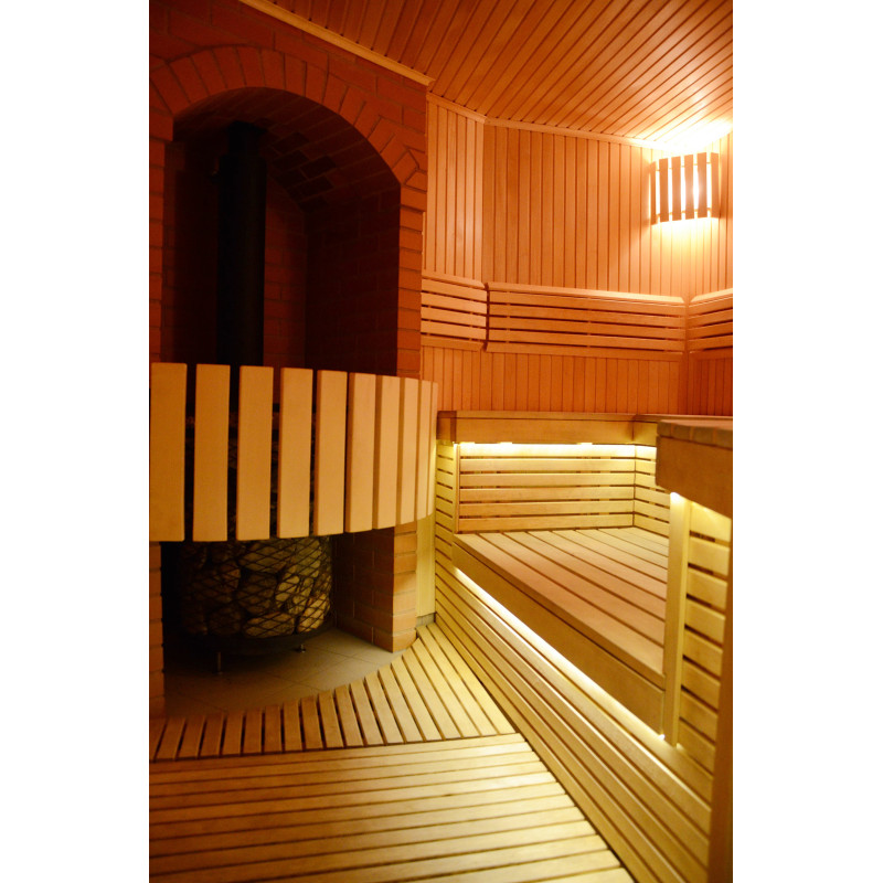 Saunan seinät ja lauteet on valmistettu korkealaatuisimmasta lehmuspuupaneloinnista, jolle on tunnusomaista kirkas, kaunis väri ja joka säteilee miellyttävää luonnollista tuoksua. Myös valaisimen suojukset, selkänojat ja alkuperäinen suoja-aita kiukaan ympärillä ovat puuta.