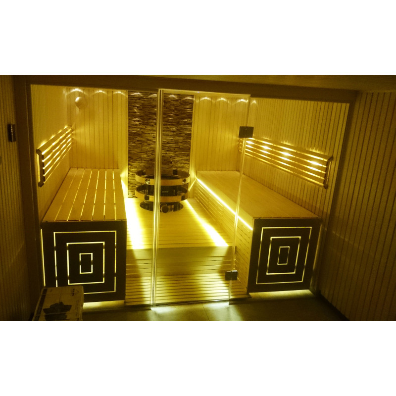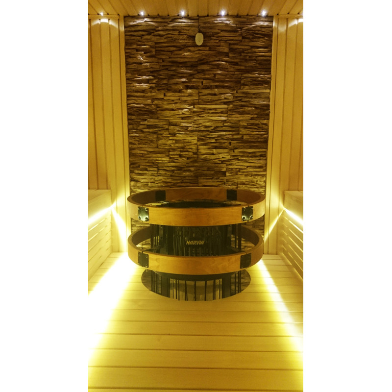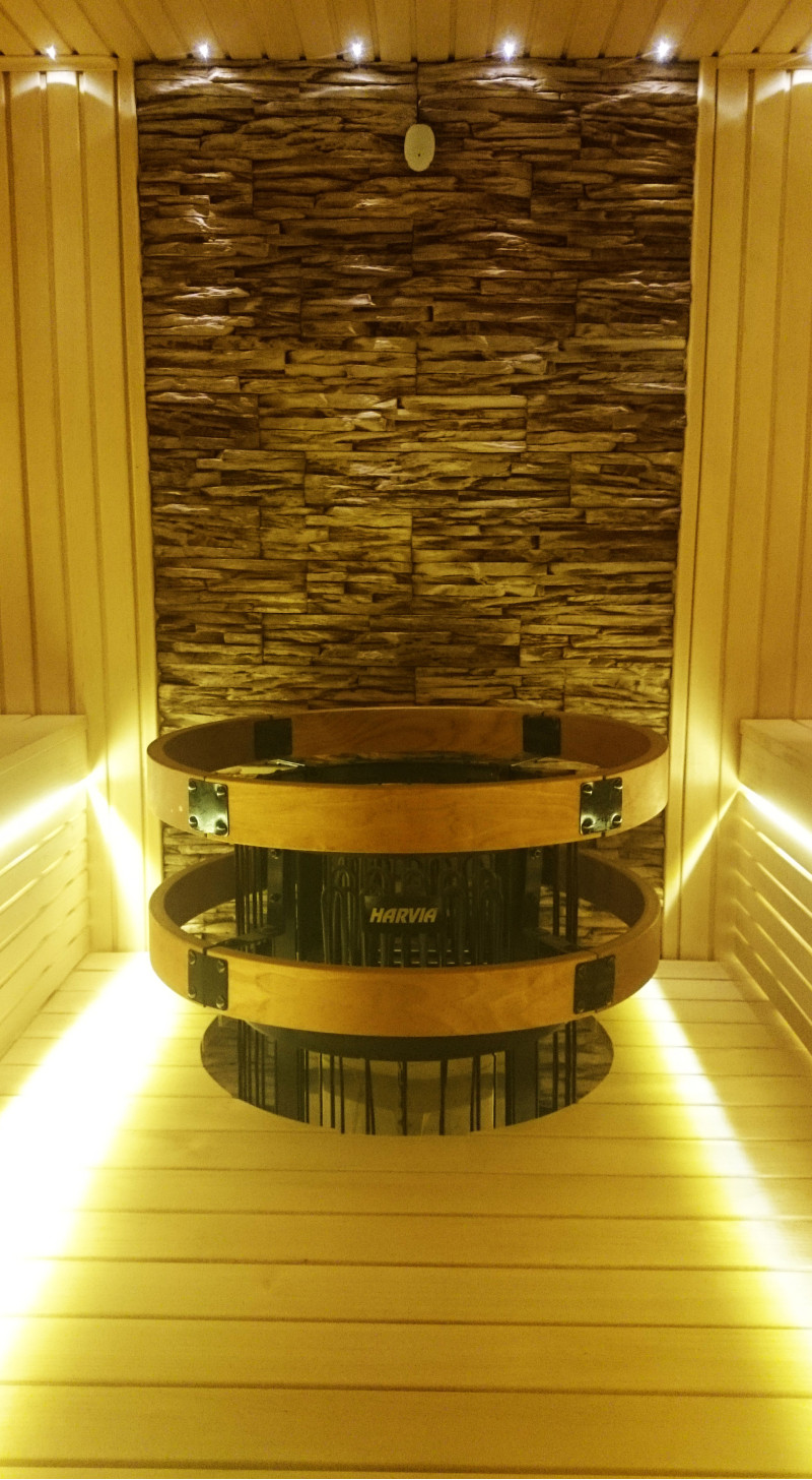 Lämmitin - Harvia Legend, joka antaa paljon höyryä. Täytetty suurella määrällä oliviinidiabaasikiviä. Lämmitintä ohjataan digitaalisella Griffin -konsolilla, joka voi asettaa lämpötilan yhteen tarkkuuteen.