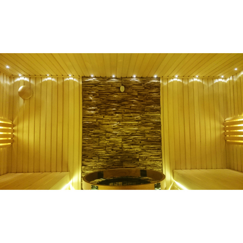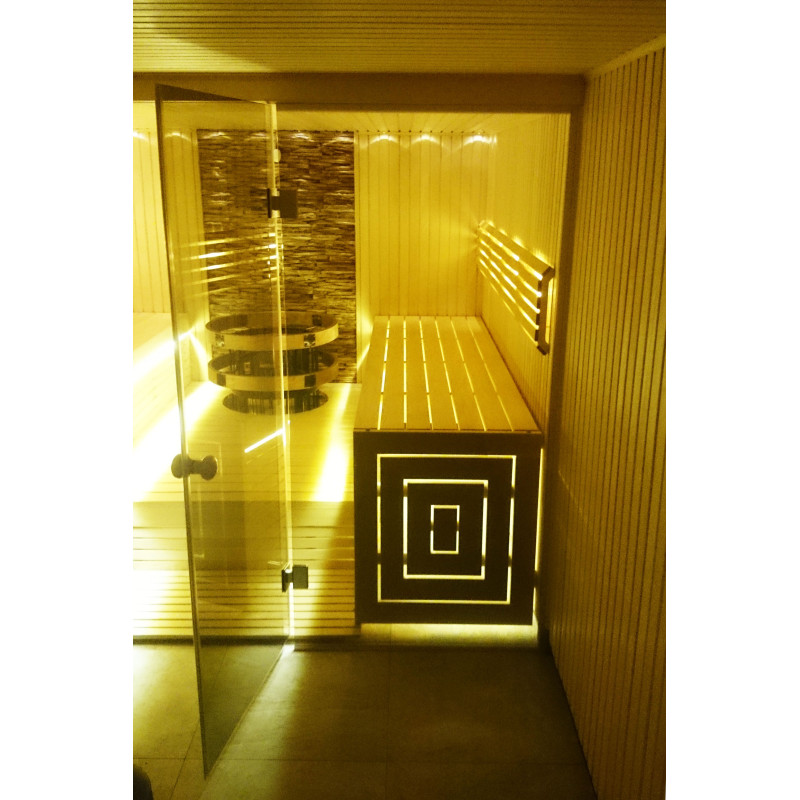Brysselissä on sauna, joka erottuu suunnittelustaan ja teknisistä ratkaisuistaan. Yksilöllinen, tilaa säästävä hanke tarjottiin sekä pienille sauna- että kylpyhuoneille. Saunan lepotuolit on asennettu korokkeelle toisiaan vastapäätä luoden loistavan viestinnän ilmapiirin. Liesi on rakennettu lattiaan suojarenkailla. Koristeellinen tiiliseinä on ainutlaatuinen aksentti, joka luo kodikkaan, alkuperäisen ympäristön. Lasinen vitriini lisää optisesti tilaa ja täydentää saunan ultramodernia tyyliä.