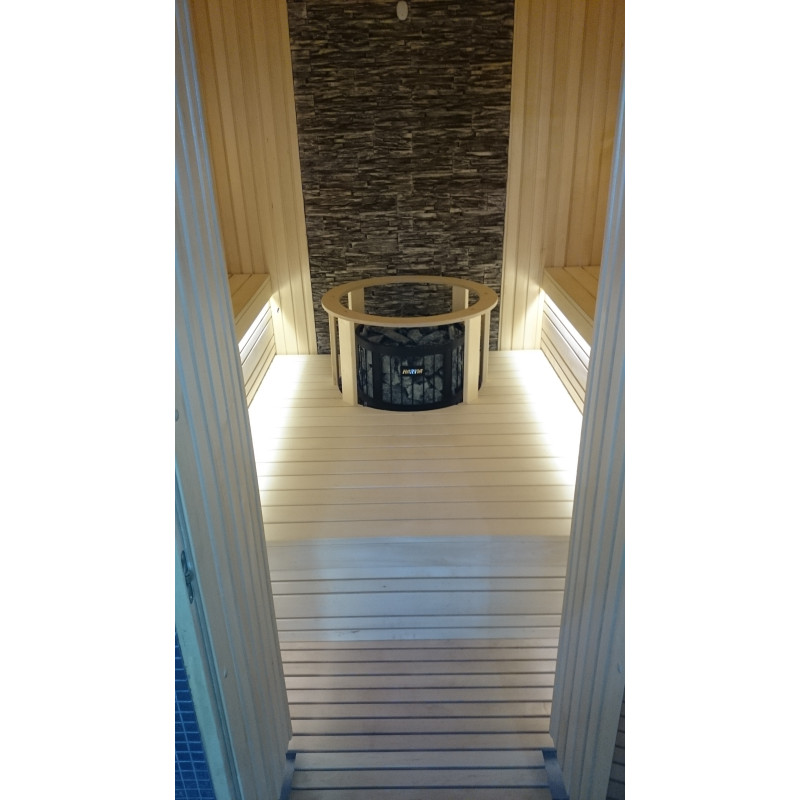 Saunan pääkohokohta on sähkökiuas Harvia Legend - legendaarinen kiuas niin isompiin kuin pienempiin saunoihin. Se oikeuttaa täydellisesti kuuluisan nimensä tuottamalla korkealaatuista löylyä ja tuomalla iloa niin saunan harrastajalle kuin ammattilaisellekin. Pyöreän muotonsa ansiosta se voidaan asentaa sekä saunan keskelle että integroida lauteisiin. Tässä saunassa kiukaan ympärille on asennettu suoja-aita, joka estää ihmisiä koskemasta vahingossa lämmitettyyn kiukaan.