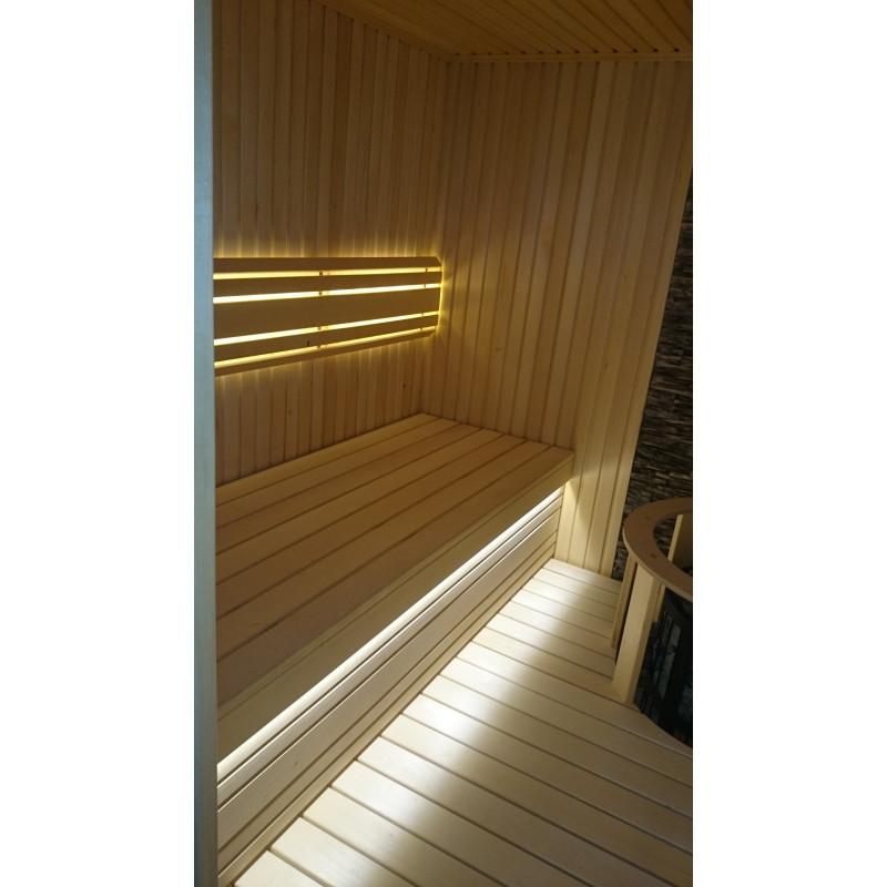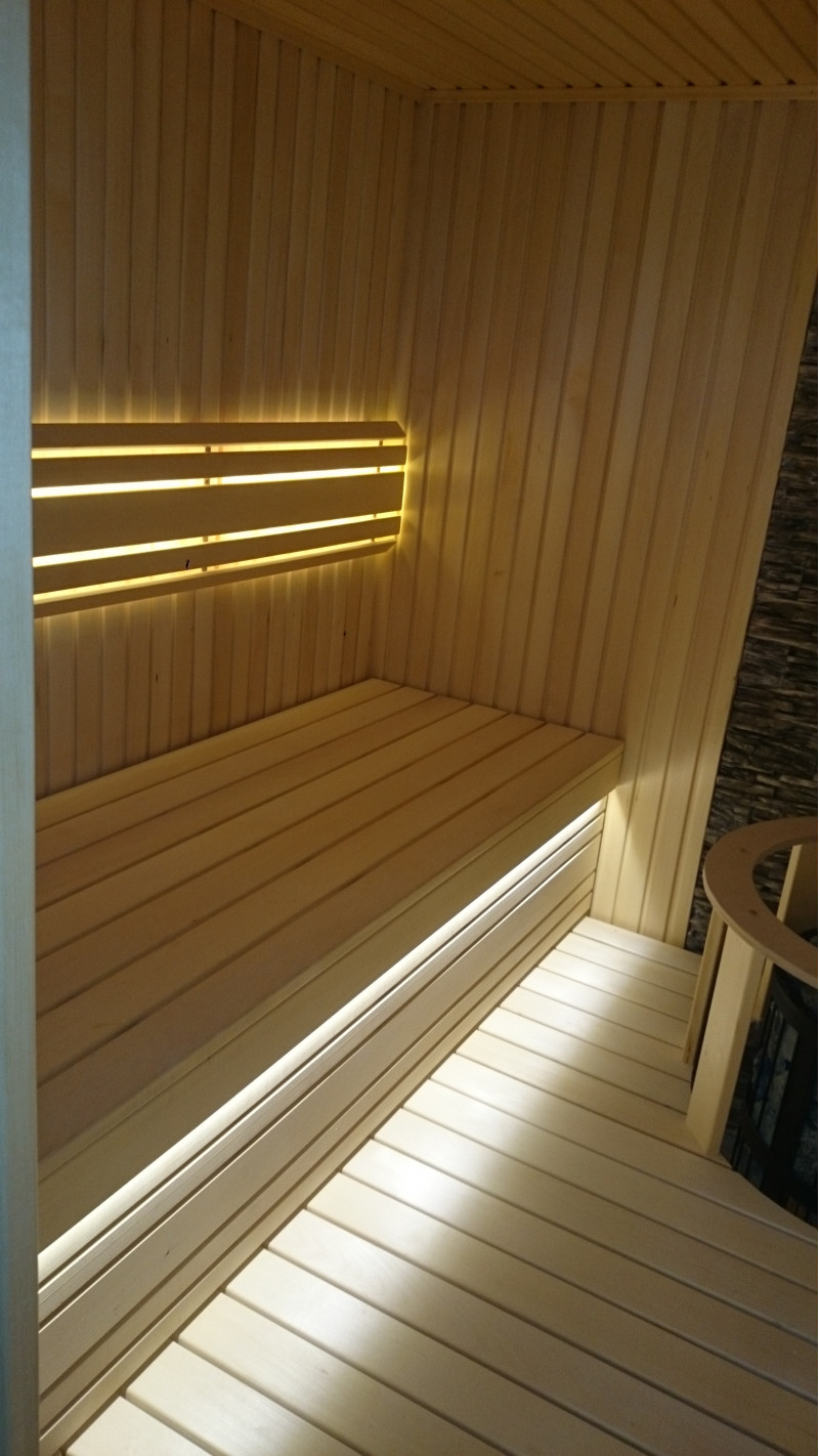 Valaistus luo saunaan suurimman viihtyisyyden. Tässä tapauksessa lämpimän valkoinen LED-valaistus asennetaan selkänojiin ja penkkien alle.