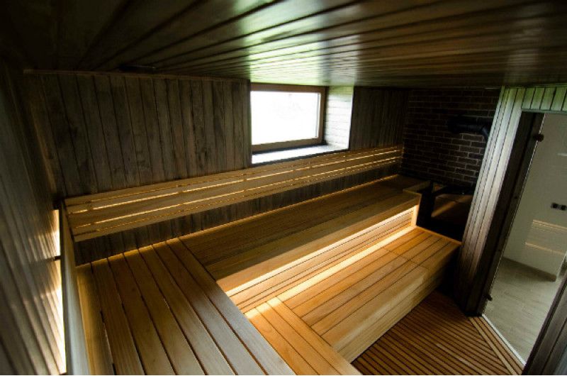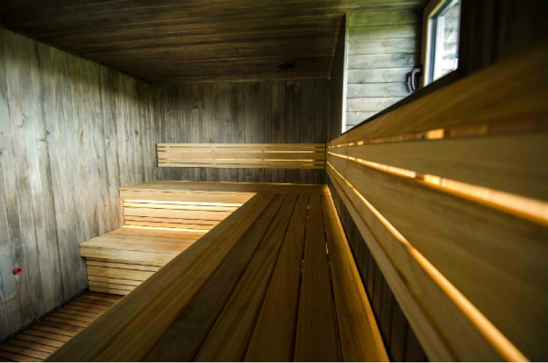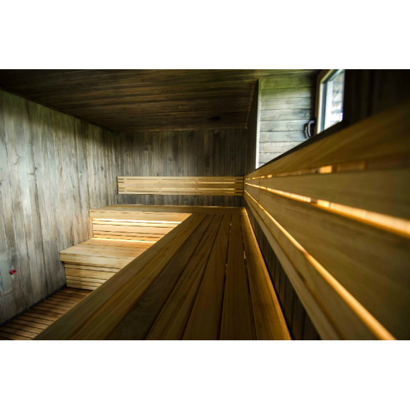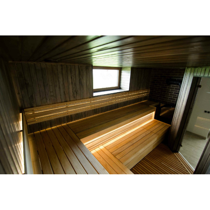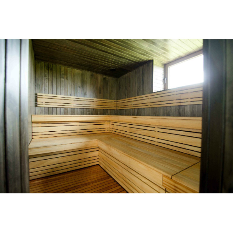 Saunan lepotuoleihin, selkänojiin ja lattiaritiloihin on valittu laadukas afrikkalainen Abachi-puu. Tämä puu ei vain näytä hyvältä, se ei myöskään kuumene, mikä tekee siitä mahdottomaksi palaa kosketettaessa. Tällaisilla lauteilla on erityisen kätevää ja nautinnollista saunoa.