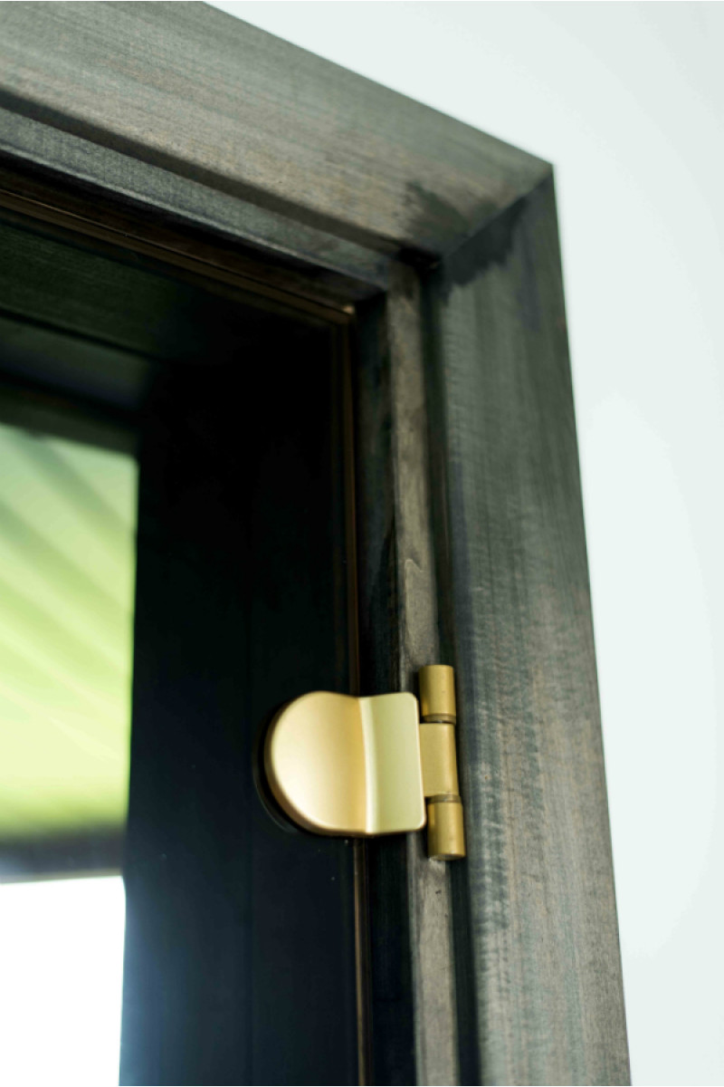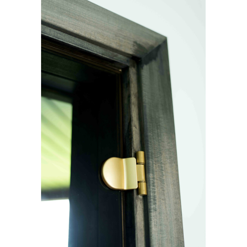Ovet sävytetyllä karkaistulla pronssilla, lehmuspuurungolla ja pyöreällä kahvalla.