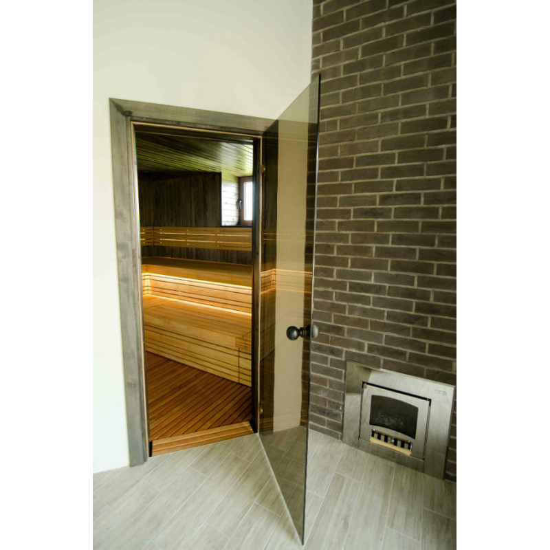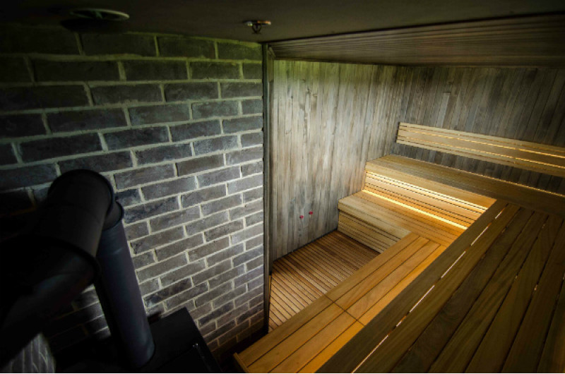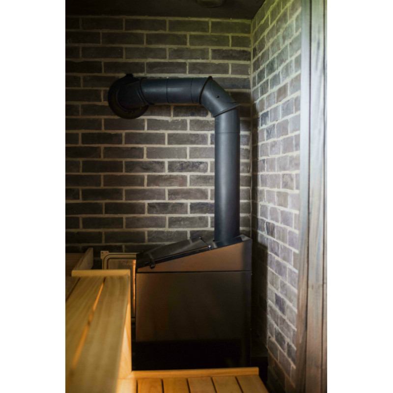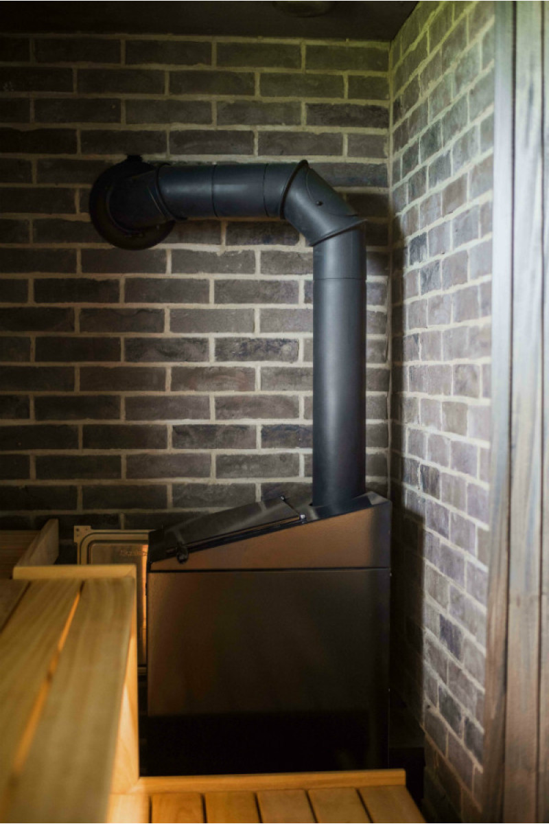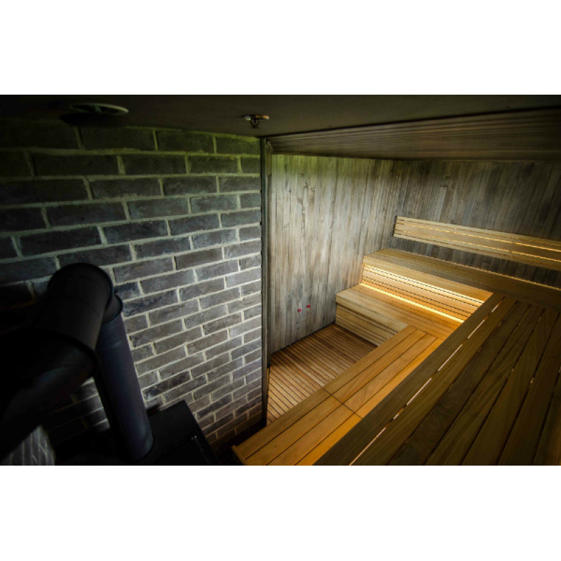 Erityisellä mustalla vahalla vahatut seinät ja katto eroavat kirkkaiden saunan lauteiden kanssa, ja huone näyttää ainutlaatuiselta luoden kodikkaan ja modernin tunnelman. Tätä penkkien ja seinien kontrastia korostaa entisestään sisäänrakennettu lämpötilaa ja kosteutta kestävä valkoinen LED-valaistus lauteiden ja selkänojien alla.