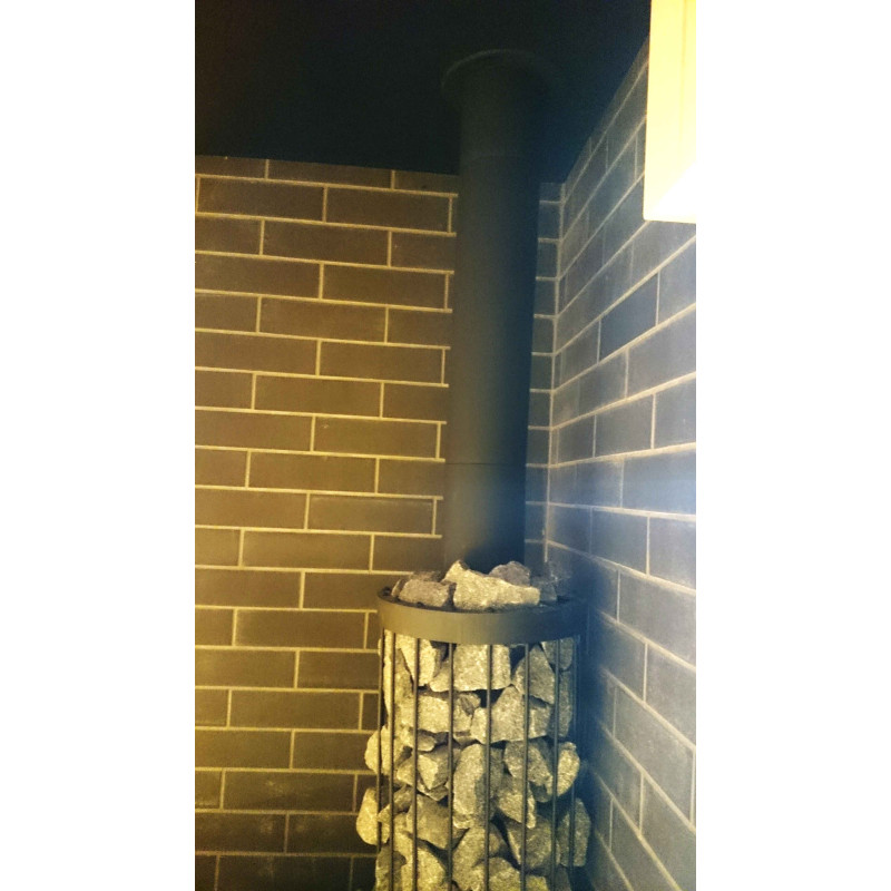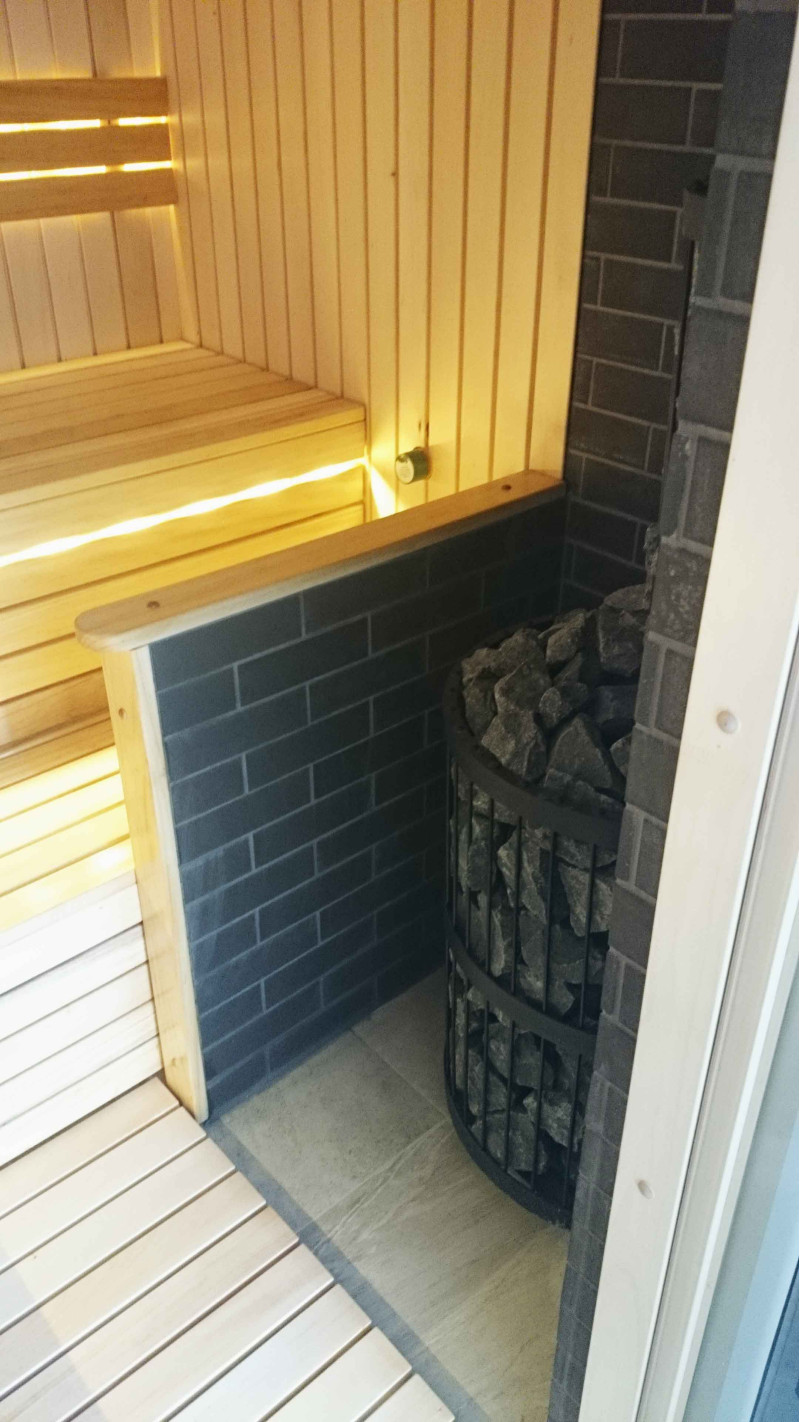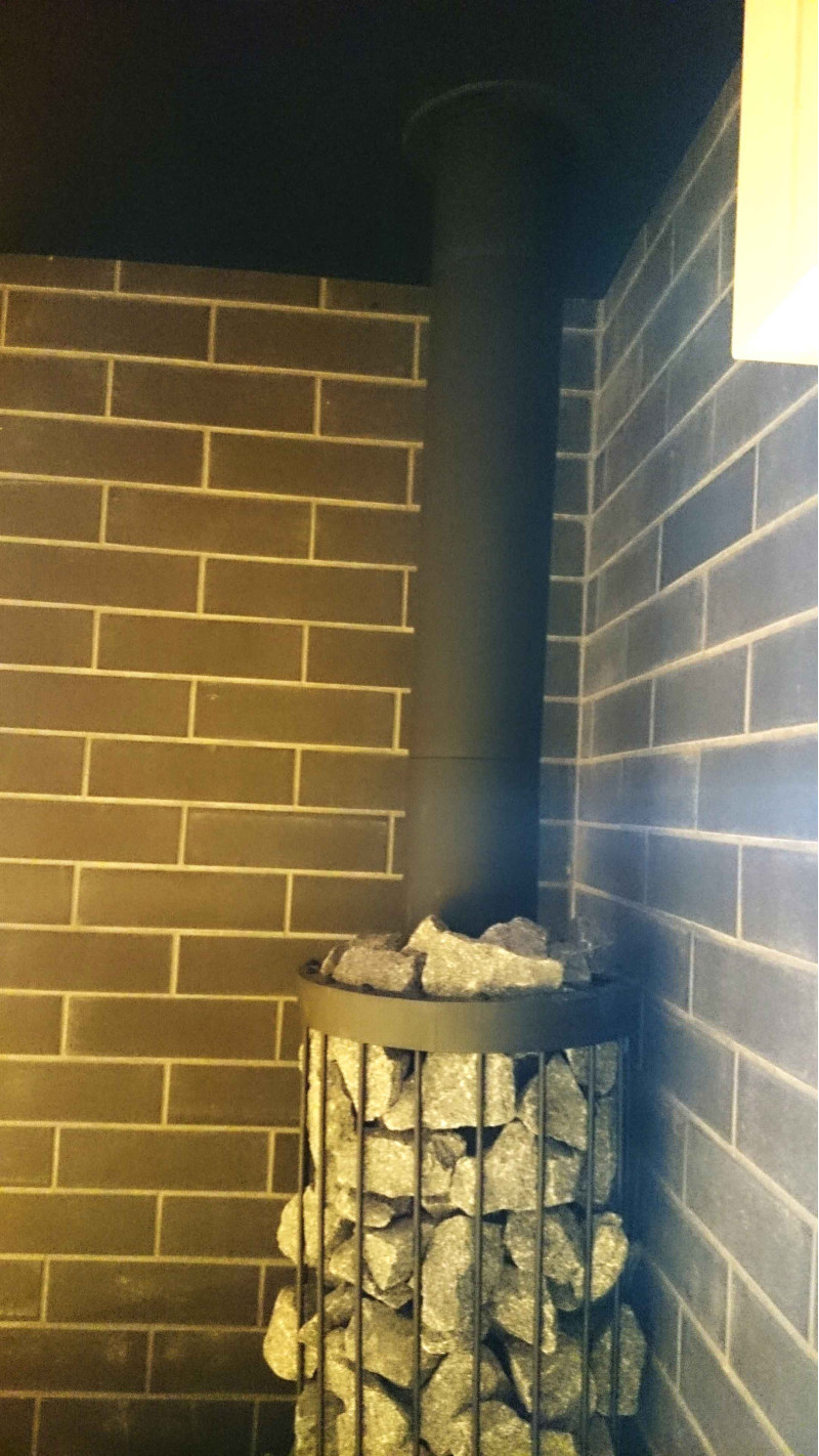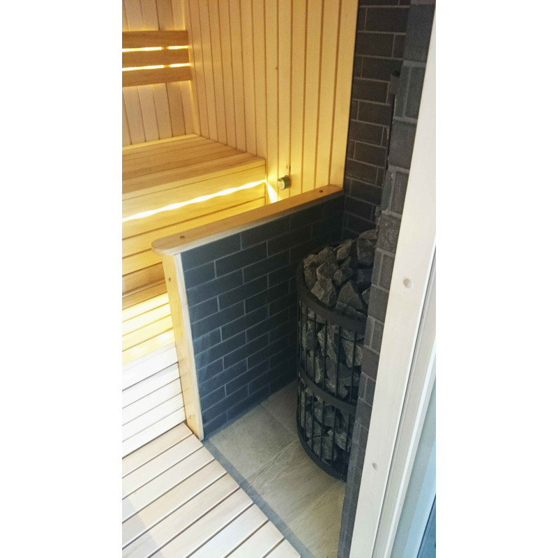 Tämä saunaprojekti, jossa on suojaseinä kiukaalle. Seinä on valmistettu Minerit lämmönkestävästä levystä, metallirungolla.