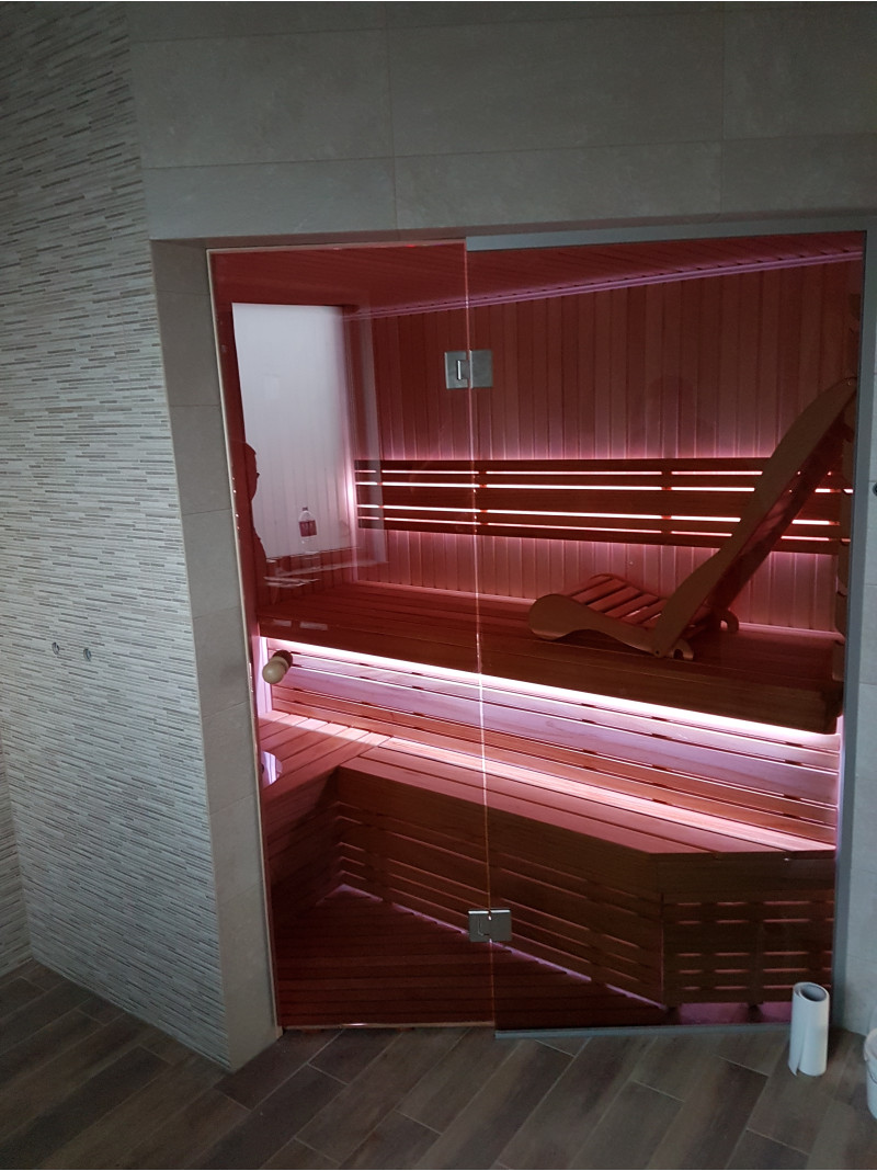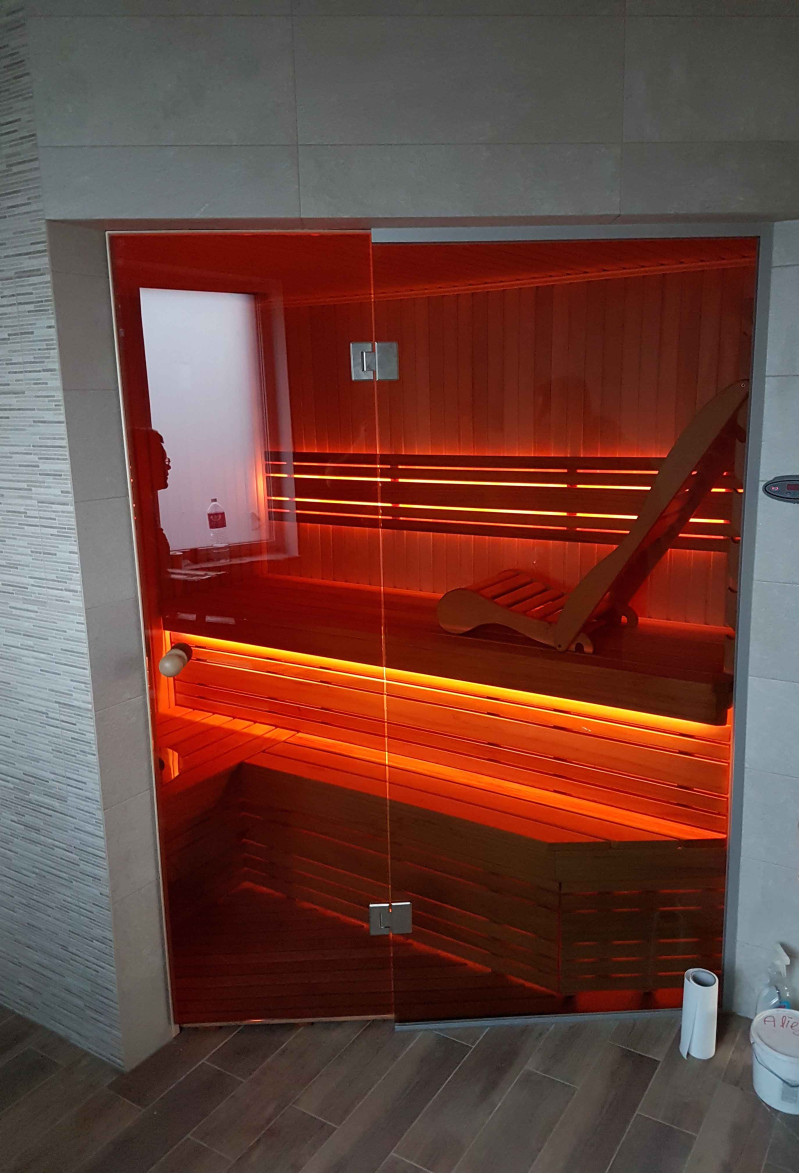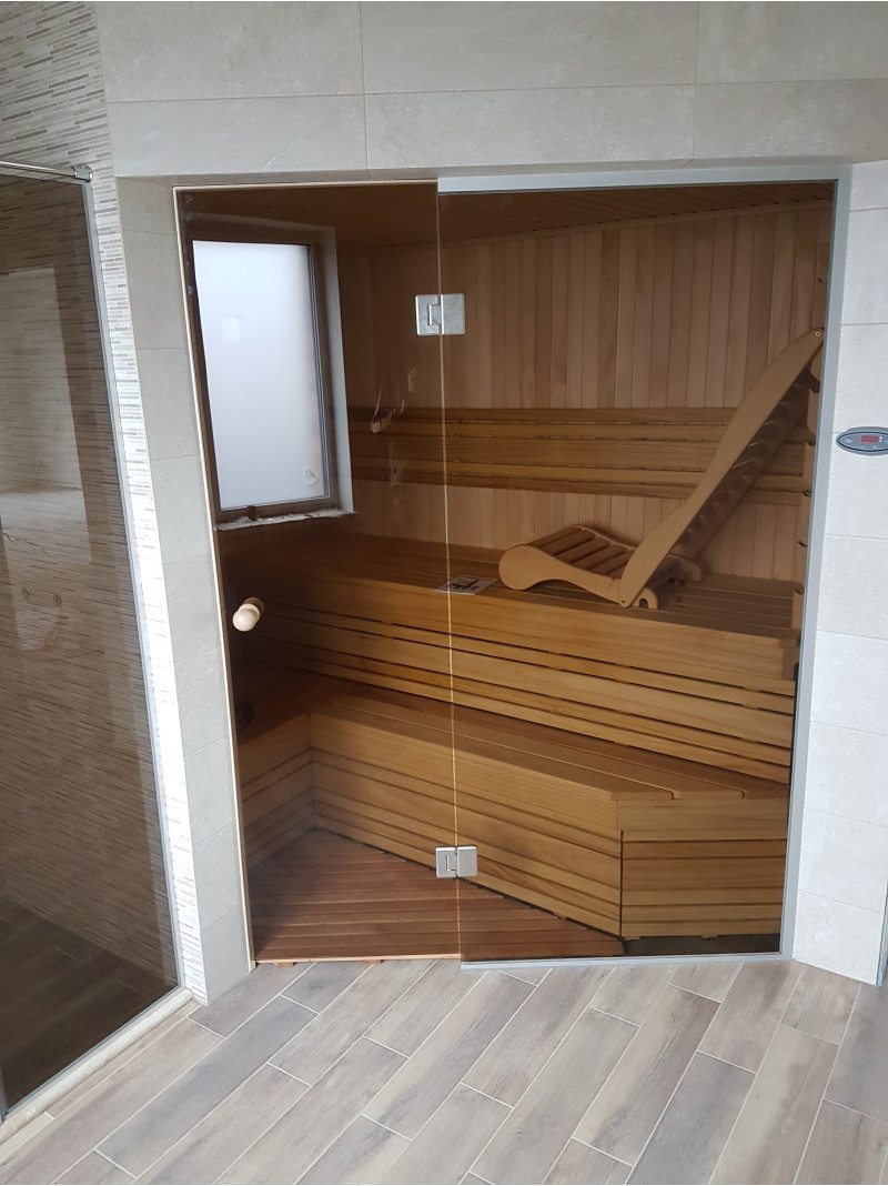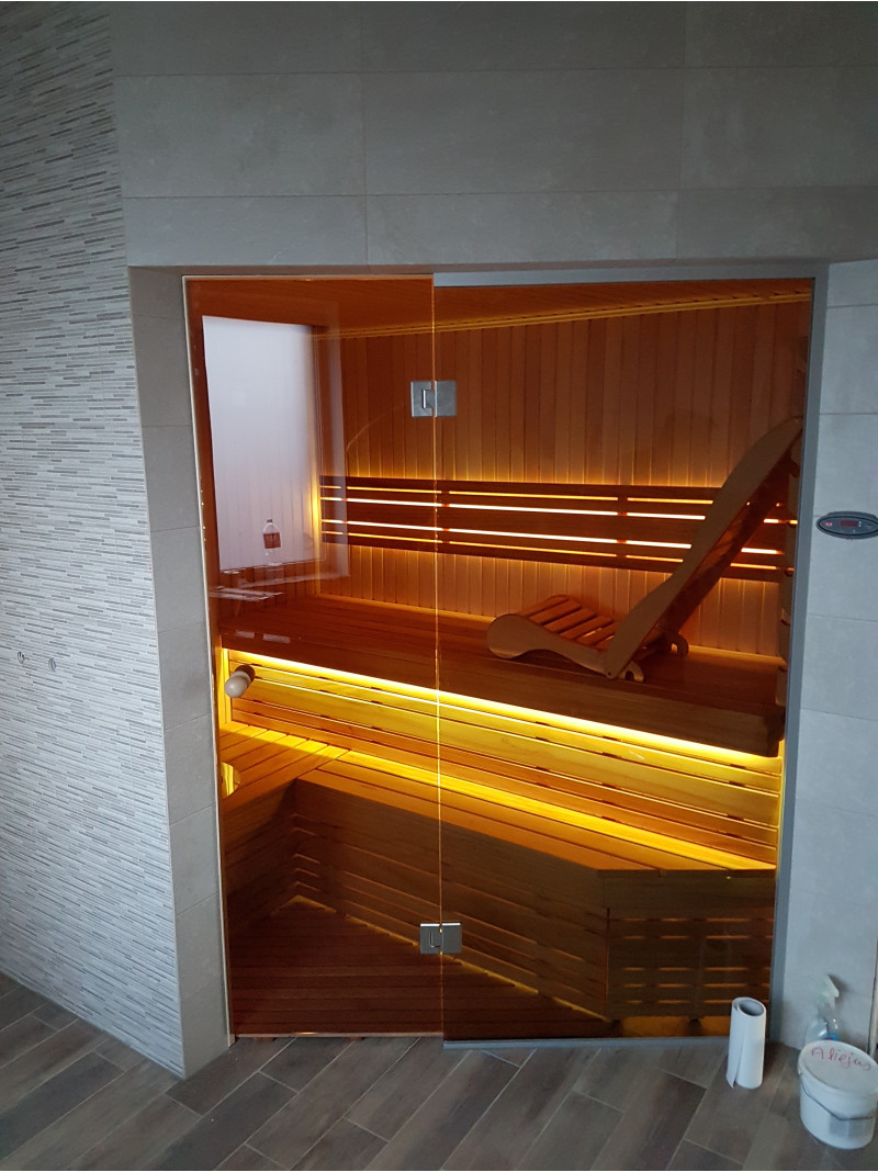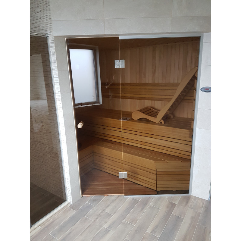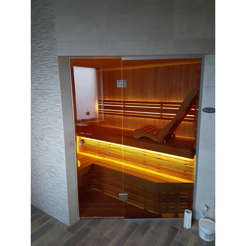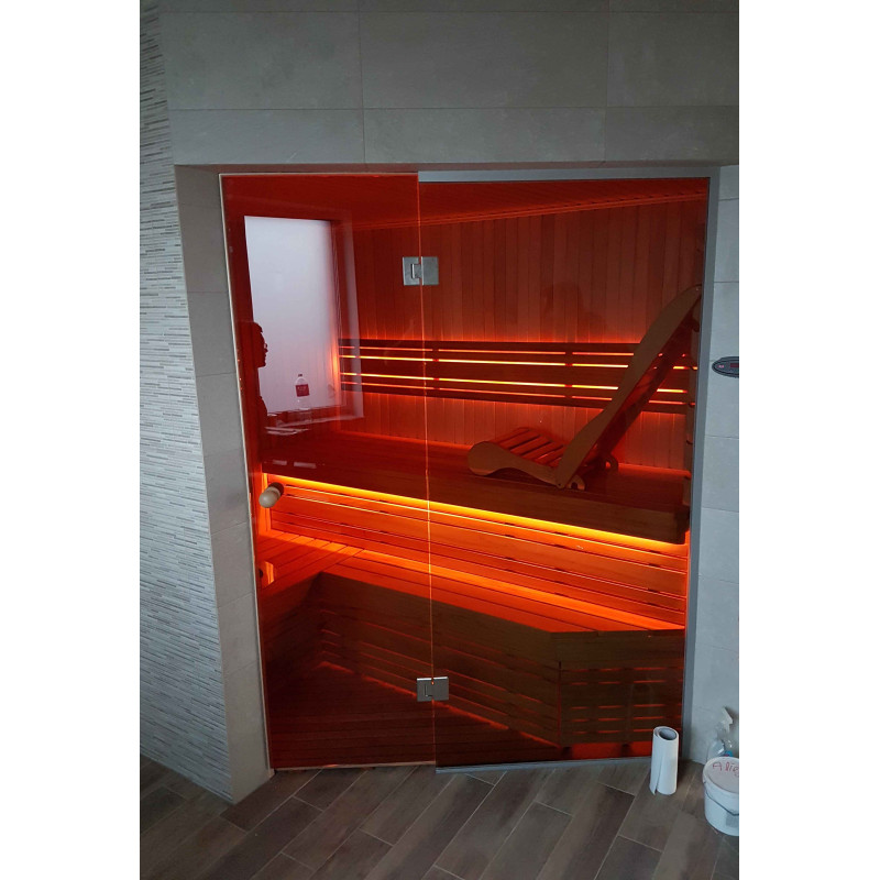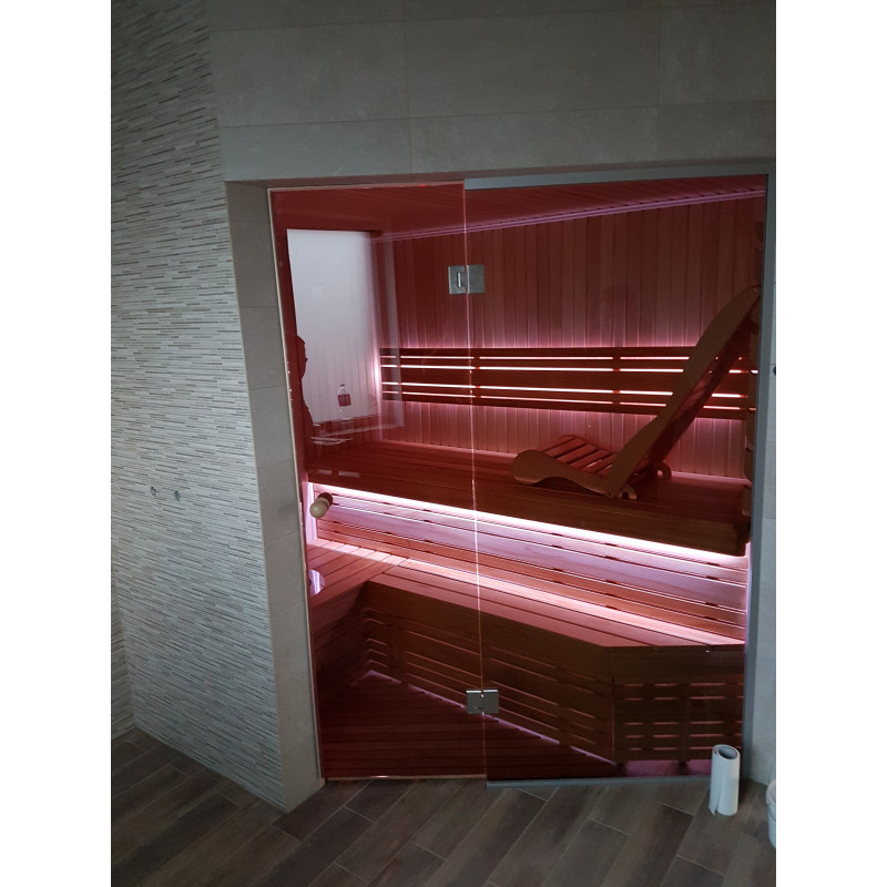 Saunan ovi on karkaistu, pronssinen, 8 mm lasivitriini alumiinirungolla, joka kestää lämpöä ja kosteutta, lämpötilan vaihteluita.