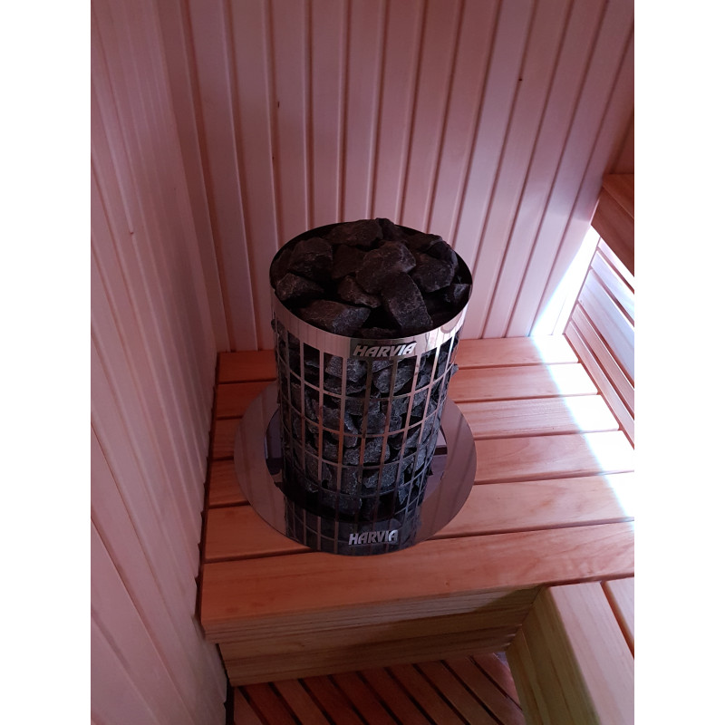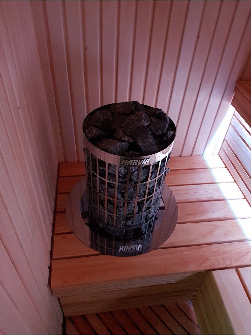 Moderni kiuas - Harvia Cilindro, jossa ruostumattomasta teräksestä valmistettu koristerengas, integroitu lepotuoleihin. Kestää suuren määrän kiviä, tuottaa paljon kevyttä höyryä.