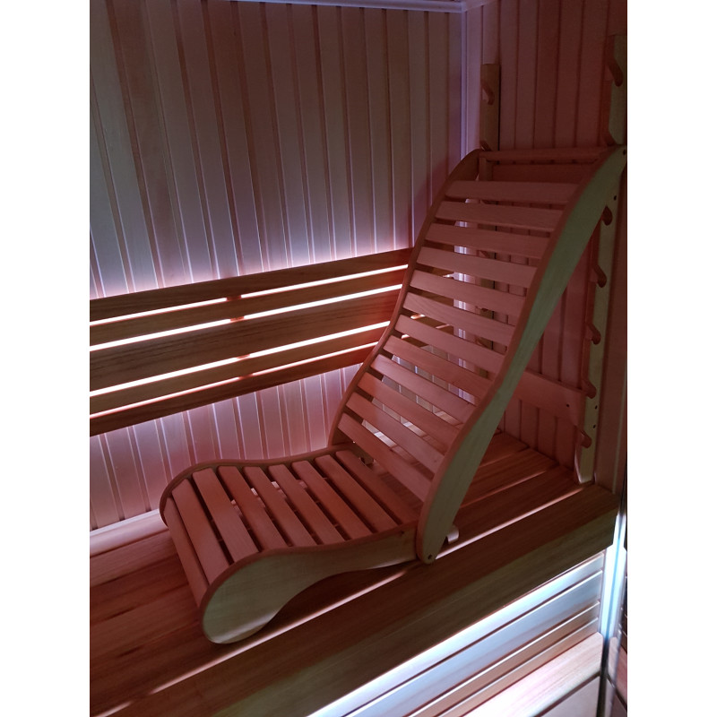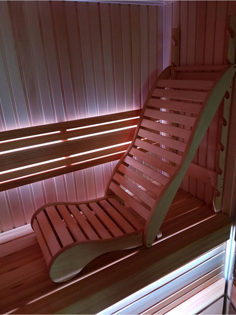 Yläsaunan sängyssä on rentouttava, käsintehty penkki mukavampaa saunassa istumista ja rentoutumista varten. Mukavin asento voidaan valita, sillä tämän rentouttavan saunan lauteen korkeutta ja asentoa voidaan säätää. Tyylikäs muotoilu tuo saunaan lisämukavuutta.