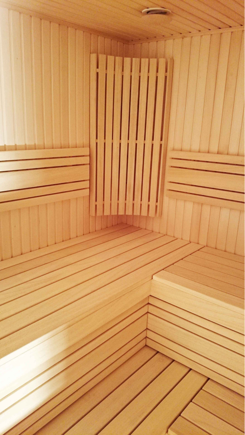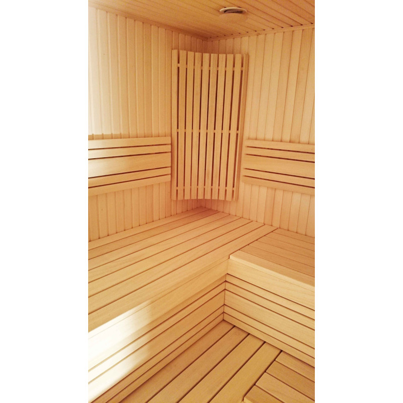 Saunaan asennettu valaisin kestää kosteutta ja lämpöä, se on peitetty kalkkipuusta valmistetulla kulmasuojuksella. Varustettu ilmanvaihtojärjestelmällä. Seinään asennettava sähkölämmitin Harvia Topclass Combi KV90SE automaattisella höyrystimen veden täyttöllä. Toimii erillisellä Harvia Grifin Combi -ohjauspaneelilla.