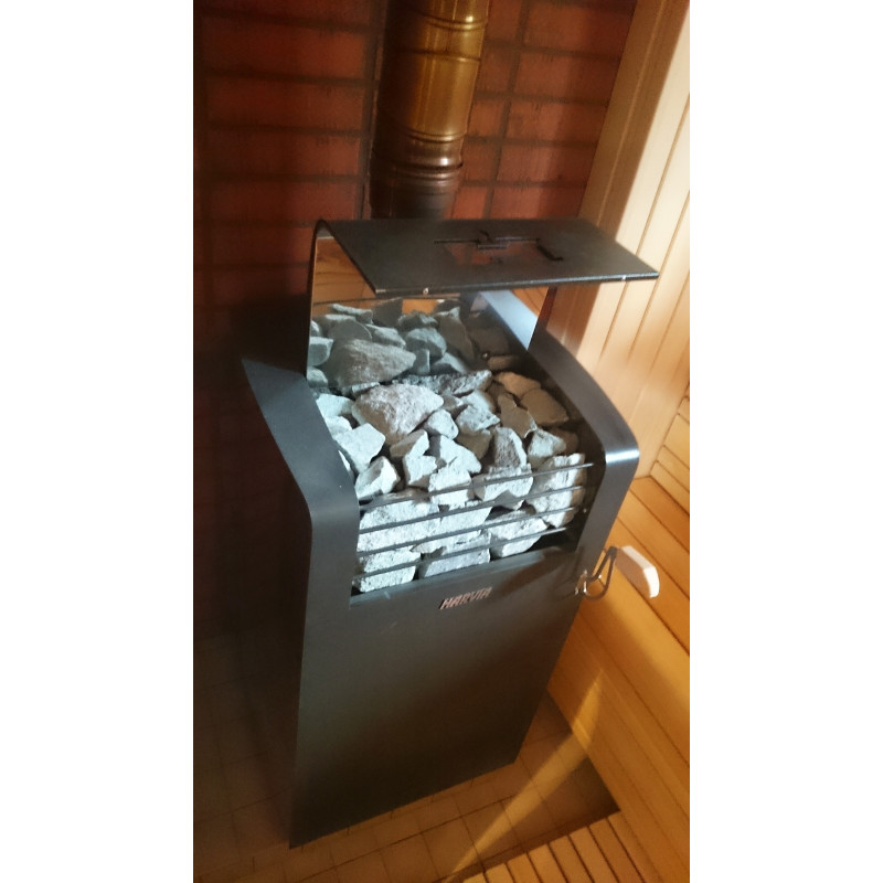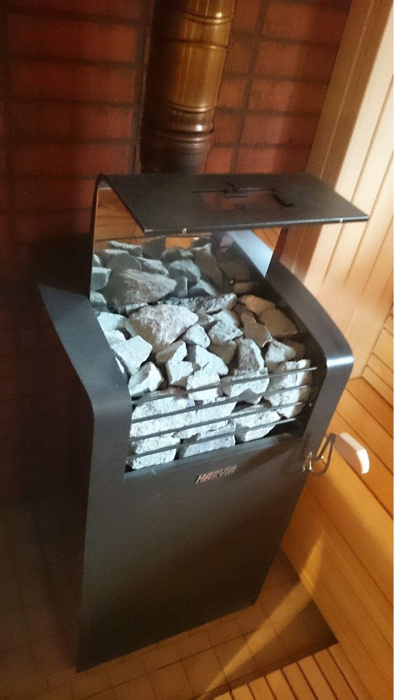 Saunassa on tuuletus varmistaakseen kunnollisen ilmankierron ja savupiippu kiukaan kanssa. Kiuasmalli on suljettu tyyppi, joka kerää lämpöä ja antaa paljon höyryä. Lämmityksen aikana kansi suljetaan ja kaadetaan vettä kivien päälle - se avataan.