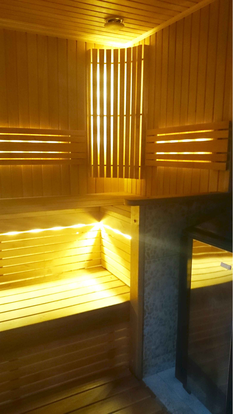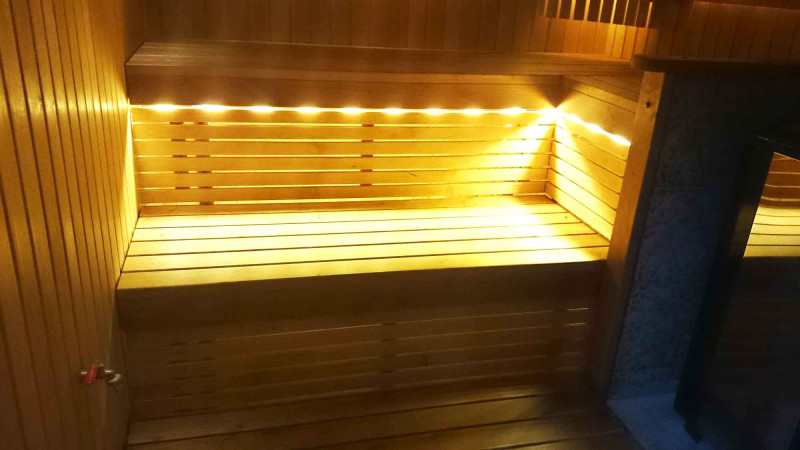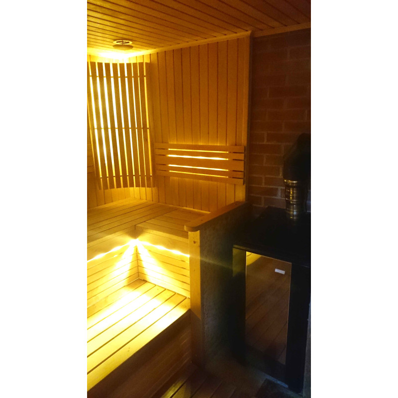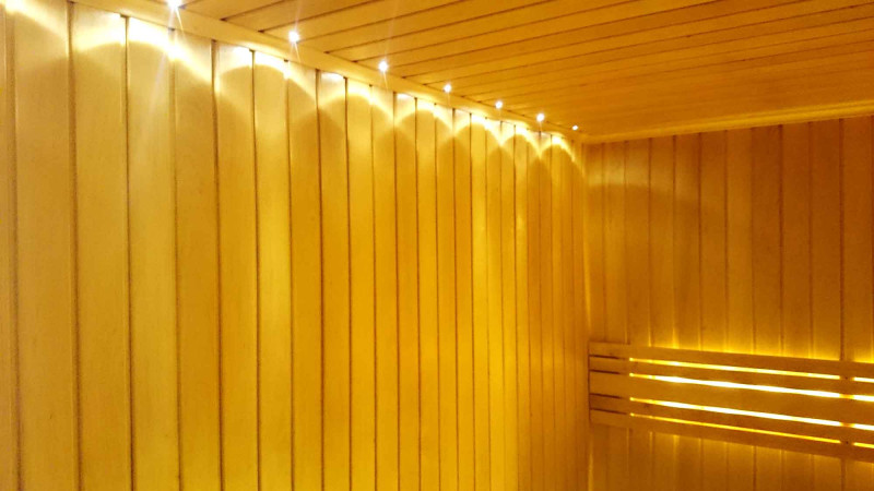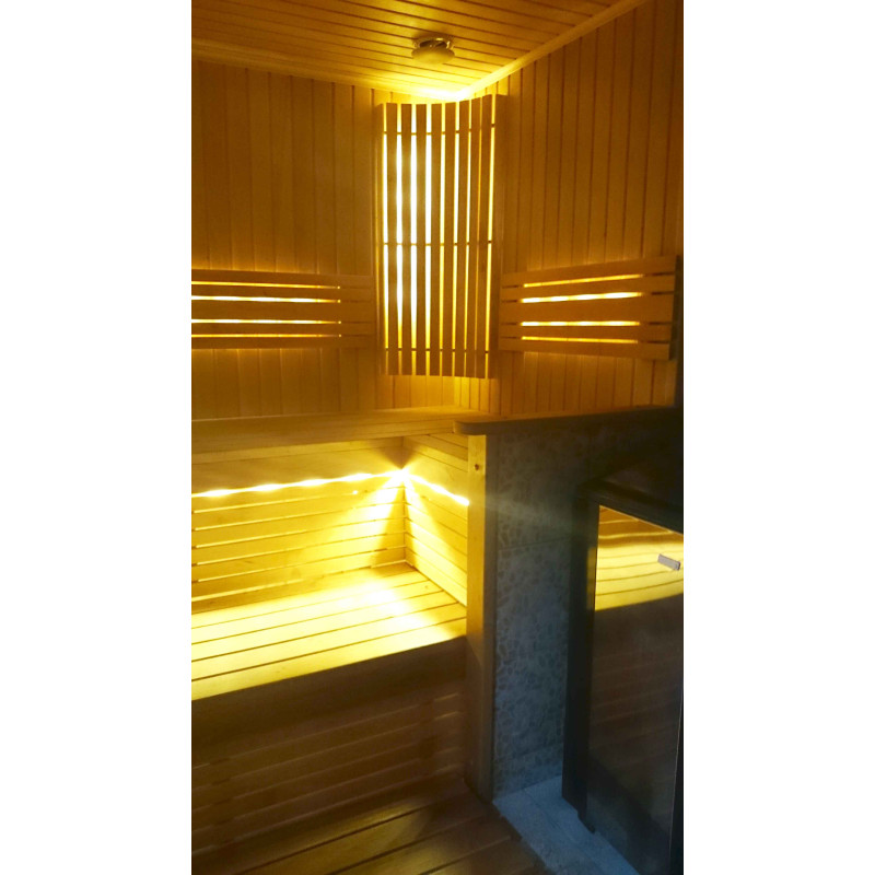 Saunan valaistus on erittäin tärkeä elementti, koska se on valaistus, joka on osa saunan rentouttavaa vaikutusta. Tässä saunassa on LED-valot kattoon, lepotuoleihin ja selkänojaan. Valaisimet kestävät kosteutta ja korkeita lämpötiloja.