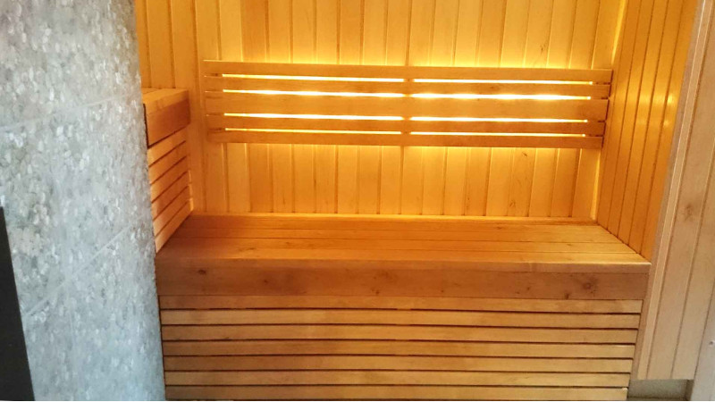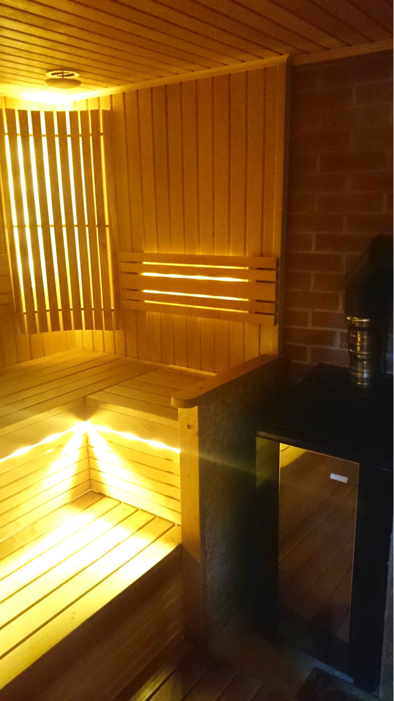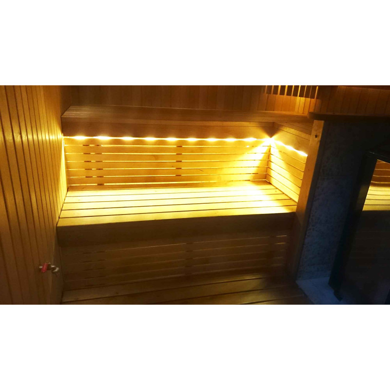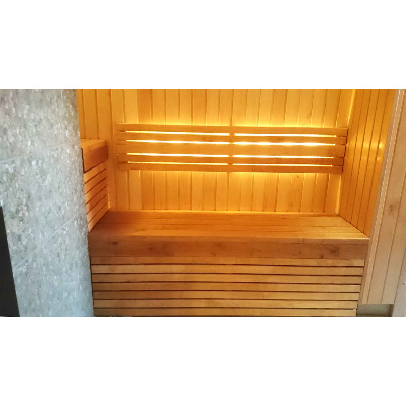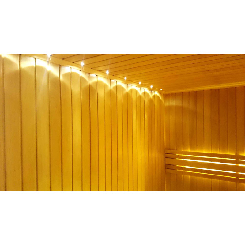 Saunan valaistus on erittäin tärkeä elementti, koska se on valaistus, joka on osa saunan rentouttavaa vaikutusta. Tässä saunassa on LED-valot kattoon, lepotuoleihin ja selkänojaan. Valaisimet kestävät kosteutta ja korkeita lämpötiloja.