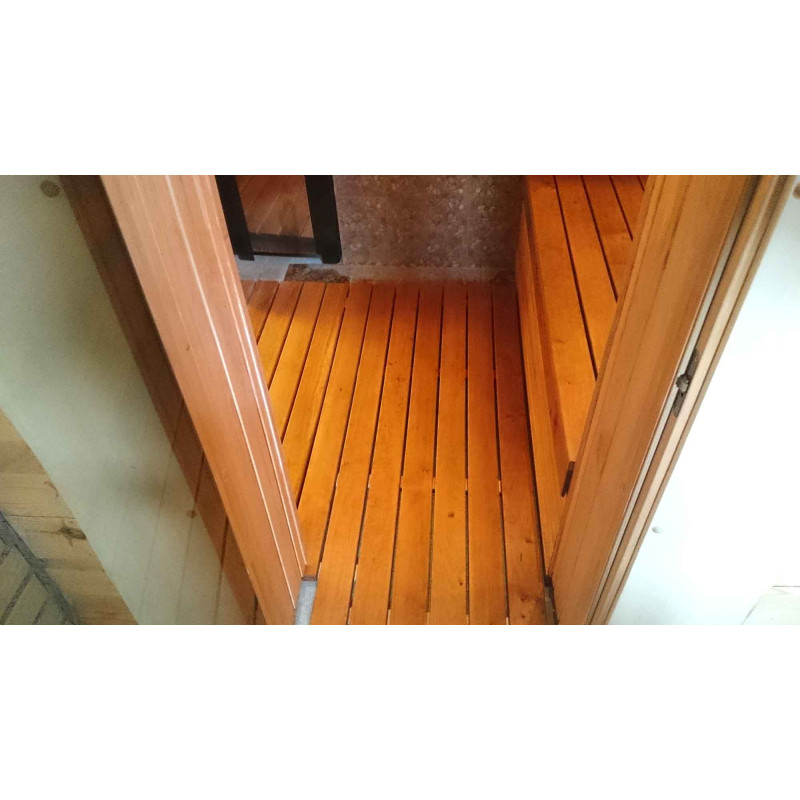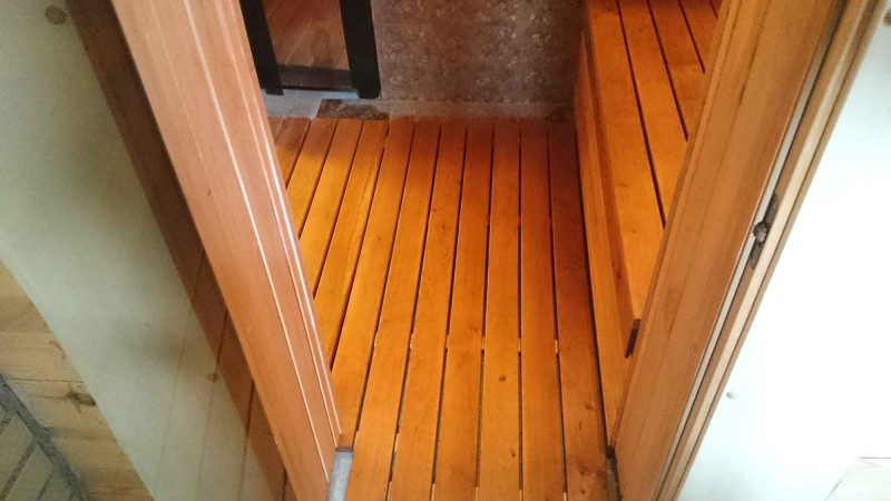 Saunassa on intensiiviseen käyttöön soveltuva kiuas - Narvi Steam Master. Tehokas laite kestää jopa 100 kg kiviä. Tämä suljettu tyyppinen lämmitin kerää lämpöä ja tuottaa paljon höyryä. Lämpö kerääntyy suljetun kannen alle suuriksi kivimääriksi. Näin sauna ei ylikuumene eikä ilma kuivu. Vesi kaadetaan kivien päälle avaamalla kansi.