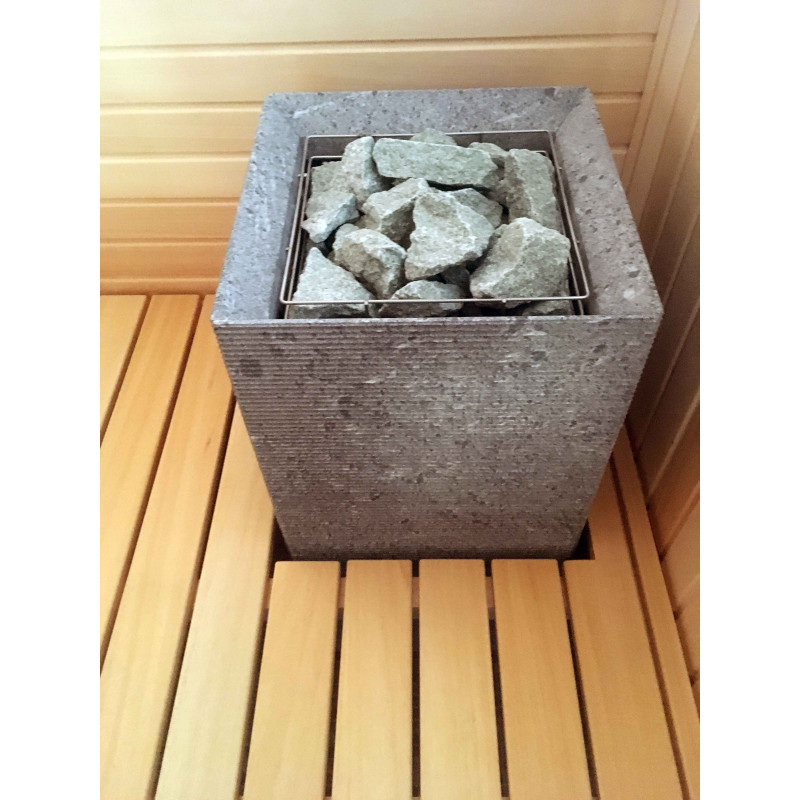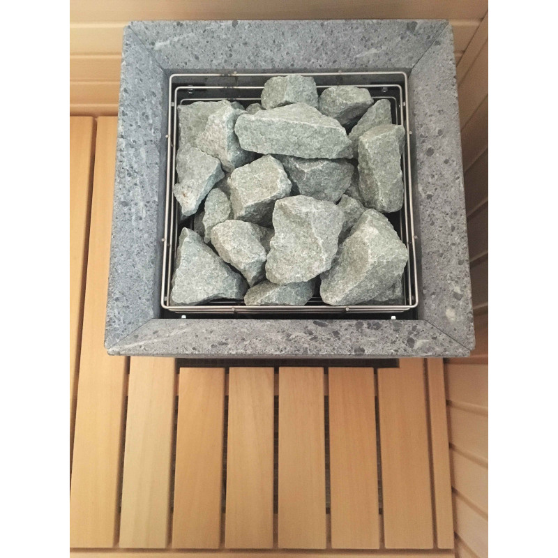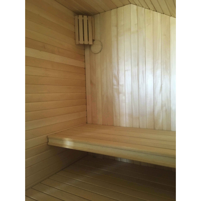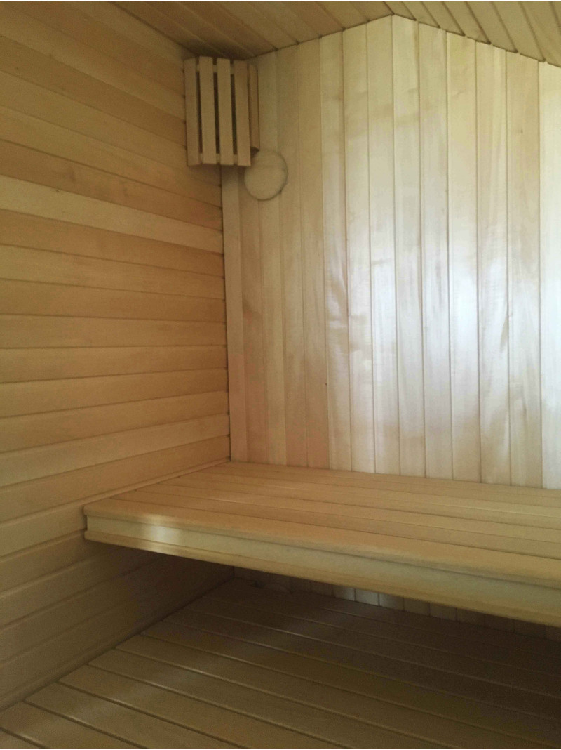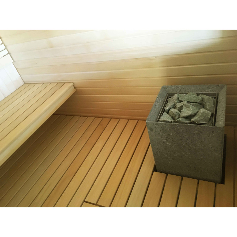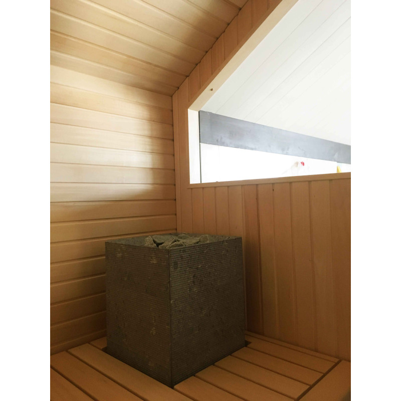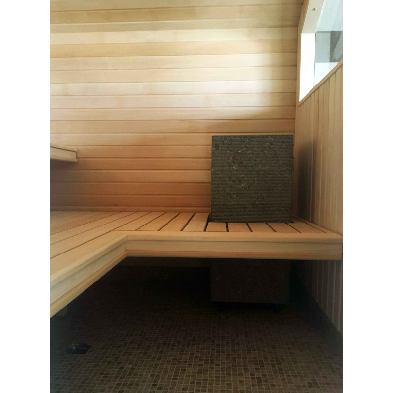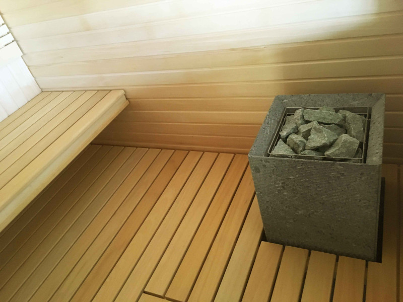 Saunan seinät ja katot ovat lehmuspuuta. Lehmusvuoraus antaa saunaan lisää valoa ja tuoksuu miellyttävälle puulle. Kiukaan ympärillä oleviin lauteisiin, selkänojiin ja aitaan valittiin laadukas abachi-puupaneeli. Tämä pehmeä ja lämmittämätön puu on loistava valinta penkkeihin, tuentaan, jossa puu koskettaa ihoa polttamatta sitä. Tämä takaa mukavuuden ja hyvän levon saunassa. Penkit, tuet ja seinät on lakattu, täysin valmis pitkäaikaiseen käyttöön.