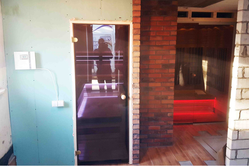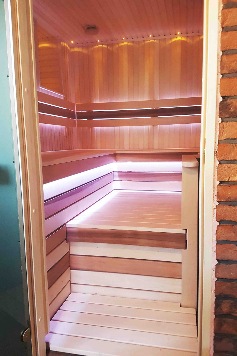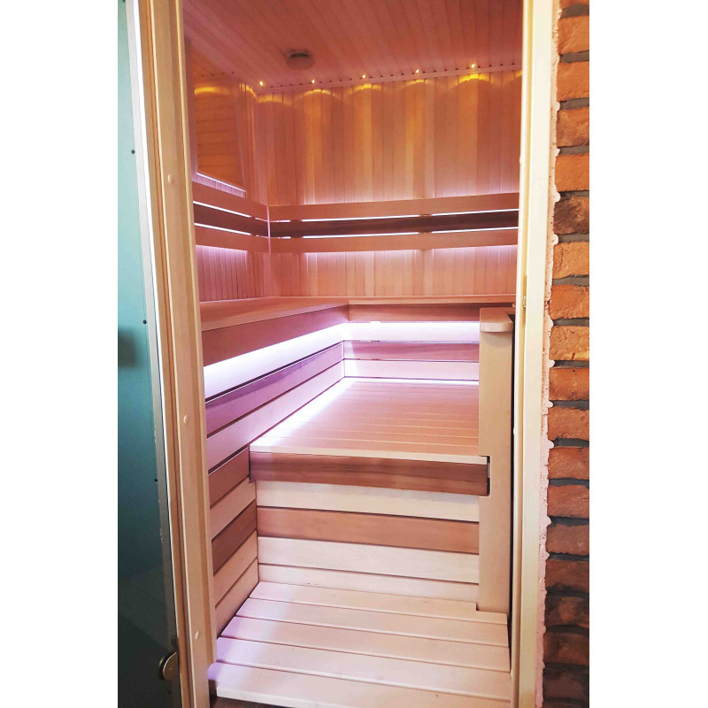 Kosteutta ja lämpöä kestävä saunavalaistus - LED "Sun" asennettu. Lepotuoleissa ja selkänojissa - värillinen RGB-valaistus, jota ohjataan etävärinvaihtajalla.