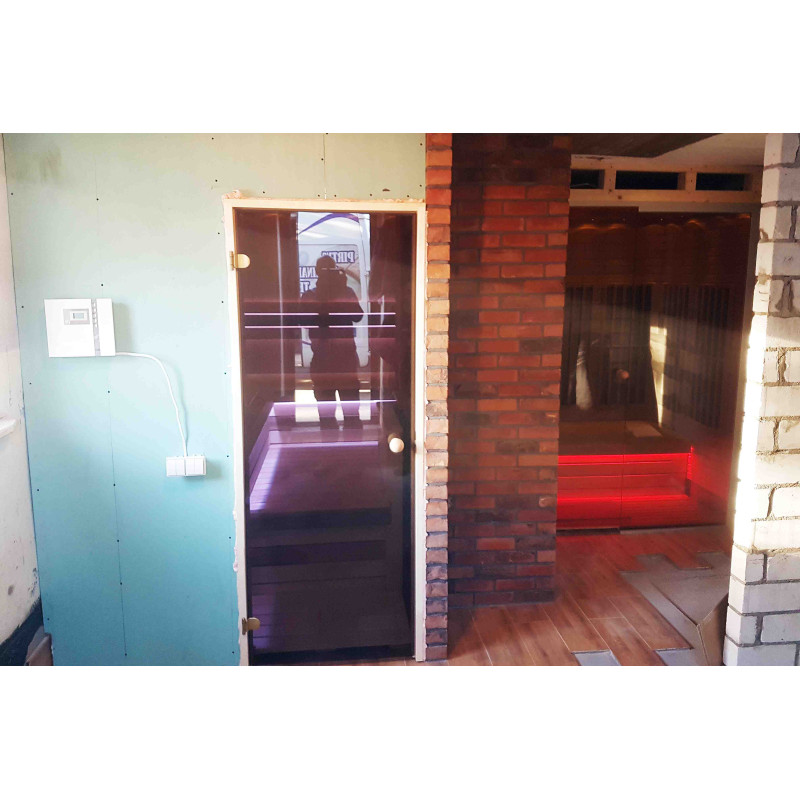 Saunan ovi 80 x 200 cm, liimattu kovapuurunko, sävytetty karkaistu lasi.