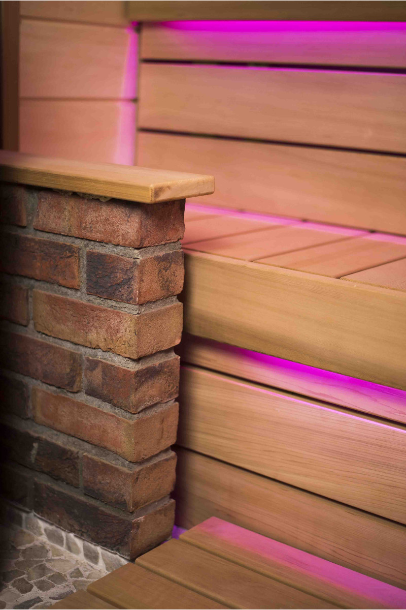 Saunan sisustukseen valitaan klinkkeritiilet, joissa on sisäänrakennettu valaistus.