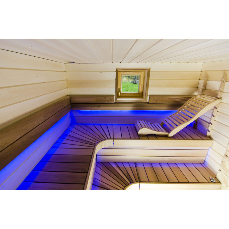 Varustettu värillisellä RGB-valaistuksella, jota ohjataan langattomalla värinvaihtajalla, jonka avulla voit helposti muuttaa valaistuksen väriä halutun saunatunnelman mukaan.