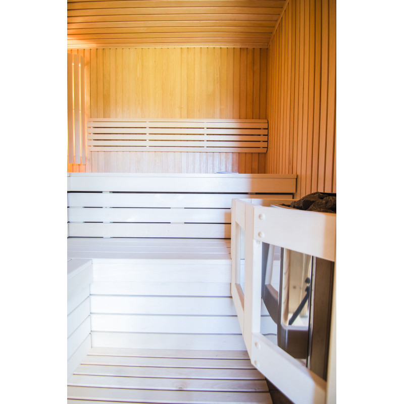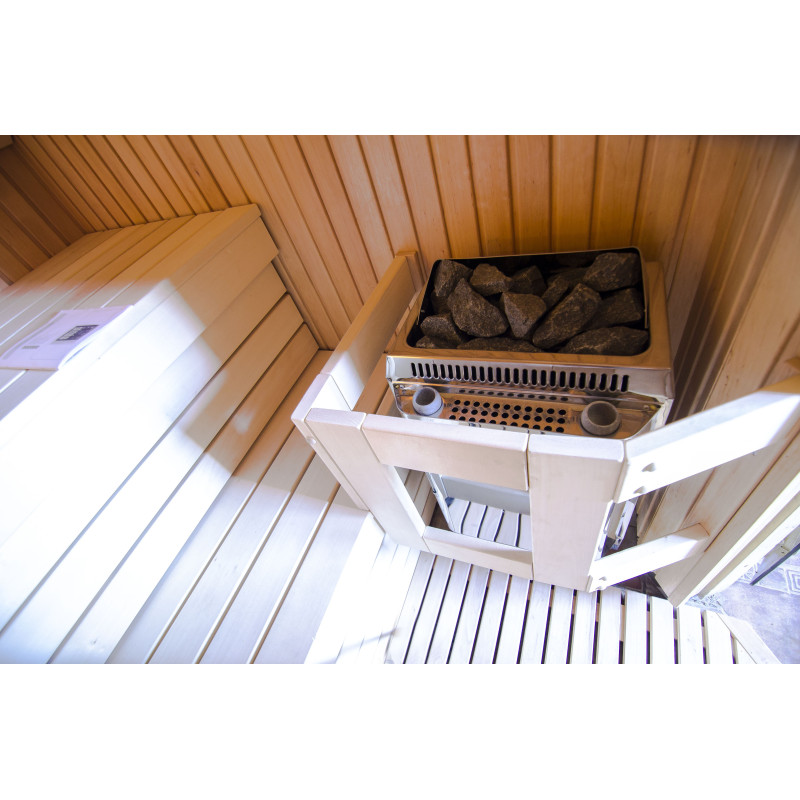 Kiukaan ympärille on asennettu suoja-aita estämään tahaton kosketus kuumaan lämmittimeen.