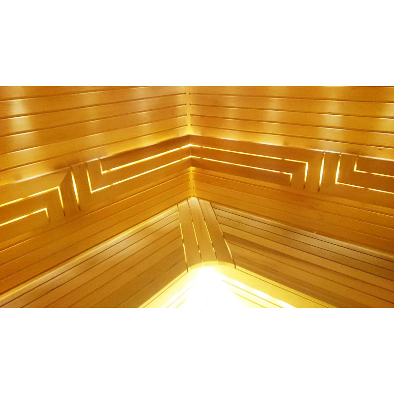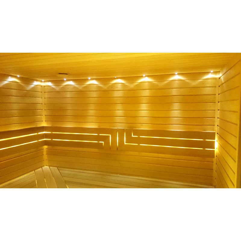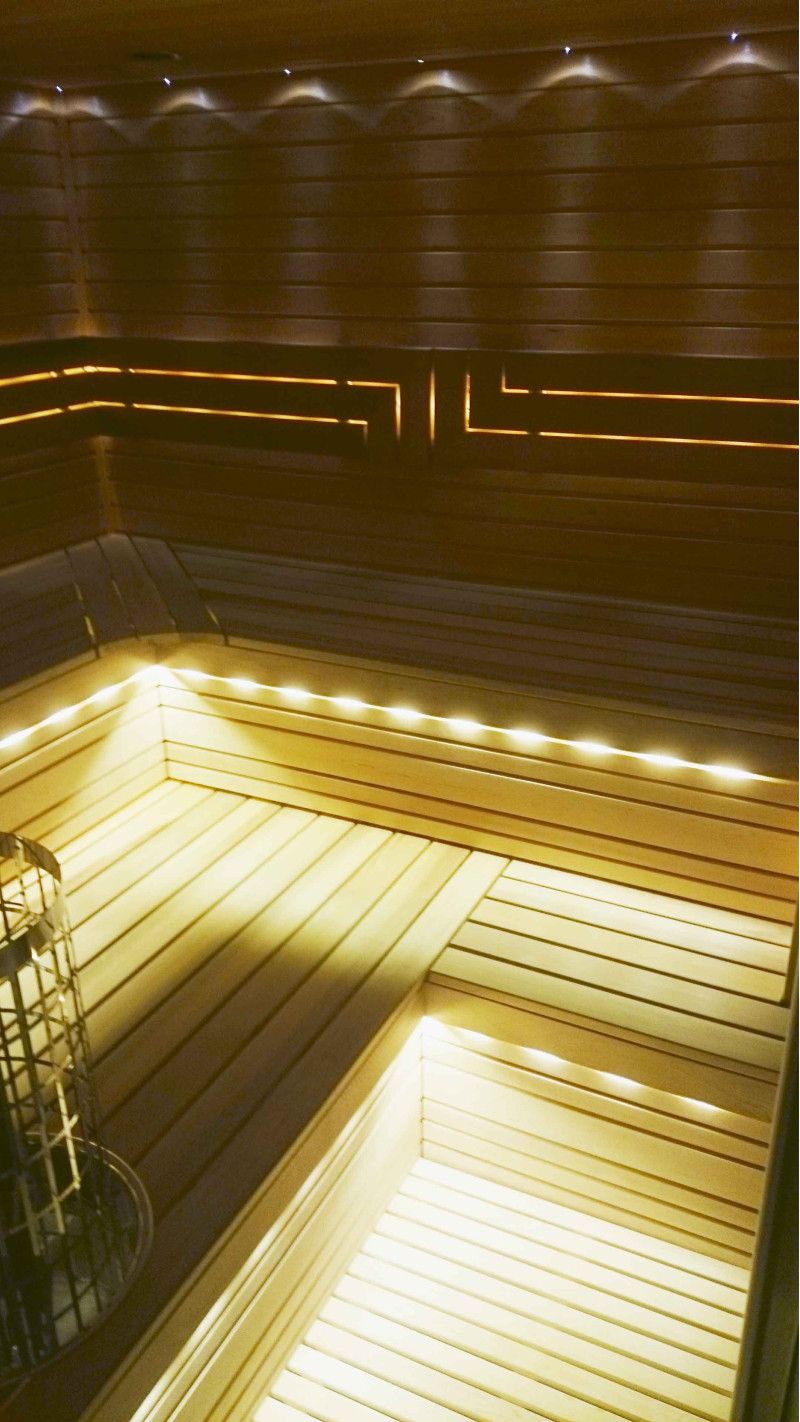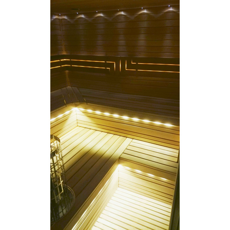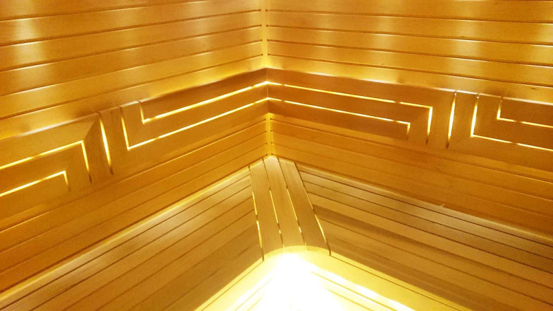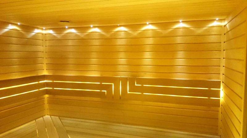 Katossa on eksklusiivinen LED-valaistus "Sun", LED-valaistuslistat on asennettu penkkien ja selkänojien alle, lämmin valkoinen väri. Valaistuksen ansiosta saadaan osa saunan rentouttavasta vaikutuksesta.
