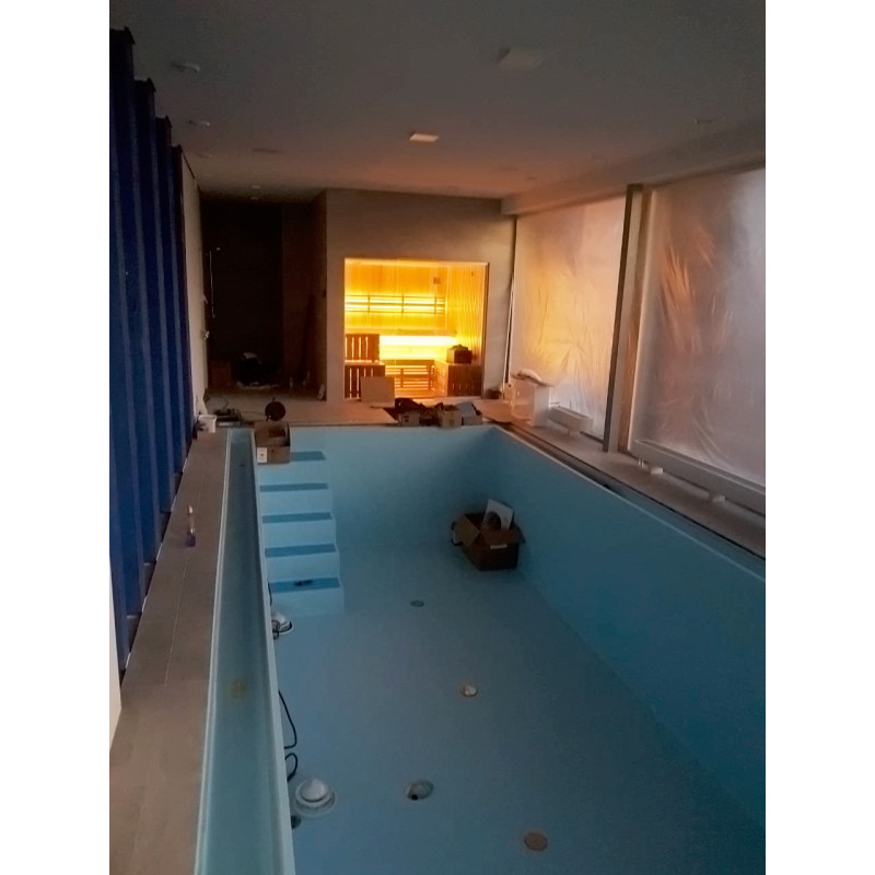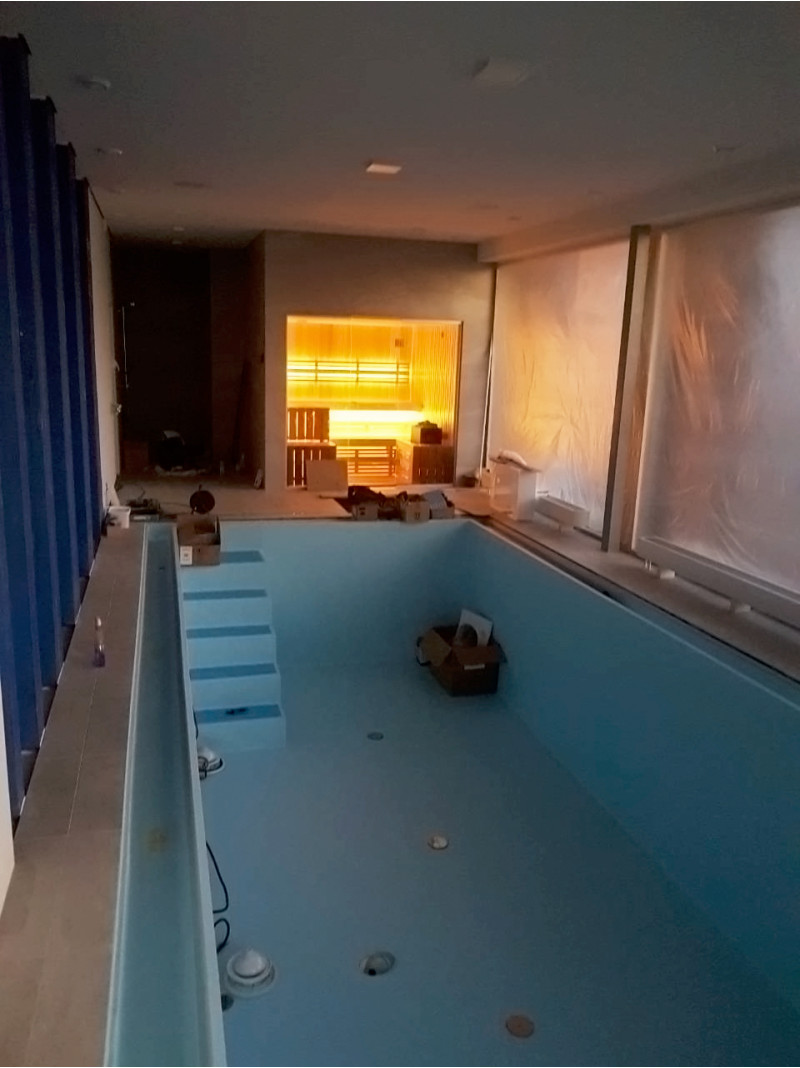 Lasivitriinin asennus - sävytetty 8 mm karkaistu lasi alumiinirungossa. Lasivitriinin ansiosta näkymä uima-allasalueelle avautuu, pieni saunatila laajenee ja sauna saa lisää valoa.