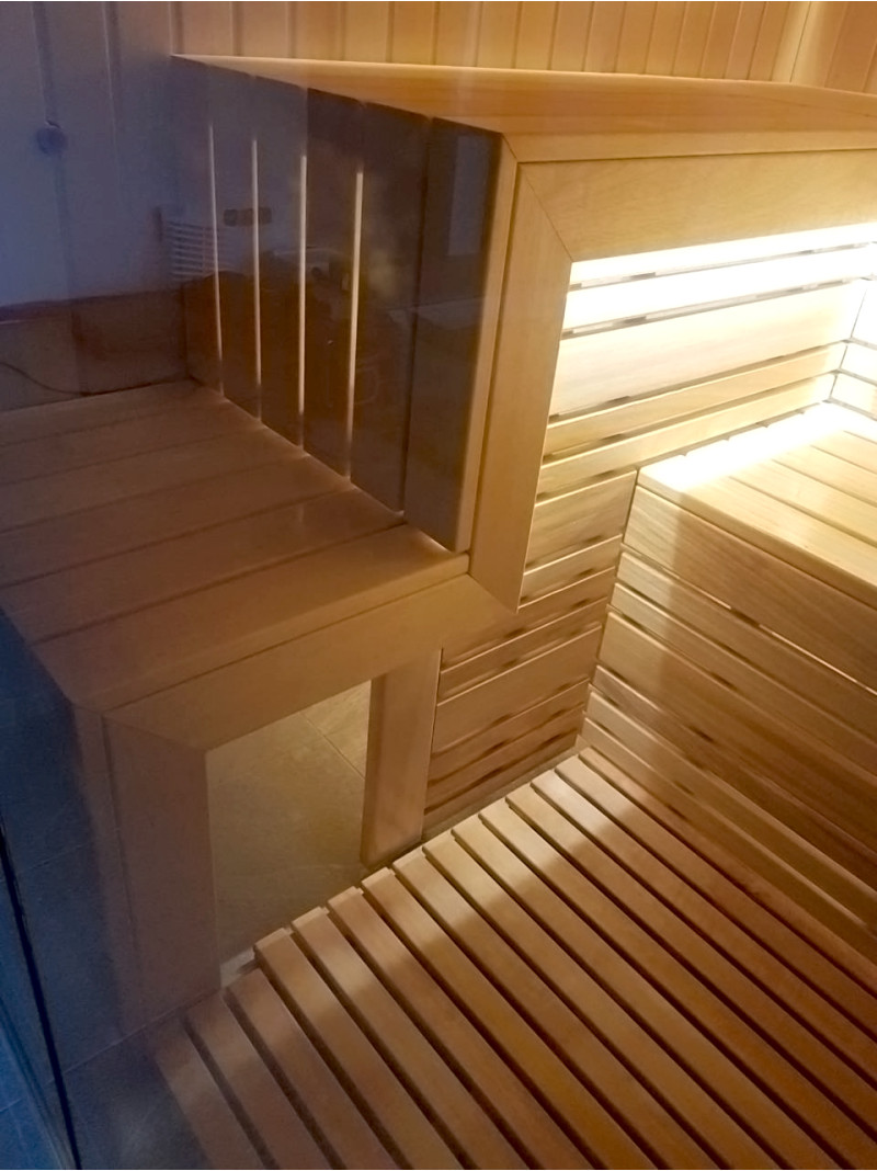 Saunan seinissä ja katossa on käytetty vaaleaa lehmusvuorausta. Nämä sivuraidet säteilevät miellyttävää, luonnollista puun tuoksua, eivät kutistu lämmöstä eivätkä menetä tyylikästä ulkonäköään.